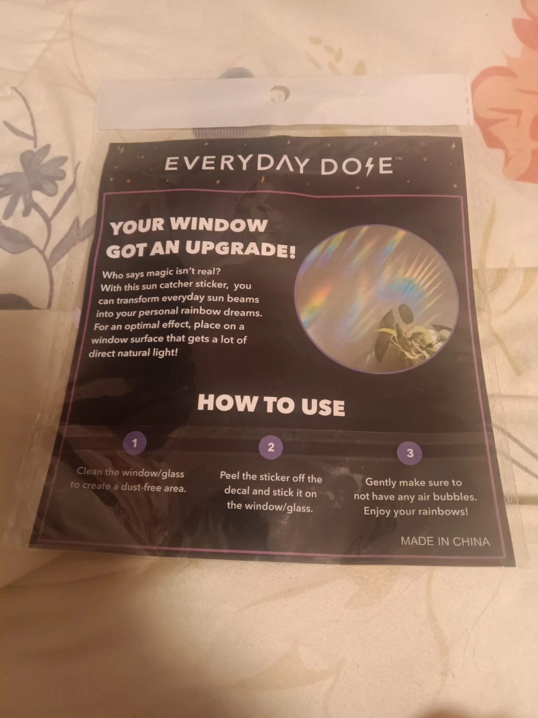 Add some magic to your windows with this sun catcher sticker! It's designed to transform sunbeams into colorful rainbows. Clean the window, peel the sticker, and stick it on a surface that gets direct natural light. Enjoy your rainbows!