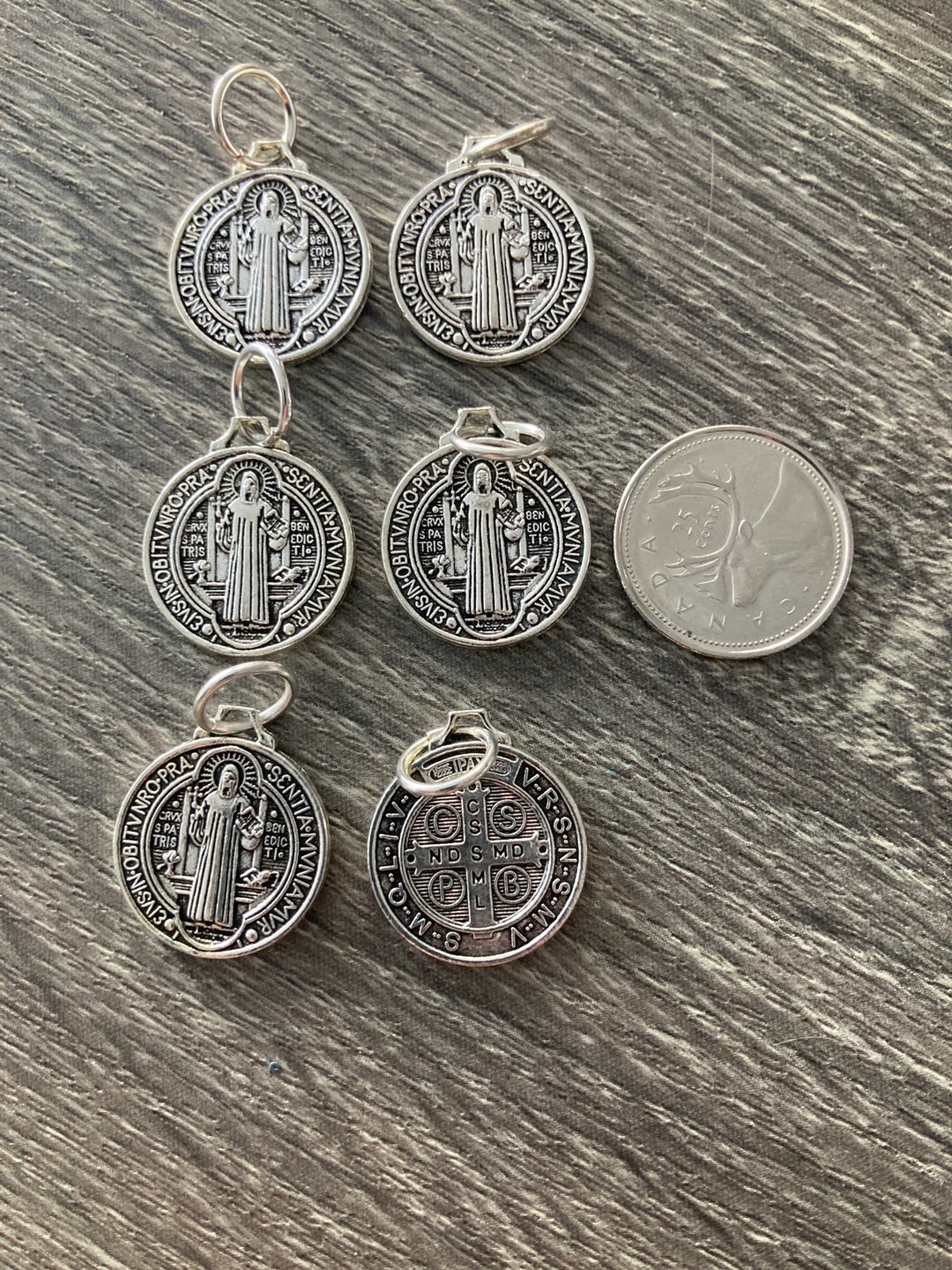 Set of five Saint Benedict medals, often used for protection. Each medal is silver-toned metal. A Canadian quarter is shown for scale reference. These are perfect for personal devotion or gifting to someone seeking spiritual comfort.