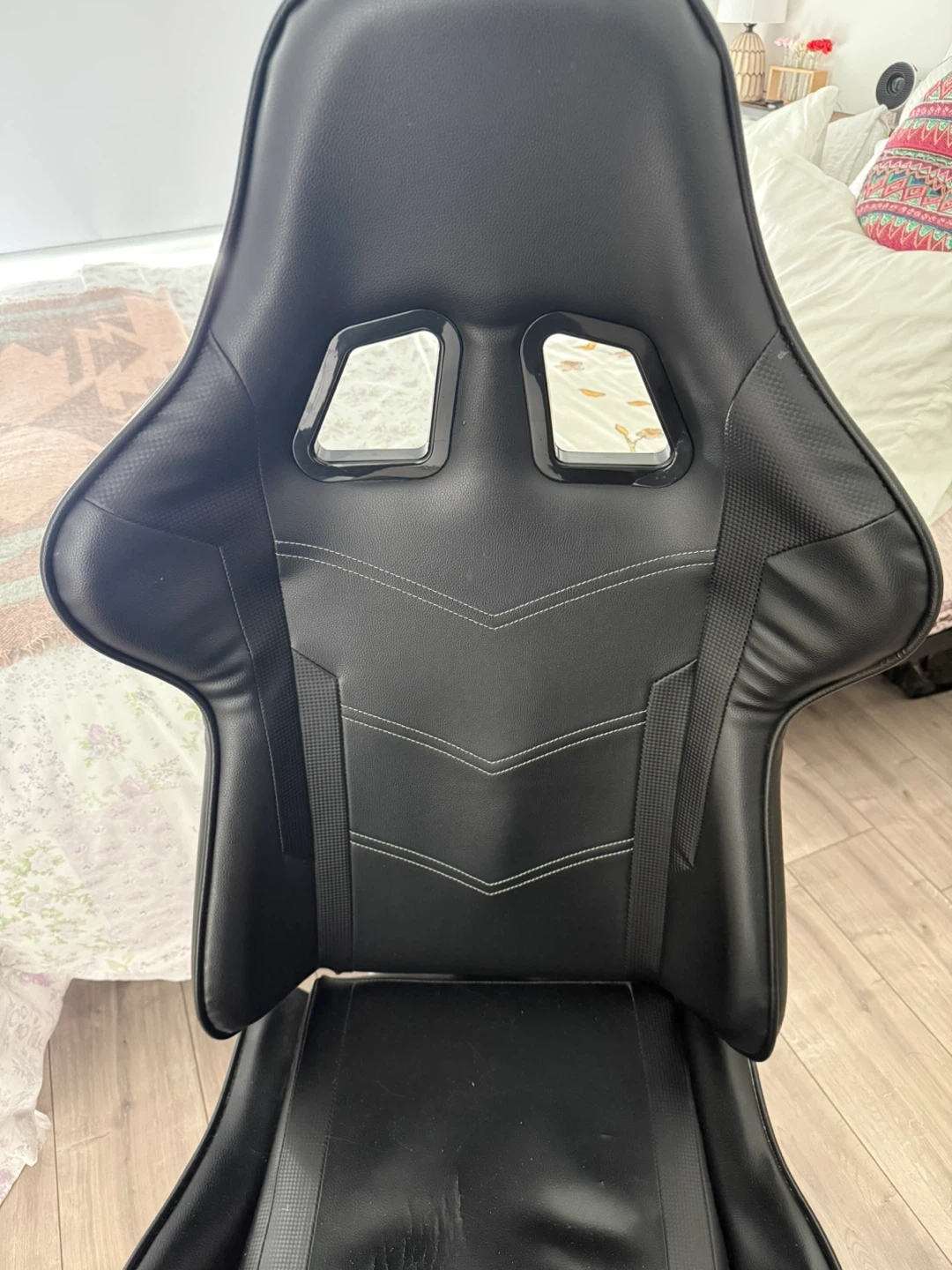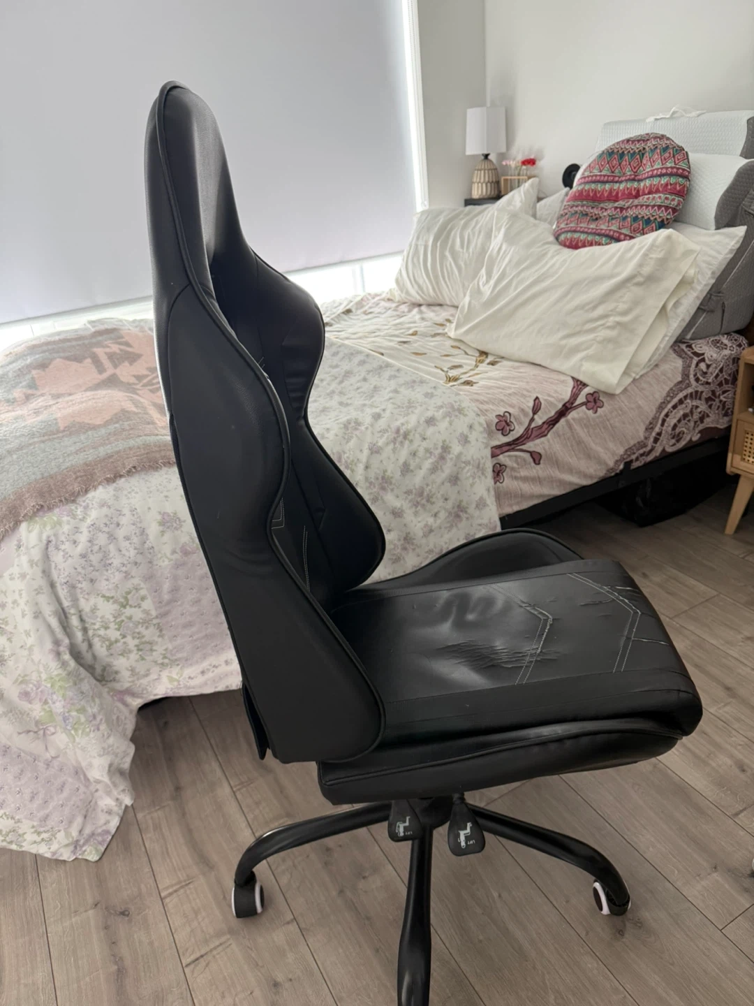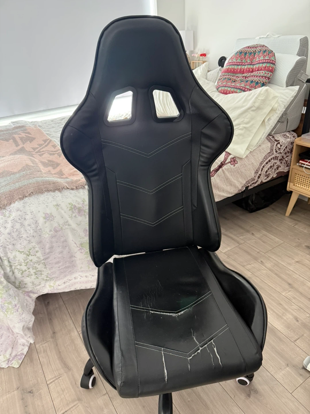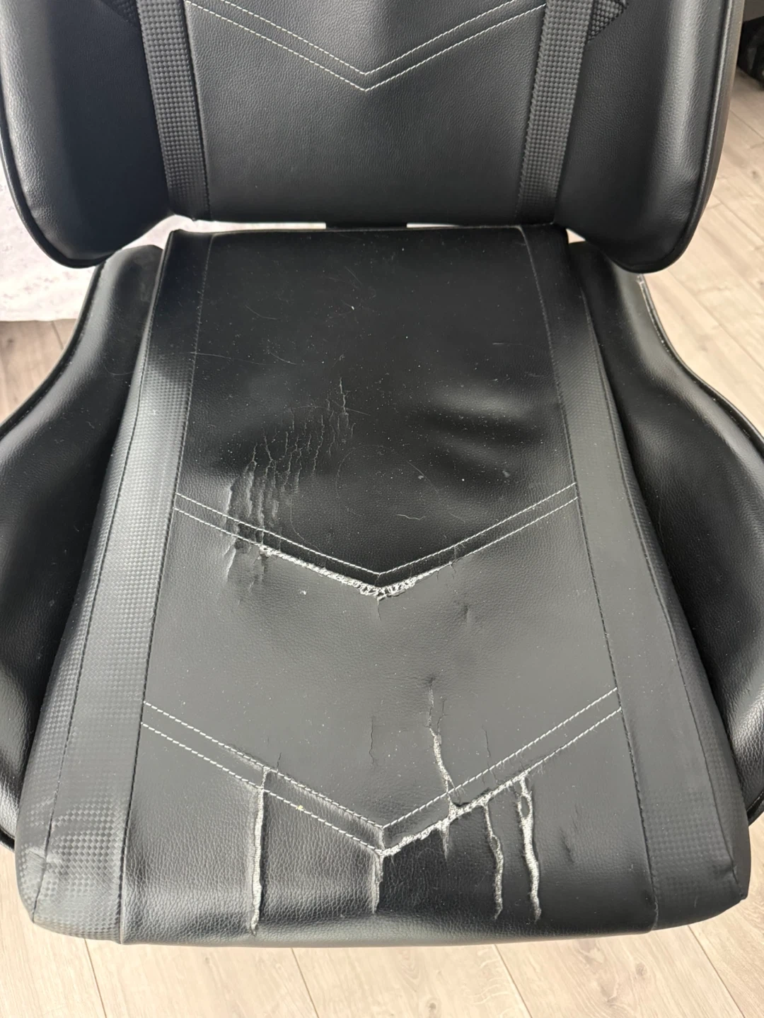 This is a black gaming chair with white stitching. The seat shows signs of wear and tear with some ripping and damage to the material. Perfect for anyone needing a functional chair for gaming or office use.