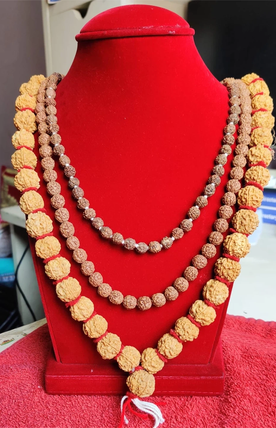 Three strands of Rudraksha mala beads. The largest beads are light brown, and the smaller beads are a darker brown. Red thread is used to string the larger beads. A lovely set for spiritual practice or adornment!