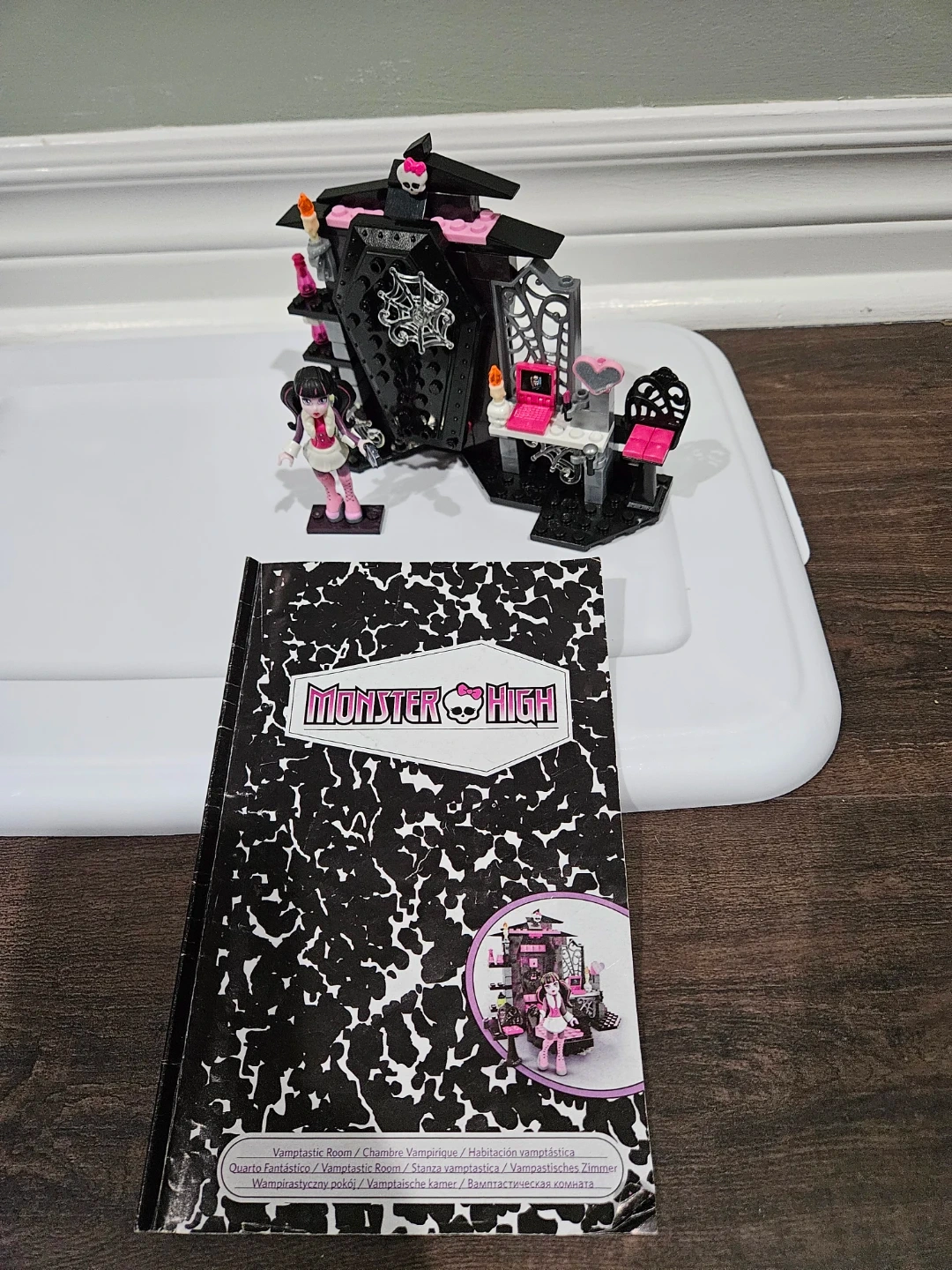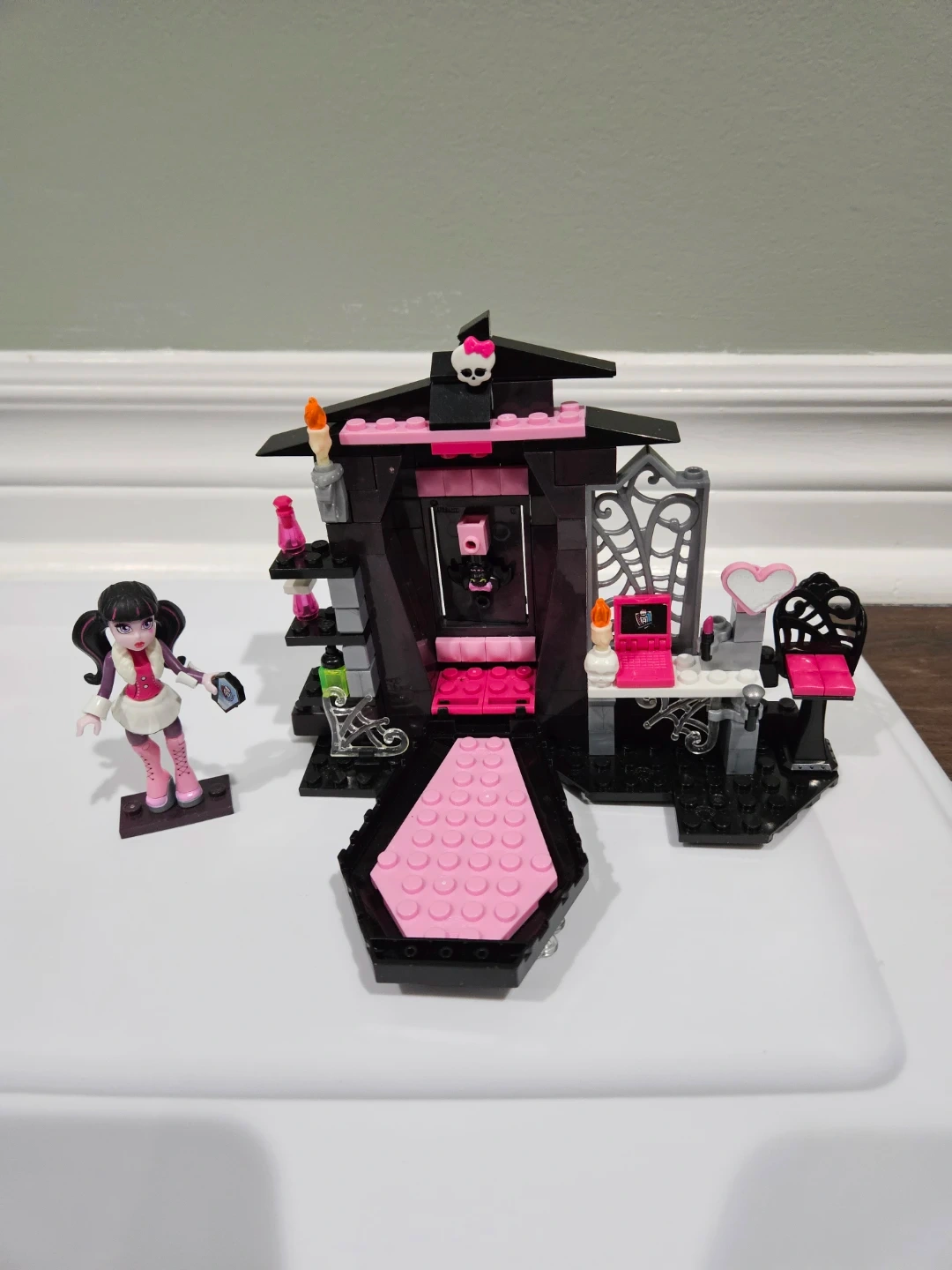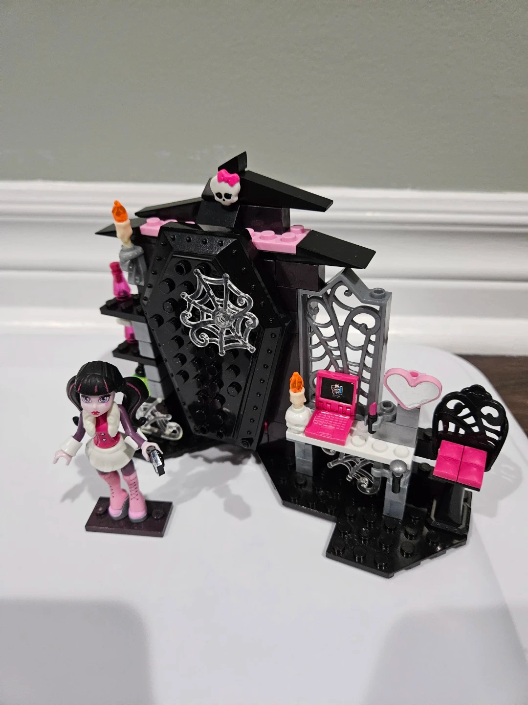 This Monster High building set features the Vamp Ristic Room with a Draculua doll. Includes coffin bed and desk accessories. Perfect for Monster High fans!
