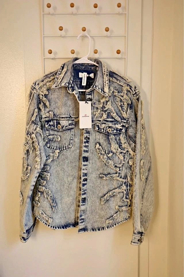New with tags H&M x Glenn Martens denim jacket in light wash blue. This piece features heavy distressed and shredded detailing throughout with a button-up front and two chest pockets. Large Glenn Martens branding is embroidered across the upper back. Material is 100% cotton denim. Size is XS.