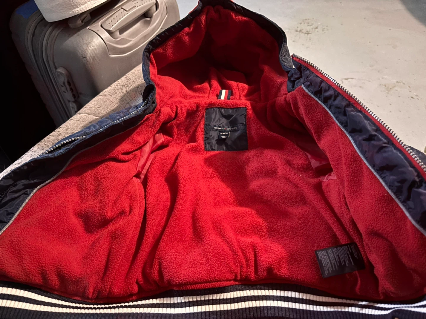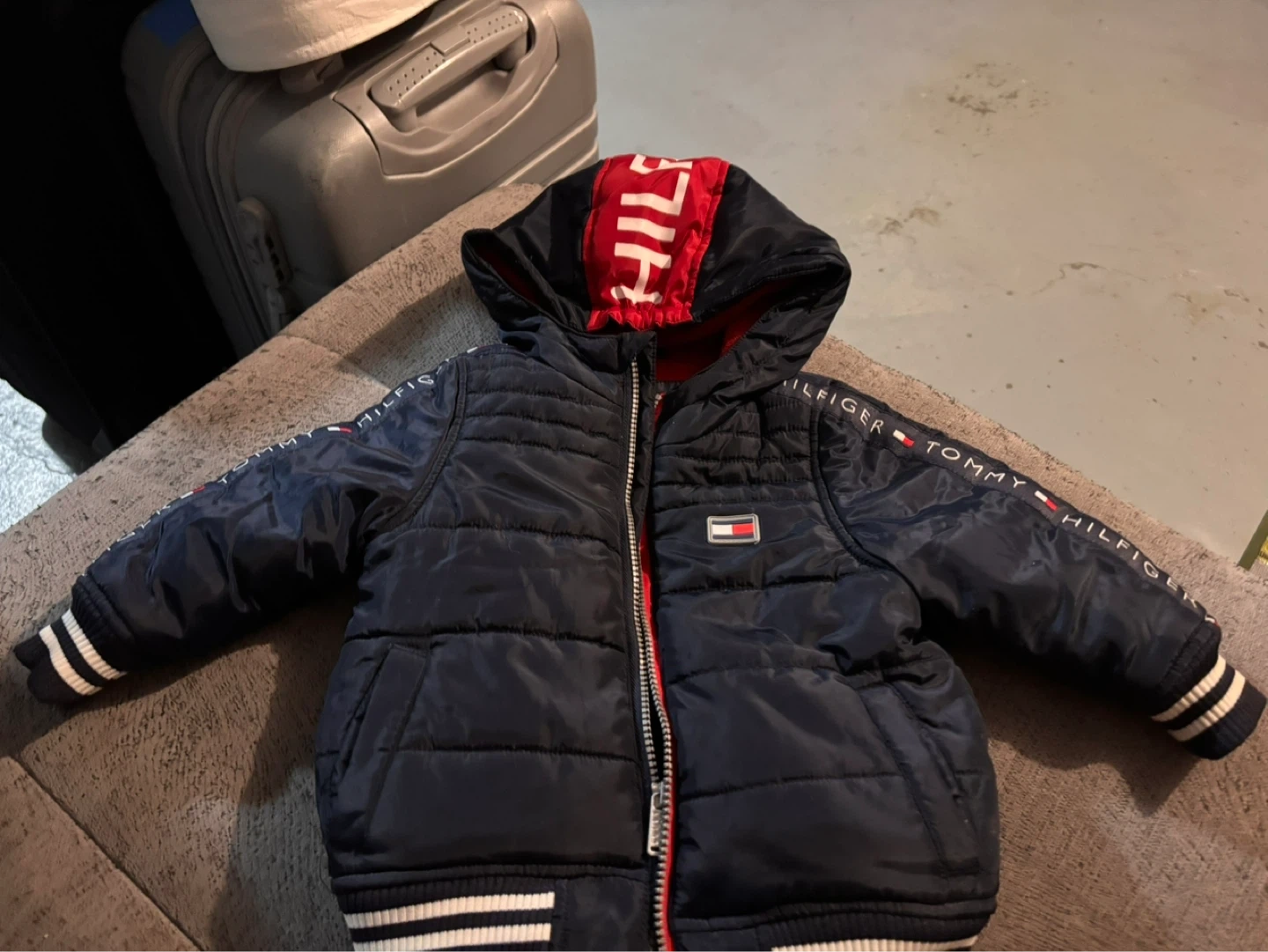 Tommy Hilfiger puffer jacket for babies. Size 18 months. Navy blue with red fleece lining and hood. It's lightweight and perfect for cooler weather!