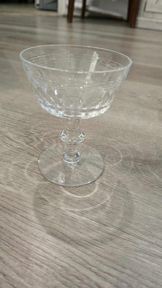 Selling a set of vintage etched crystal glasses, perfect for cocktails or champagne. They have a lovely etched pattern and elegant stem. These are in great condition and would add a touch of class to any gathering.