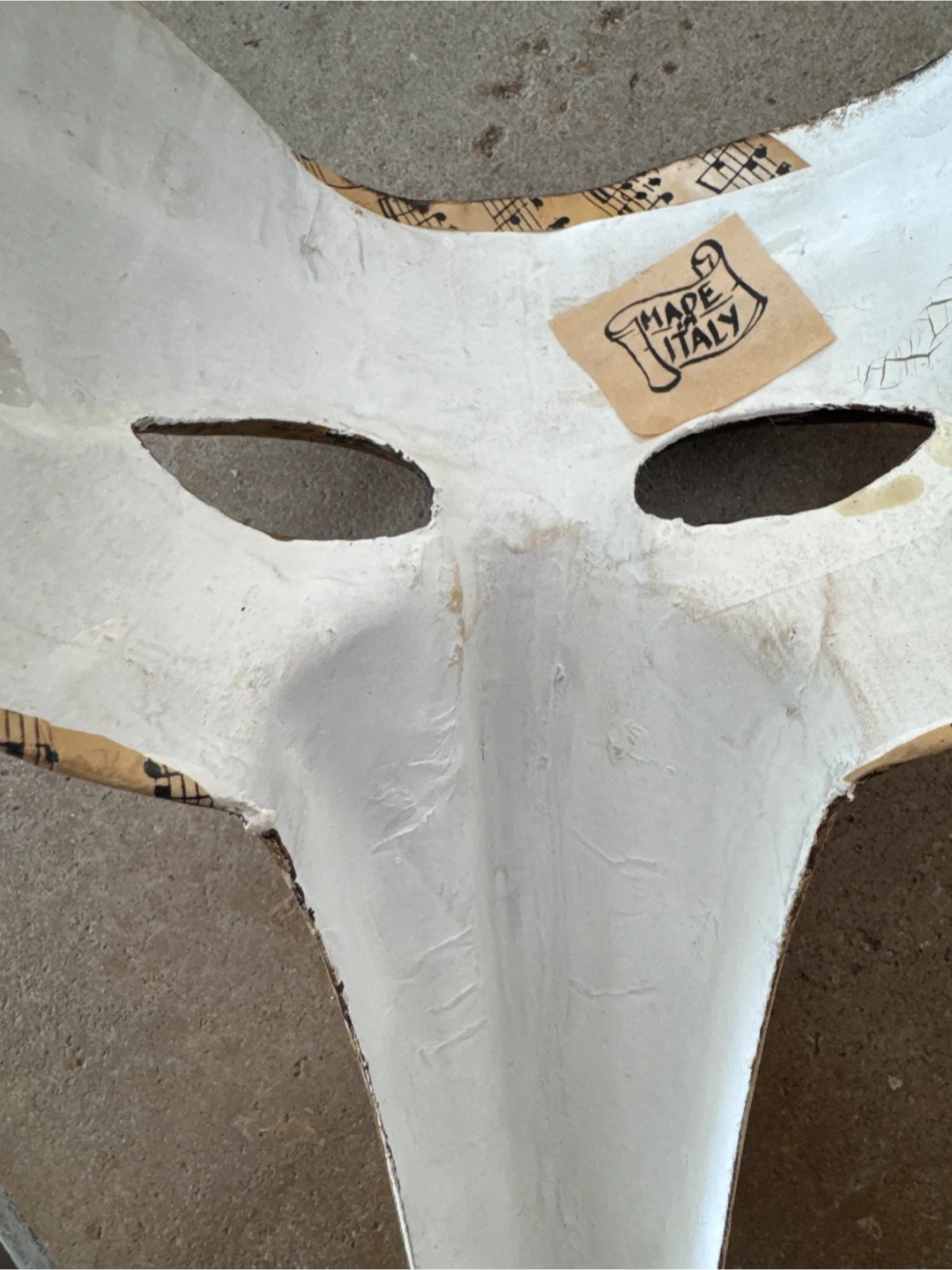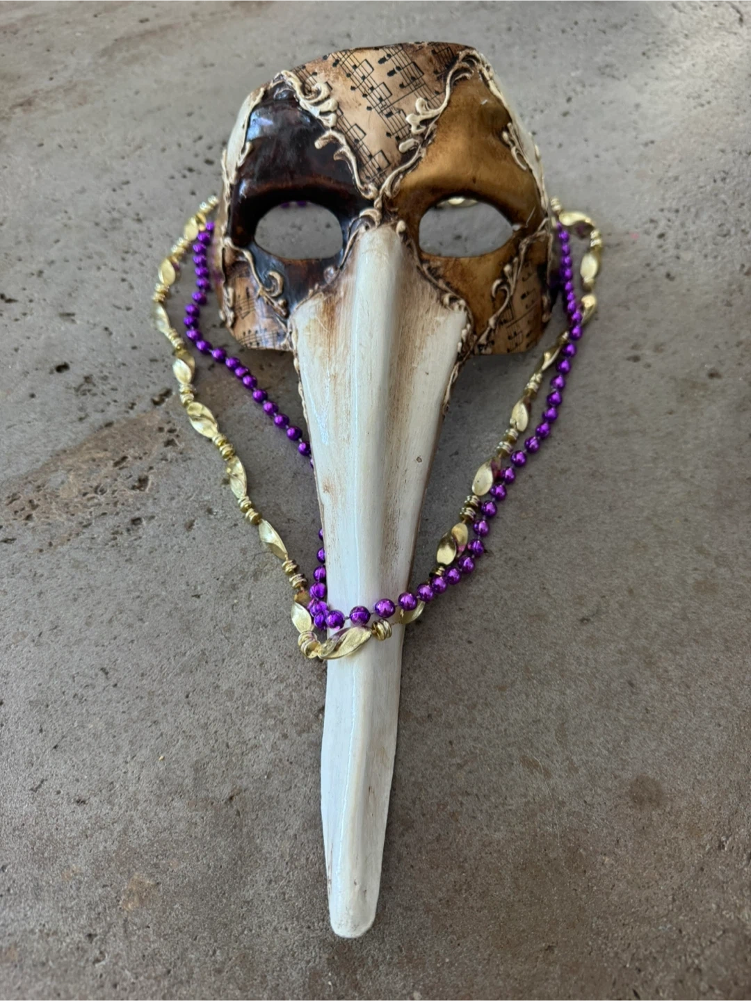 This is a Venetian plague doctor mask, likely for costume or display. It's made in Italy and features musical notes design. Includes purple and gold beaded strings. Makes a nice decorative piece for Mardi Gras. Purchased in New Orleans.