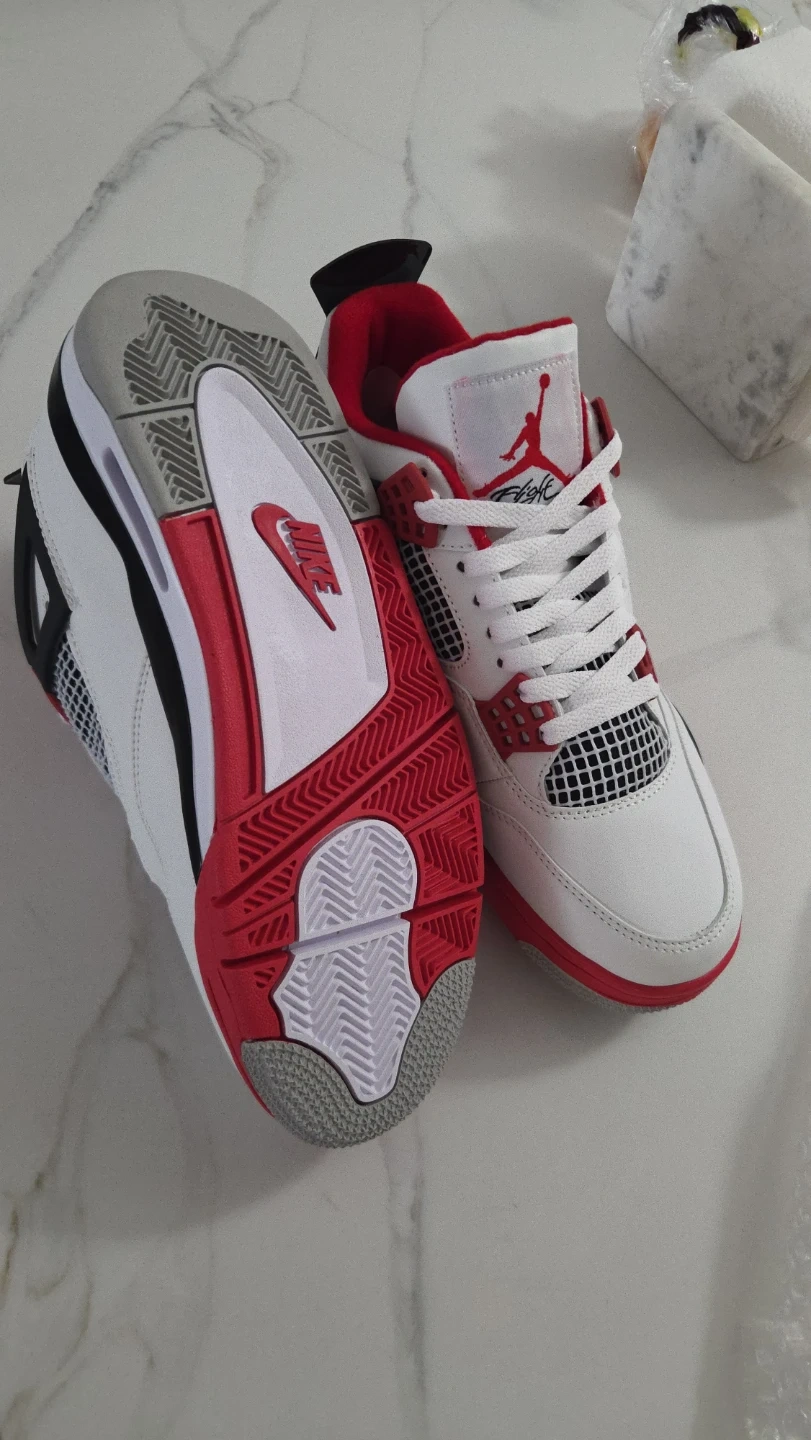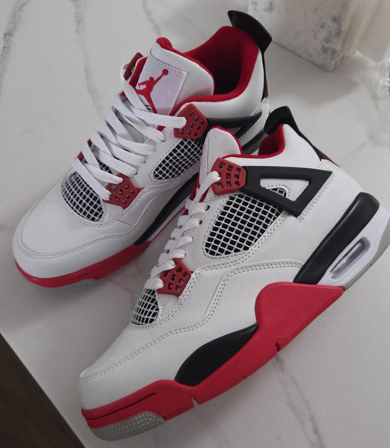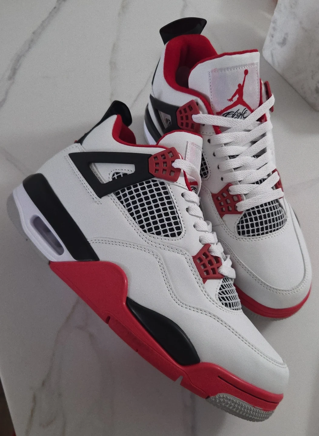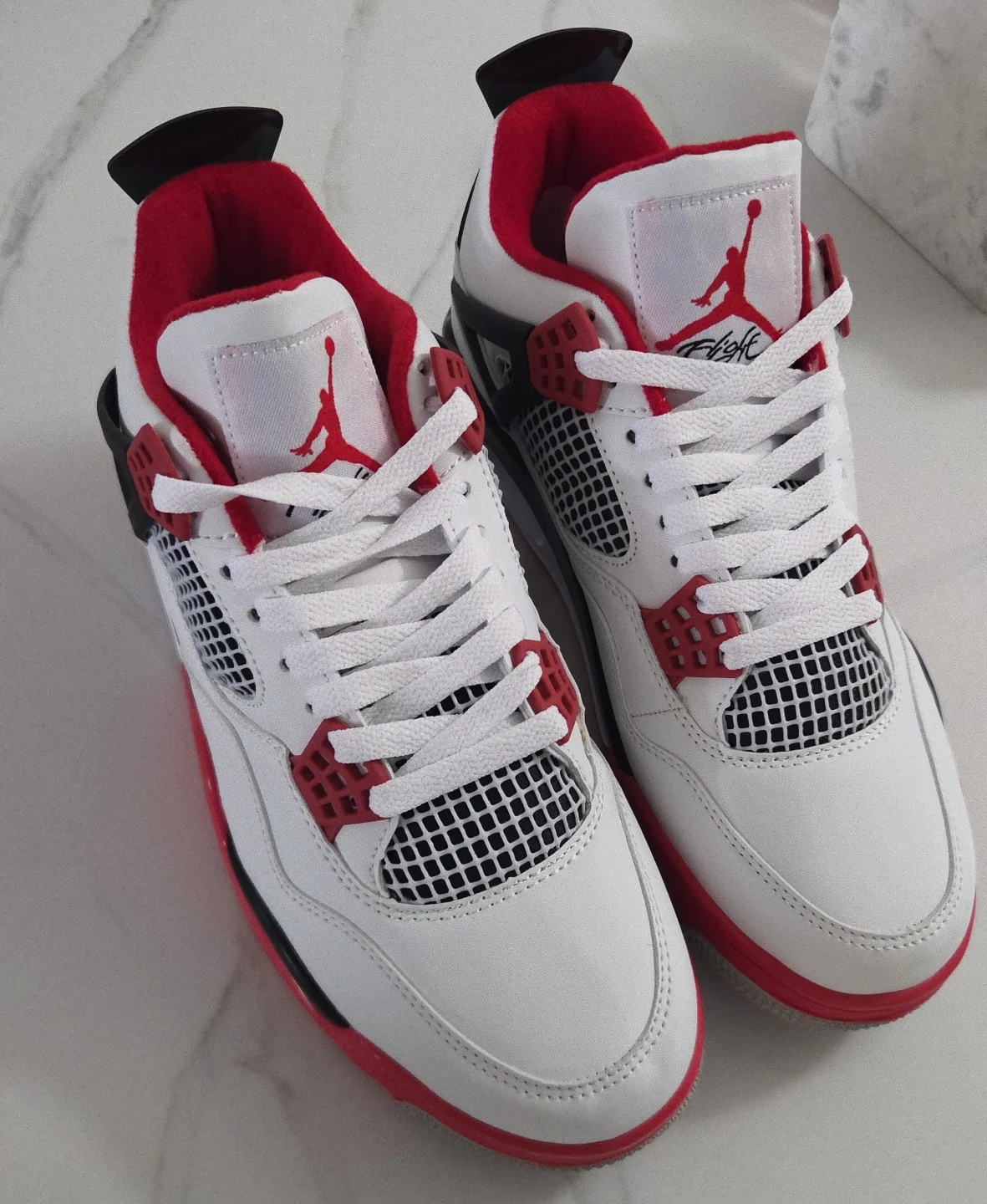 These Air Jordan 4 Retro sneakers feature a white, red, and black colorway. They have a lace-up closure for a secure fit. The classic Jumpman logo is visible on the tongue. Excellent for athletic wear or casual style!