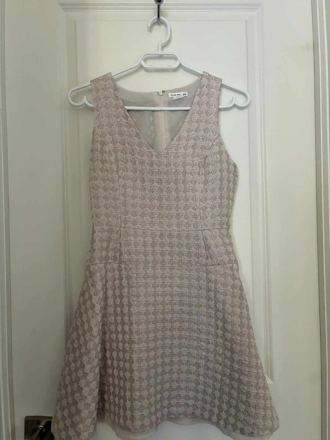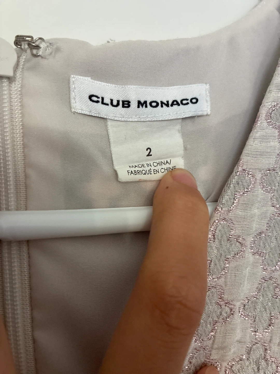 This sleeveless Club Monaco dress features a textured pattern with a hint of shimmer. It's a size 2 and made in China. It's a great dress for special occasions!