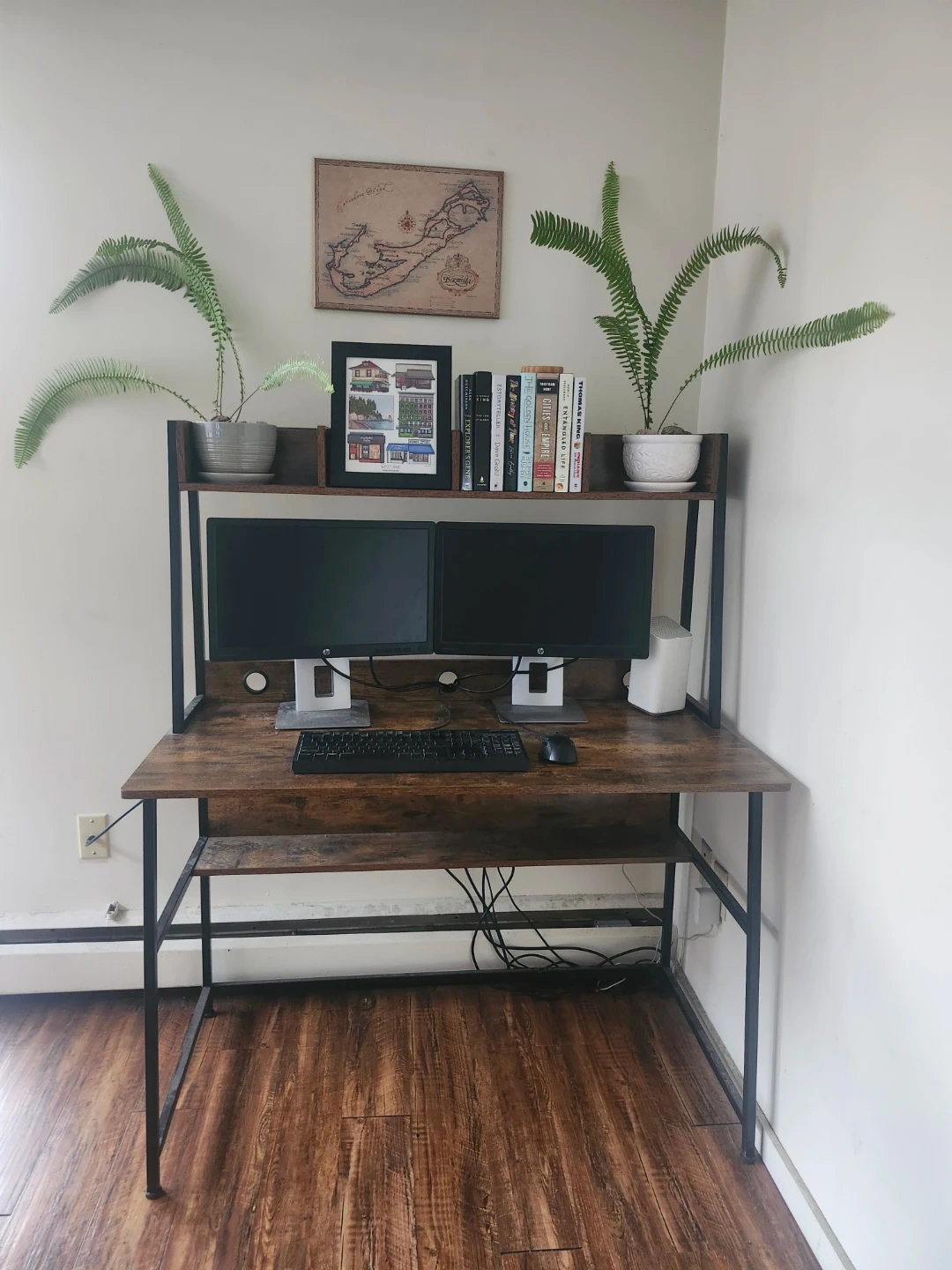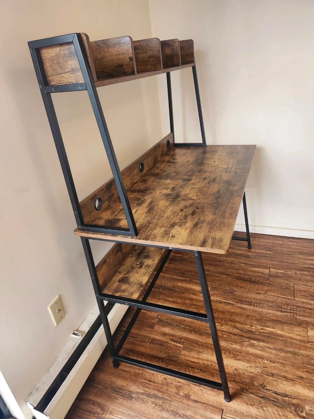 -Frame is black metal, wood finish surfaces.