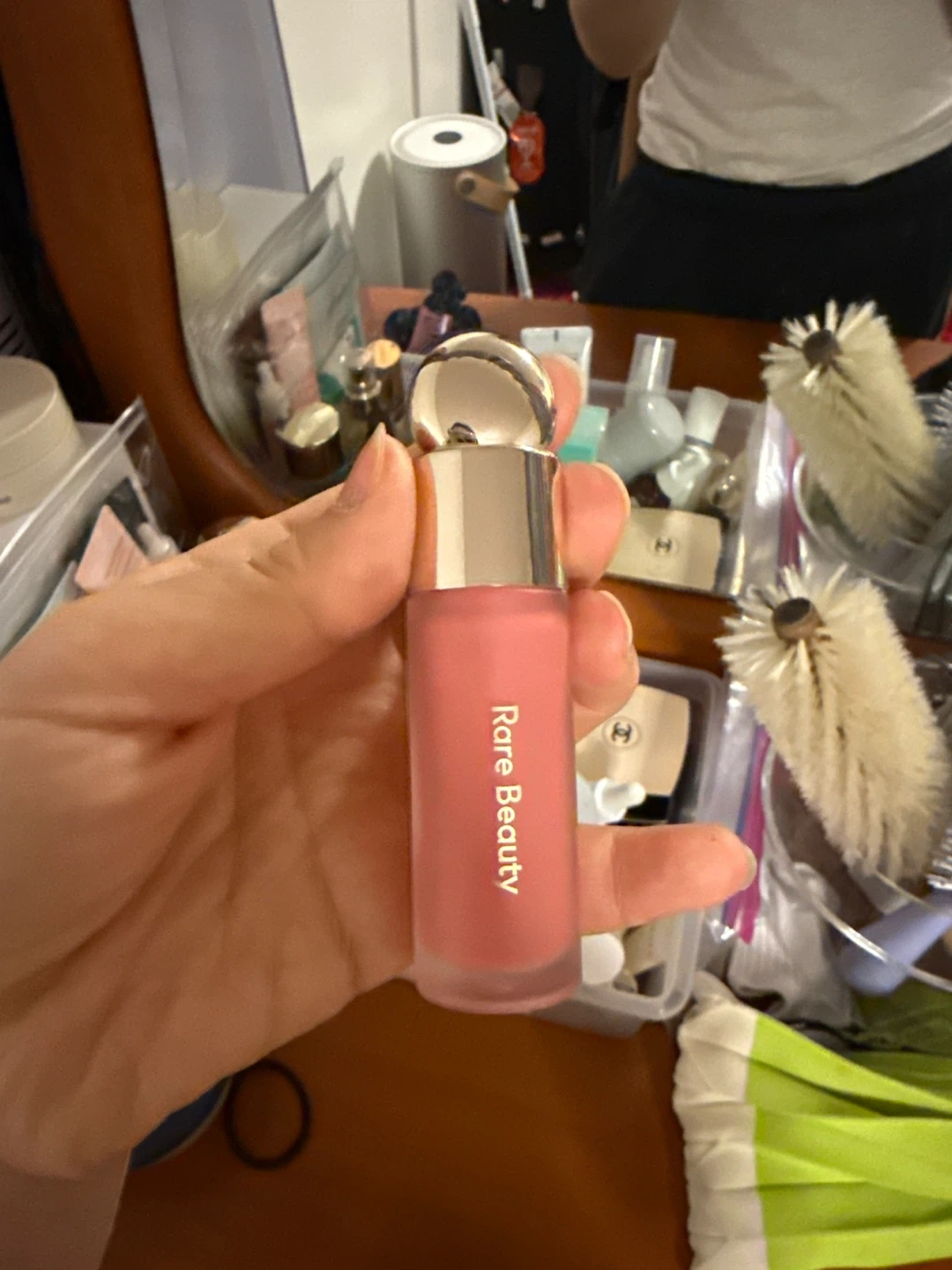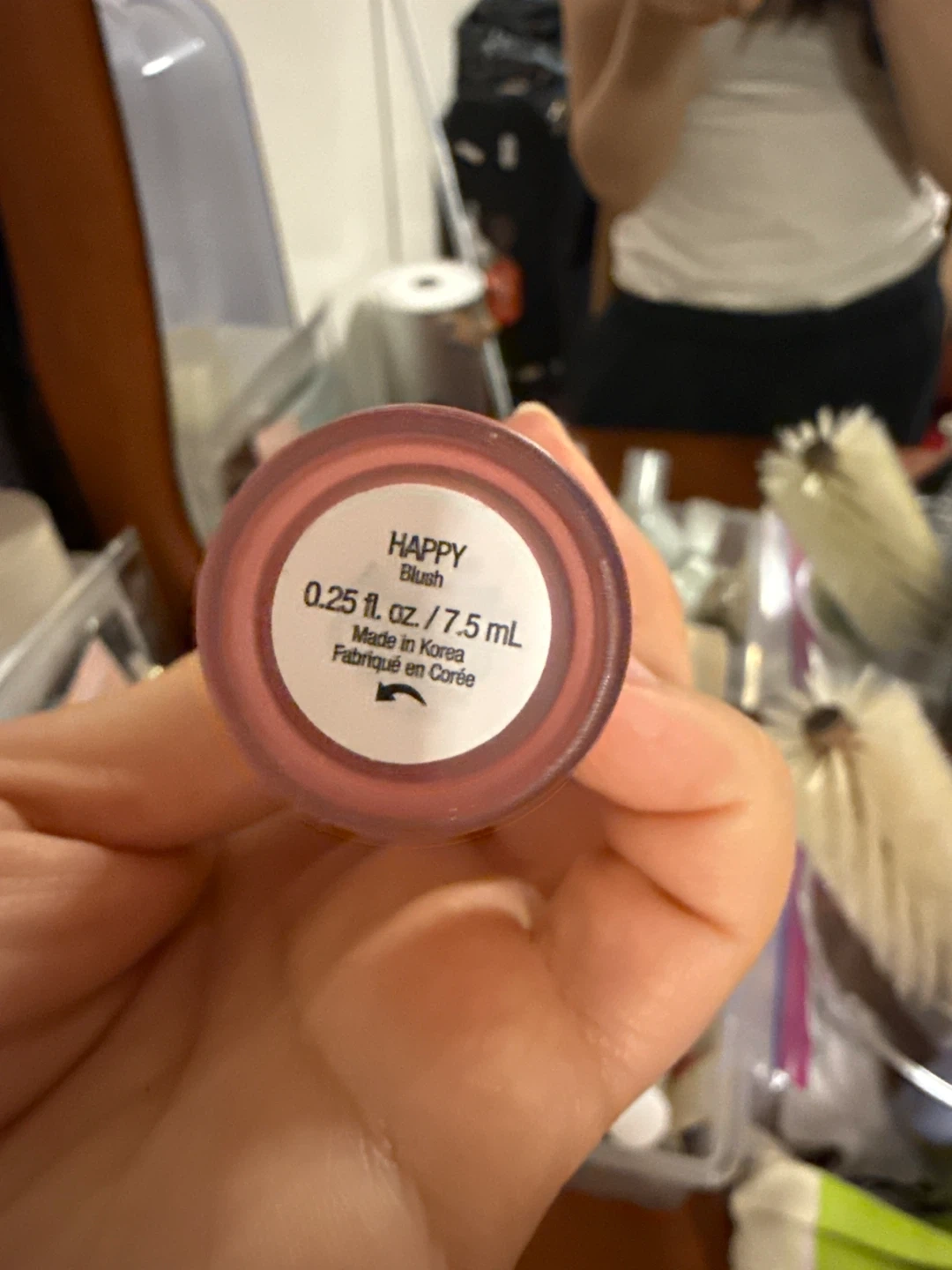 Rare Beauty blush in shade Happy. This liquid blush comes in a 0.25 fl. oz. or 7.5 mL size. Made in Korea.