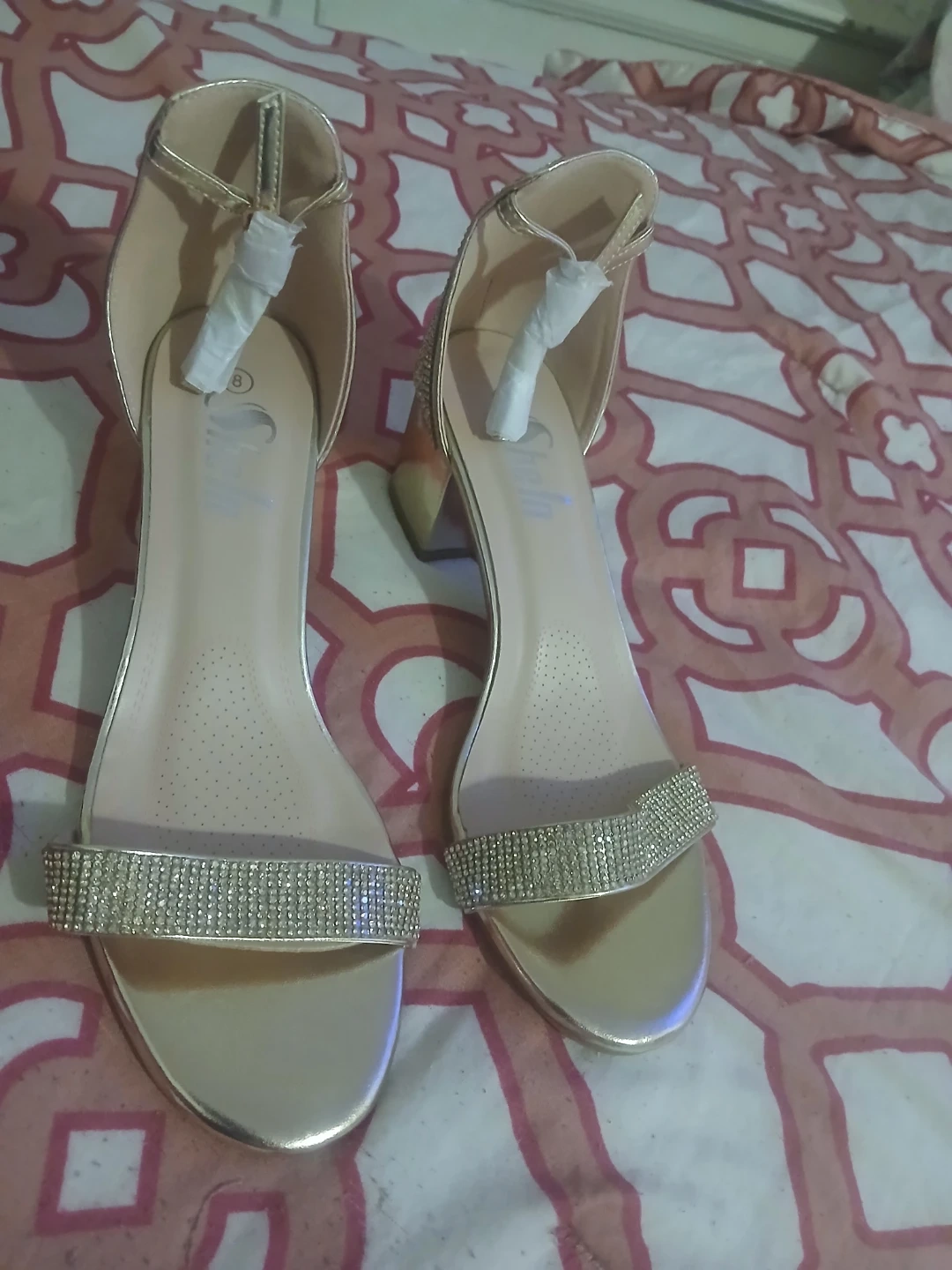 These Shila brand heeled sandals are a stunning gold color. They feature a comfortable open toe design and sparkling rhinestone embellishments across the strap. Perfect for dressing up any outfit!