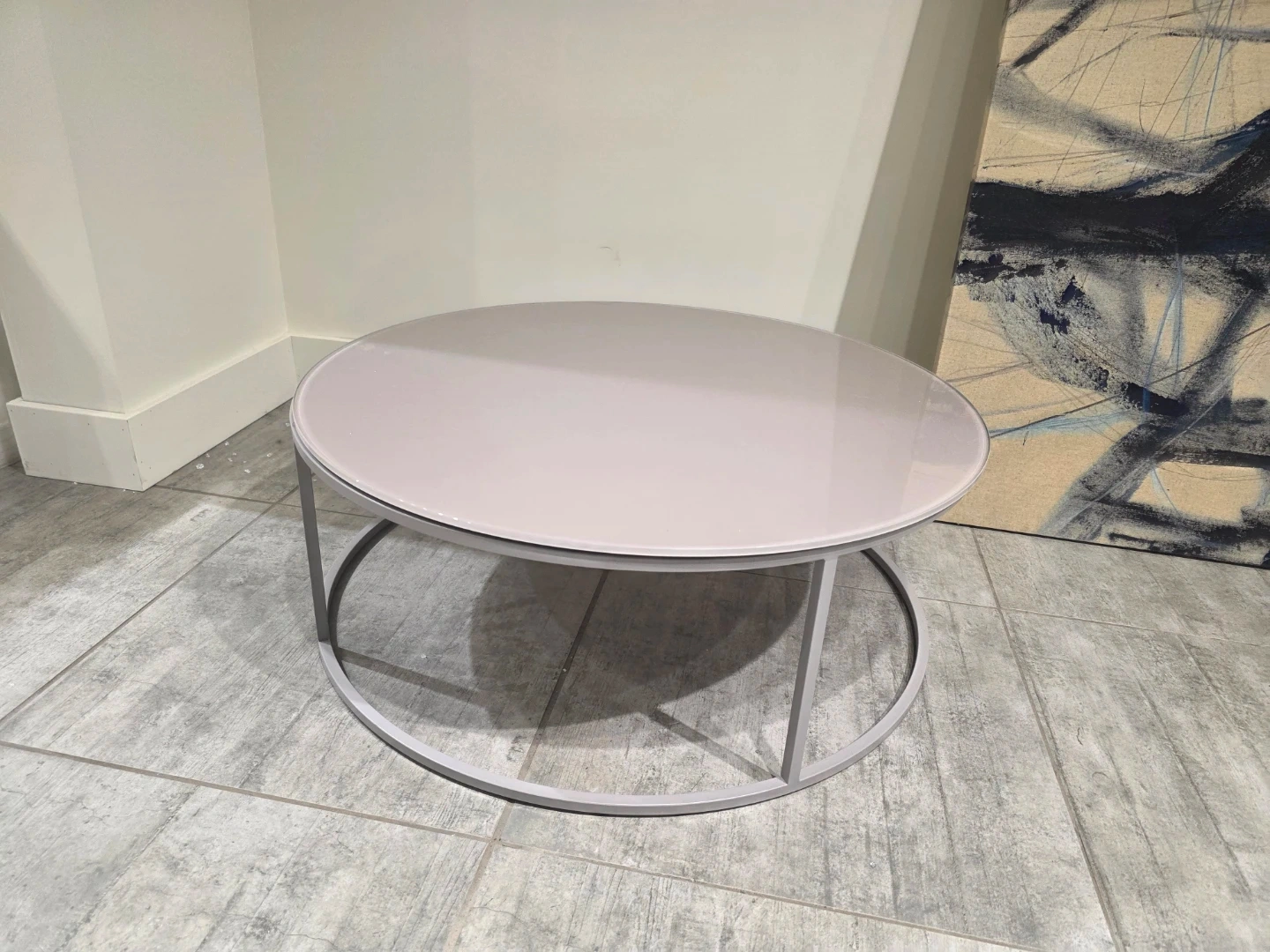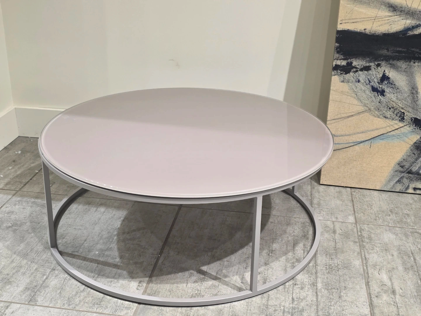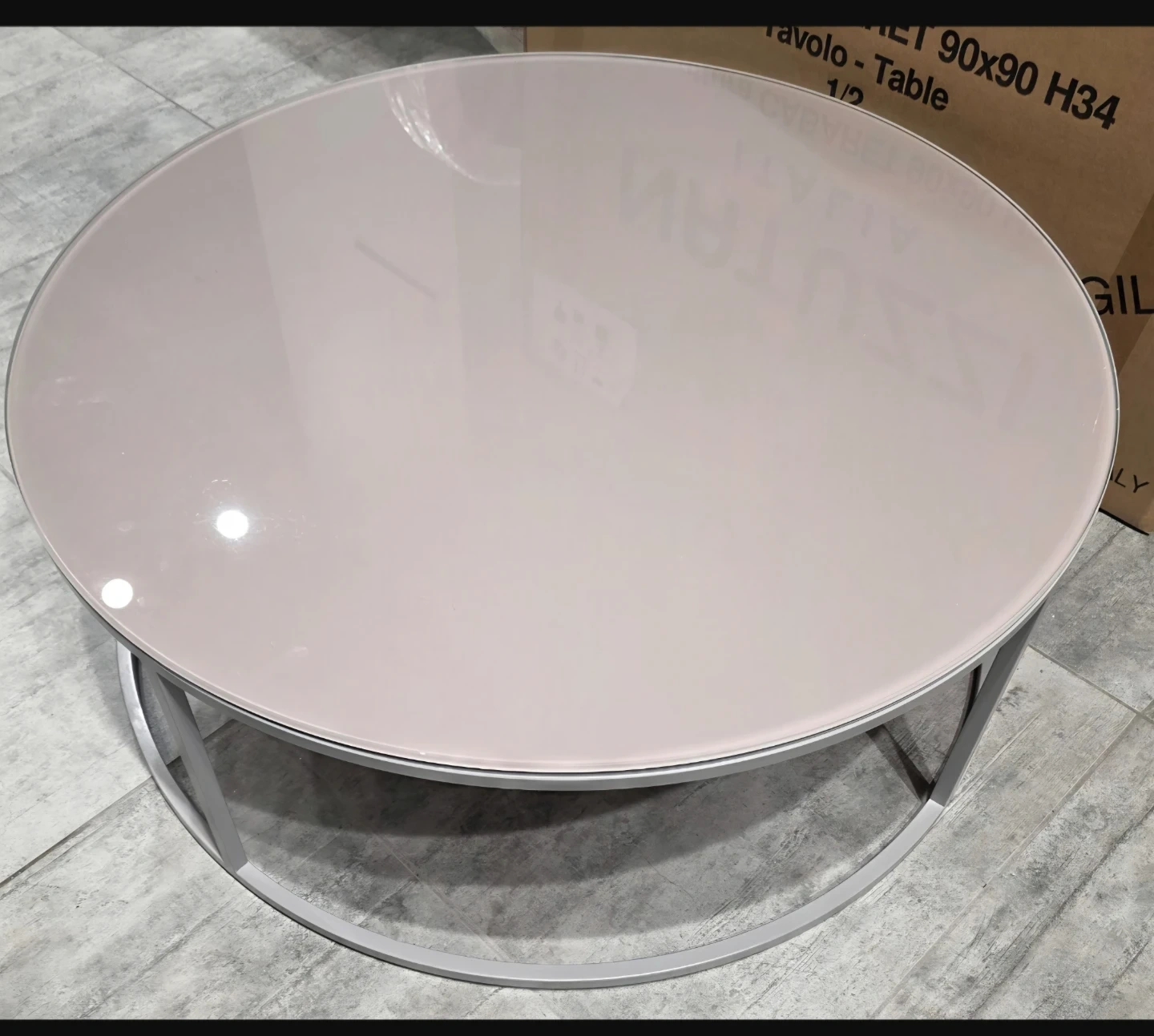 This round coffee table features a smooth, light-coloured top and a modern grey metal frame. It's a stylish accent piece for any living space. The table has a diameter of 90cm and a height of 34cm. Made in Italy. Brand new in Box