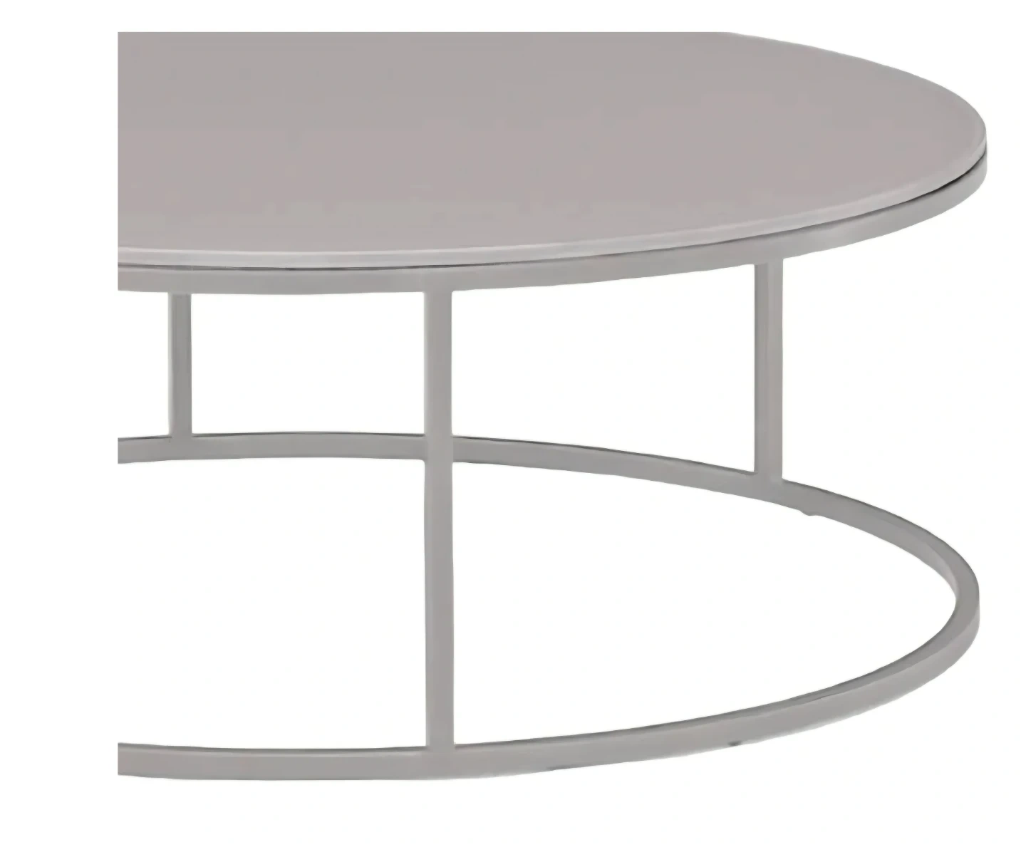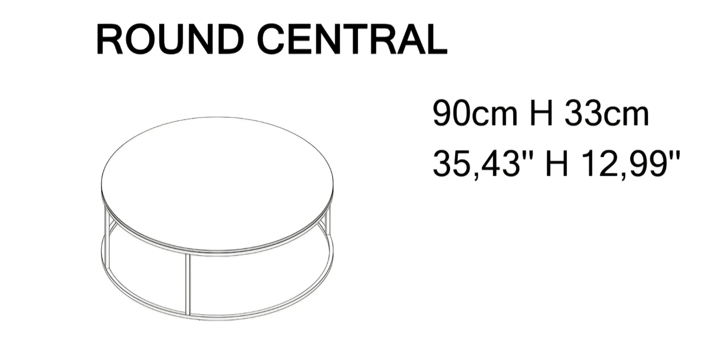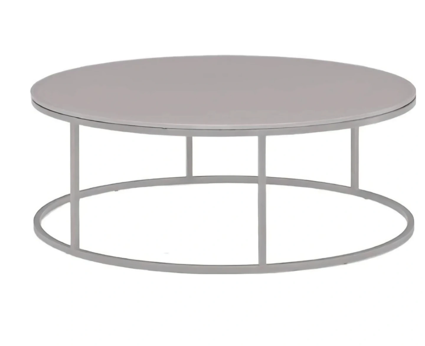 This round coffee table features a smooth, light-coloured top and a modern grey metal frame. It's a stylish accent piece for any living space. The table has a diameter of 90cm and a height of 34cm. Made in Italy. Brand new in Box