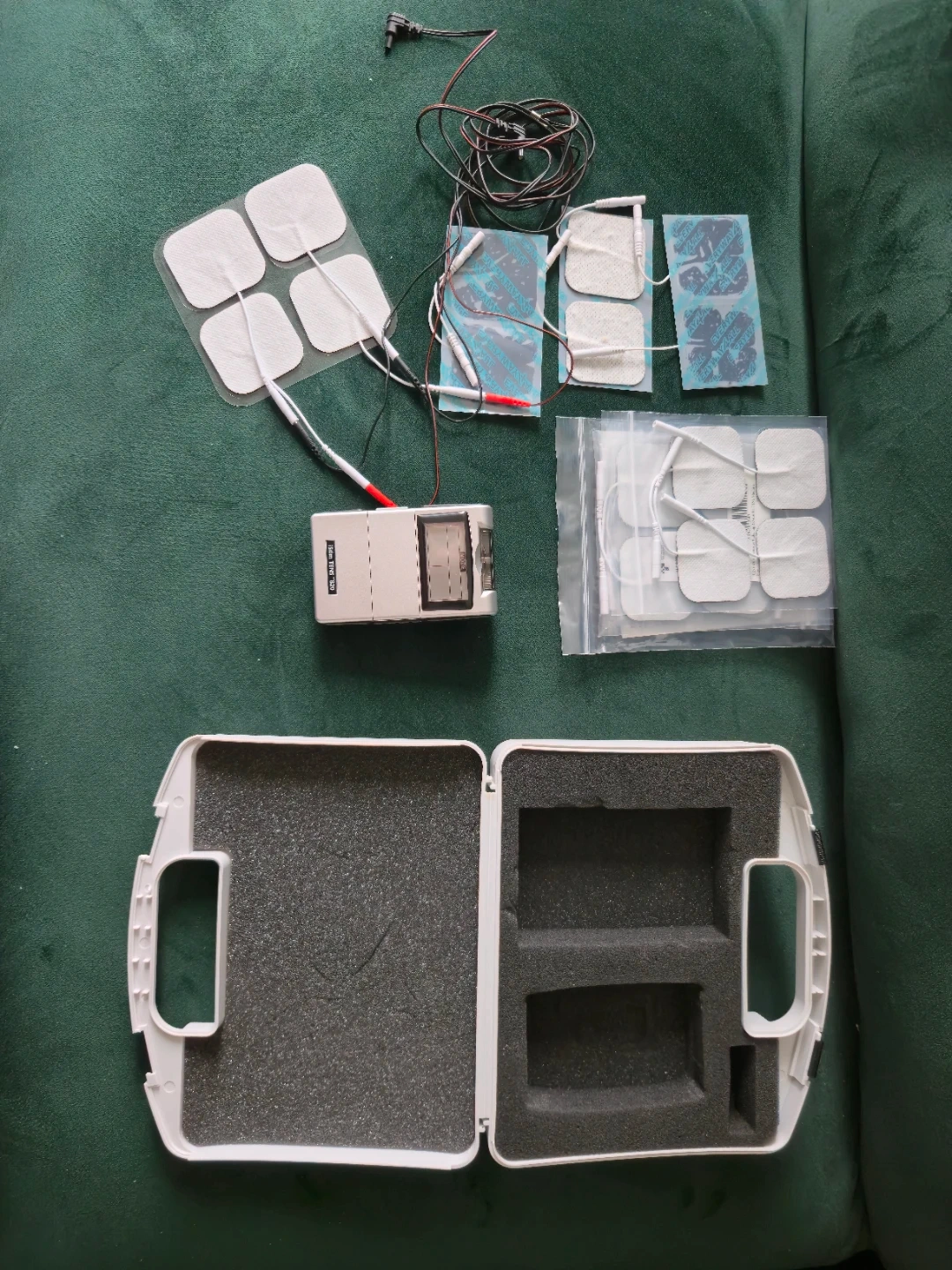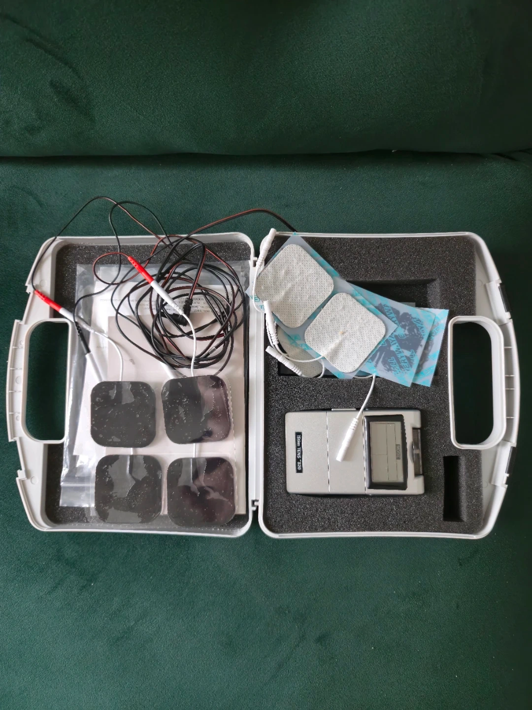This iStim TENS 820 unit comes with a carrying case and multiple electrode pads. It's designed for personal use and includes all the accessories shown. This device is great for temporary pain relief!