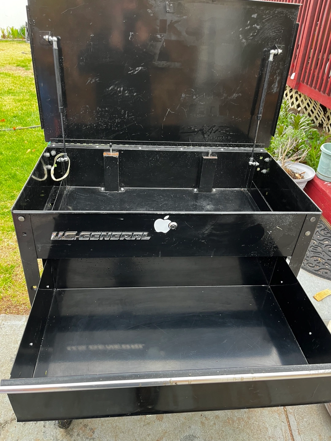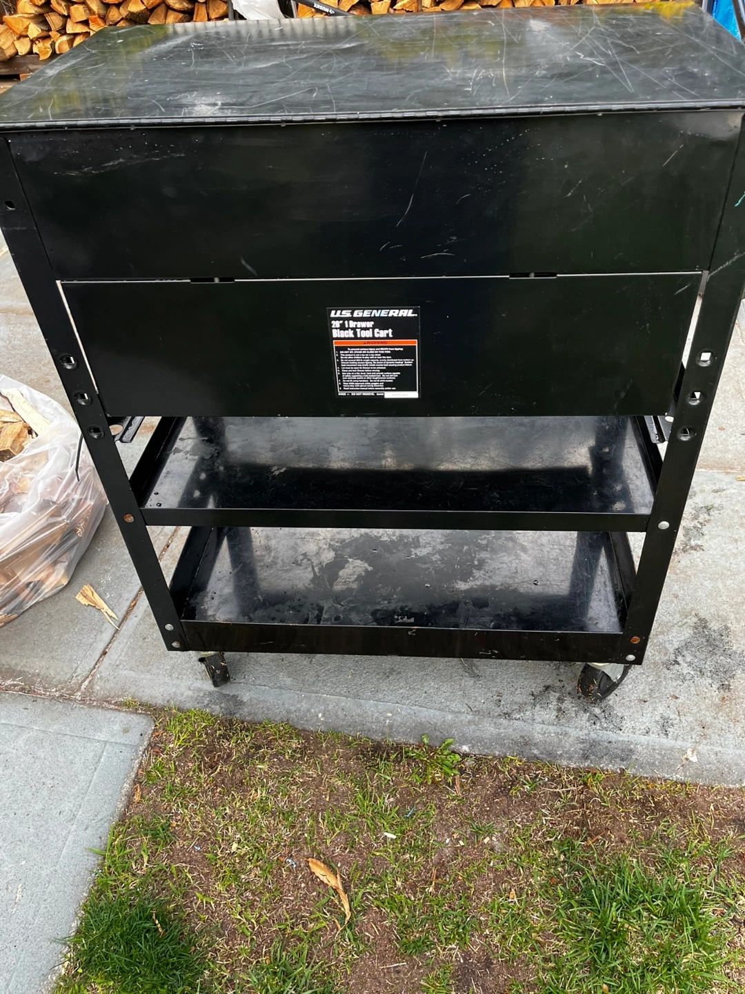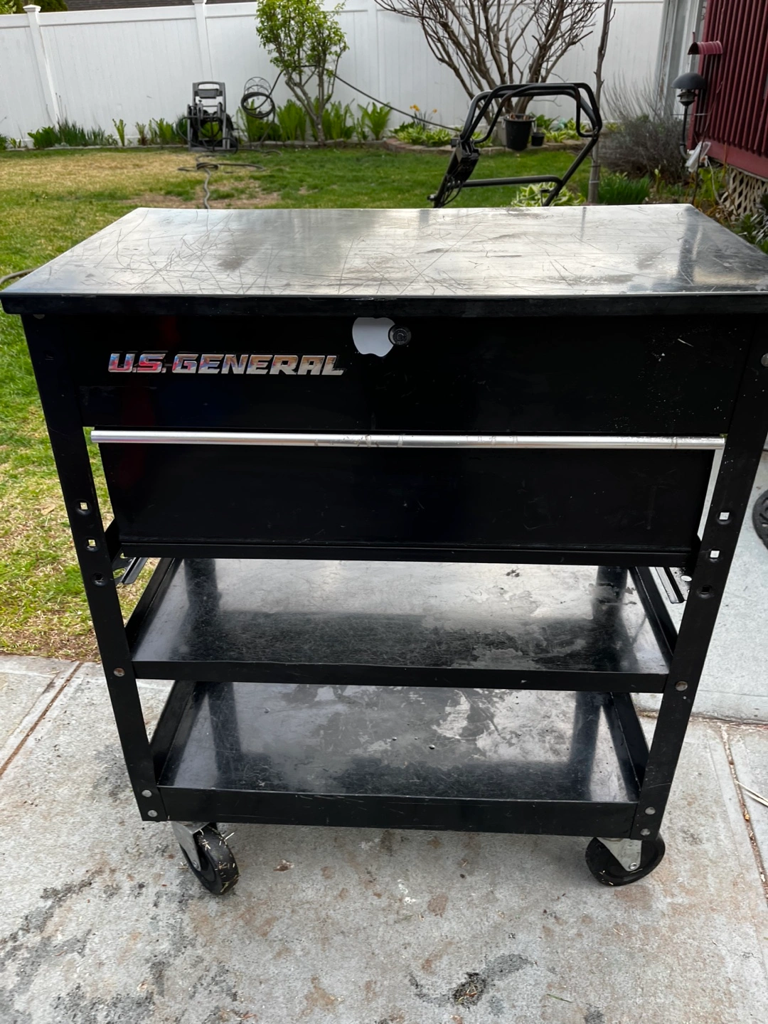 Selling a U.S. General 30" tool cart in black! It has a drawer and two shelves for storage. Great for organizing your tools and keeping them easily accessible