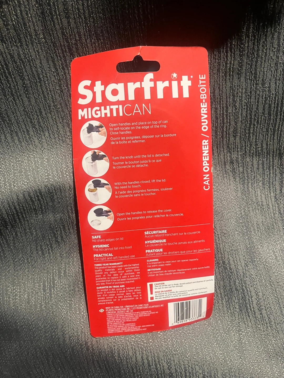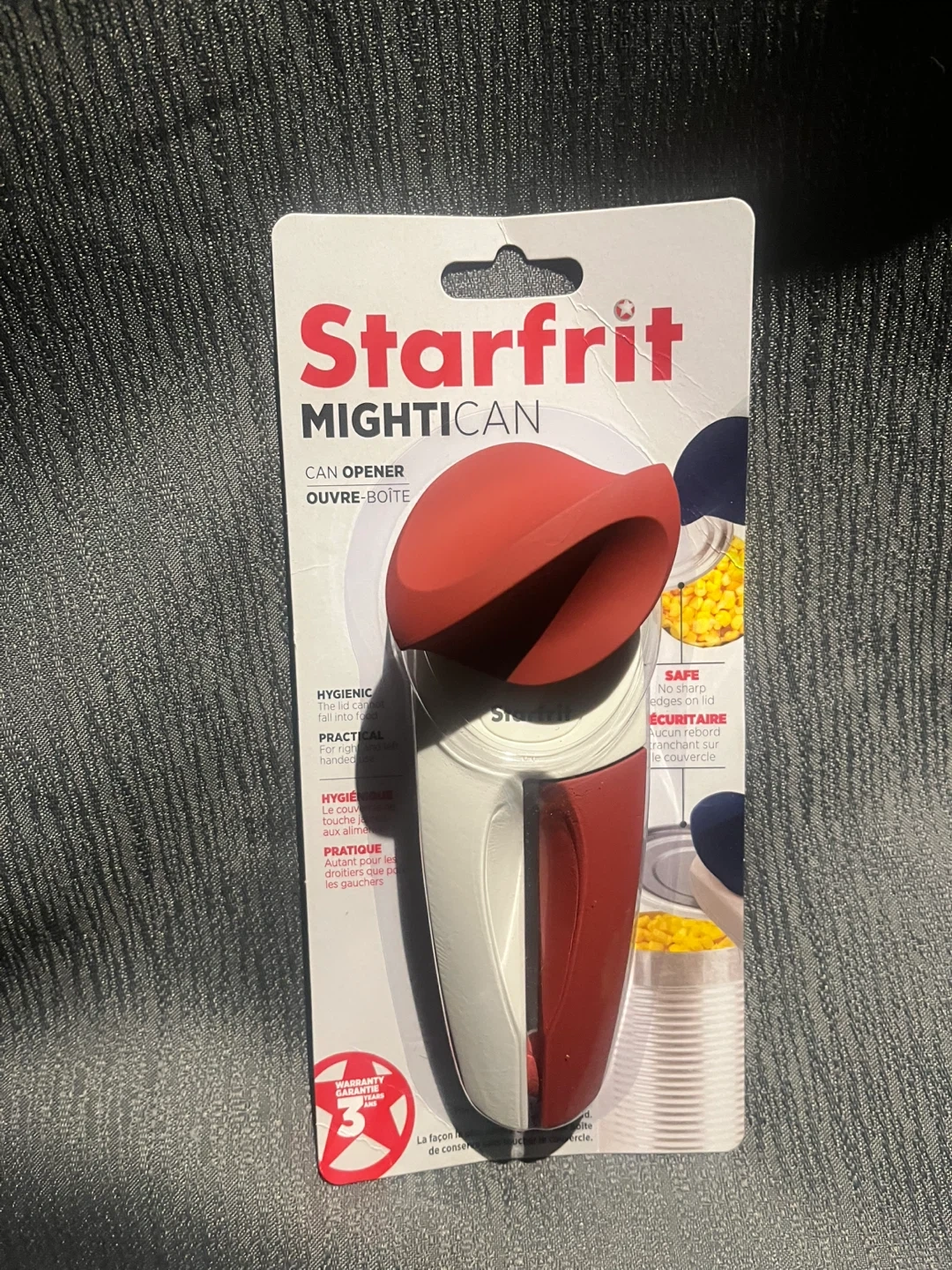 Starfrit MightiCan can opener. It opens cans with no sharp edges left on the lid. This can opener is hygienic and easy to use for both right and left-handed folks. It's made with high-quality materials and comes with a three-year warranty.