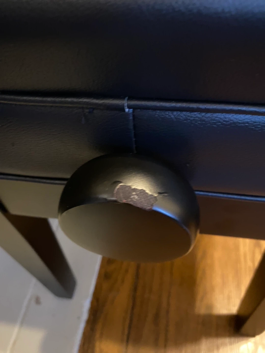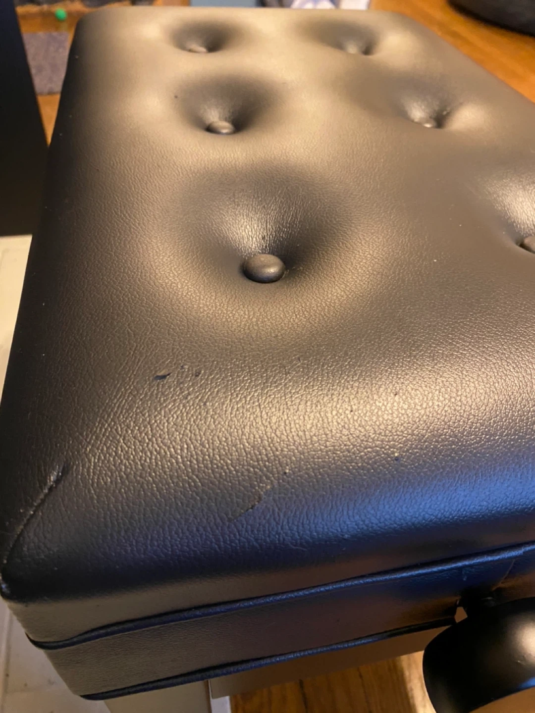 This piano was bought brand new and only played a handful of times. The black piano bench features a tufted seat and storage inside. It's upholstered in faux leather. Comes with a book of classical piano solos.