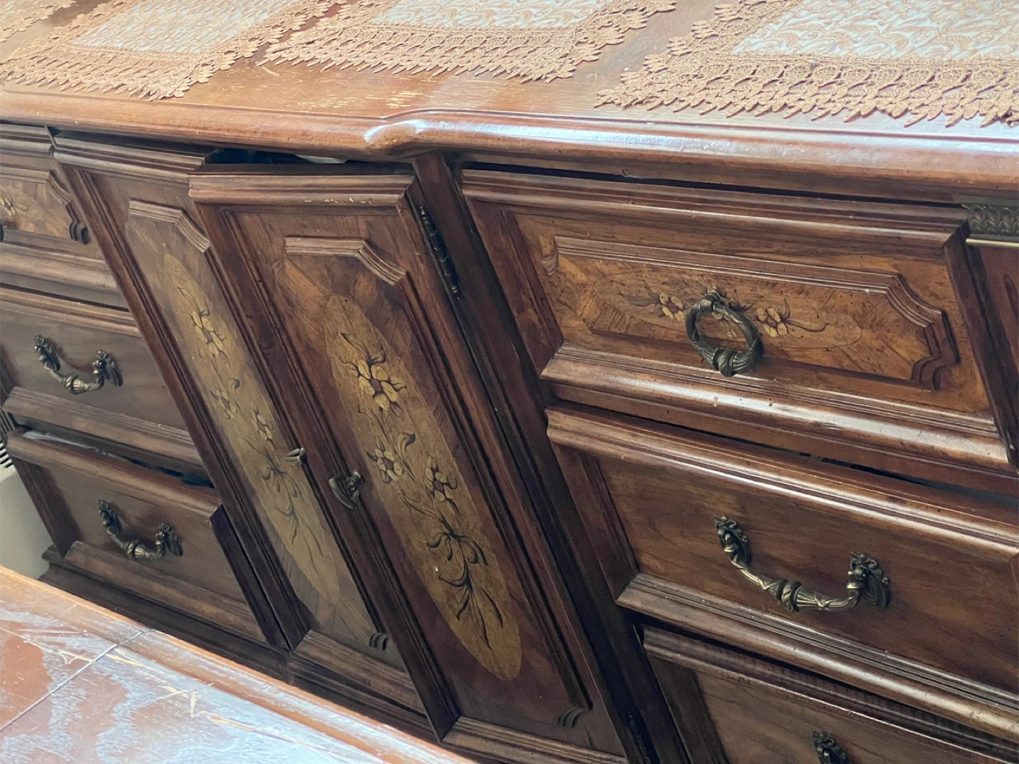 This is a vintage dresser made of solid wood. It features a rich brown finish with painted floral inlays on the cabinet doors and decorative drawer pulls. It offers ample storage with multiple drawers and cabinets. Dresser measurements