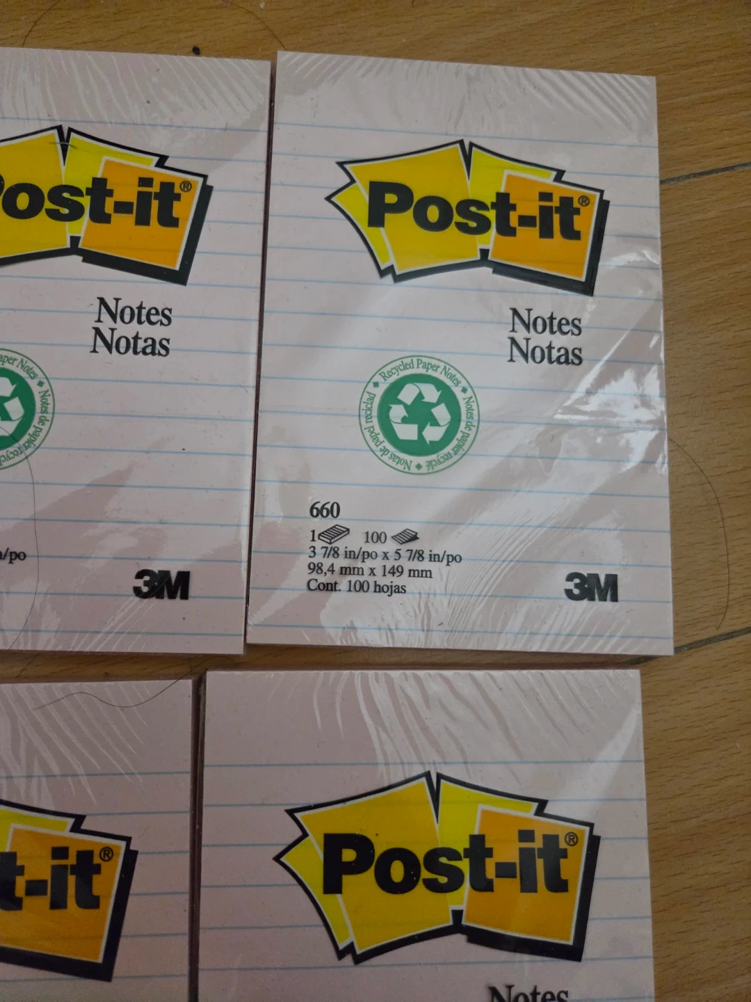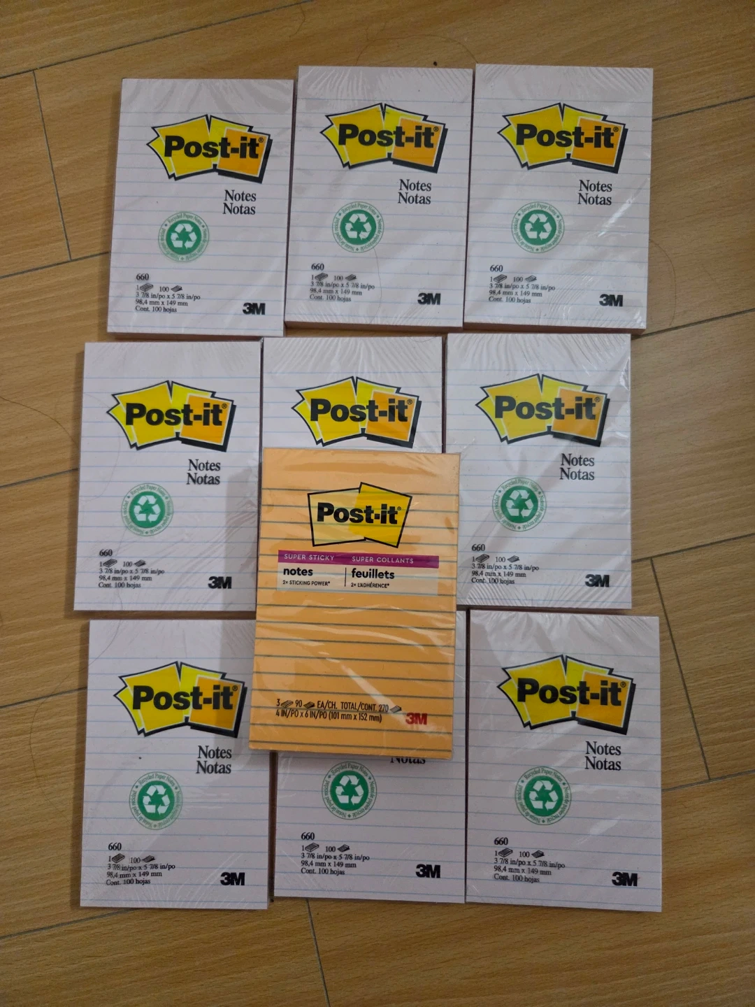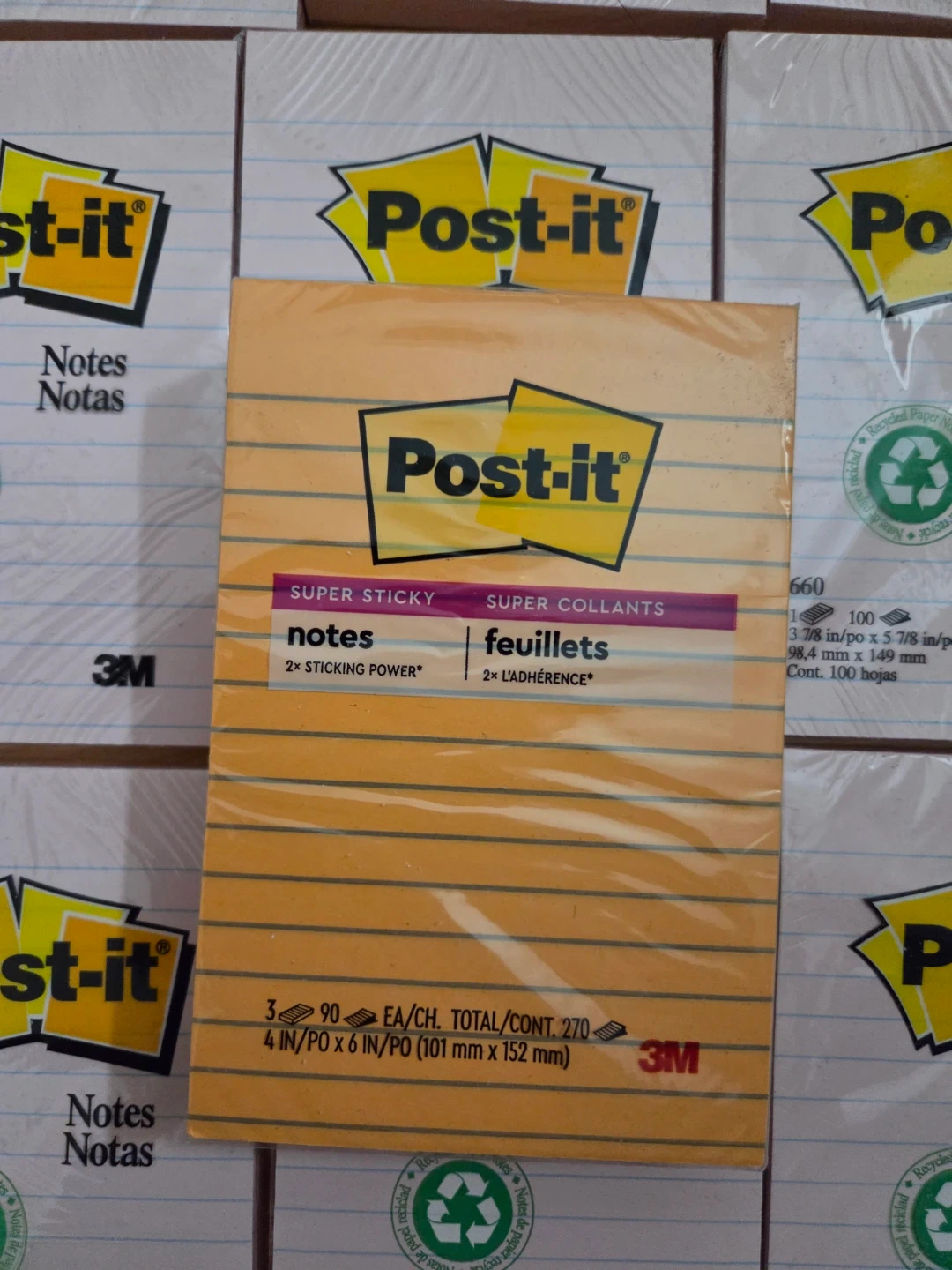 This is a pack of 10 Post-it Super Sticky Notes, each measuring 4 in x 6 in (101 mm x 152 mm). They offer 2x the sticking power. Made with recycled paper content.