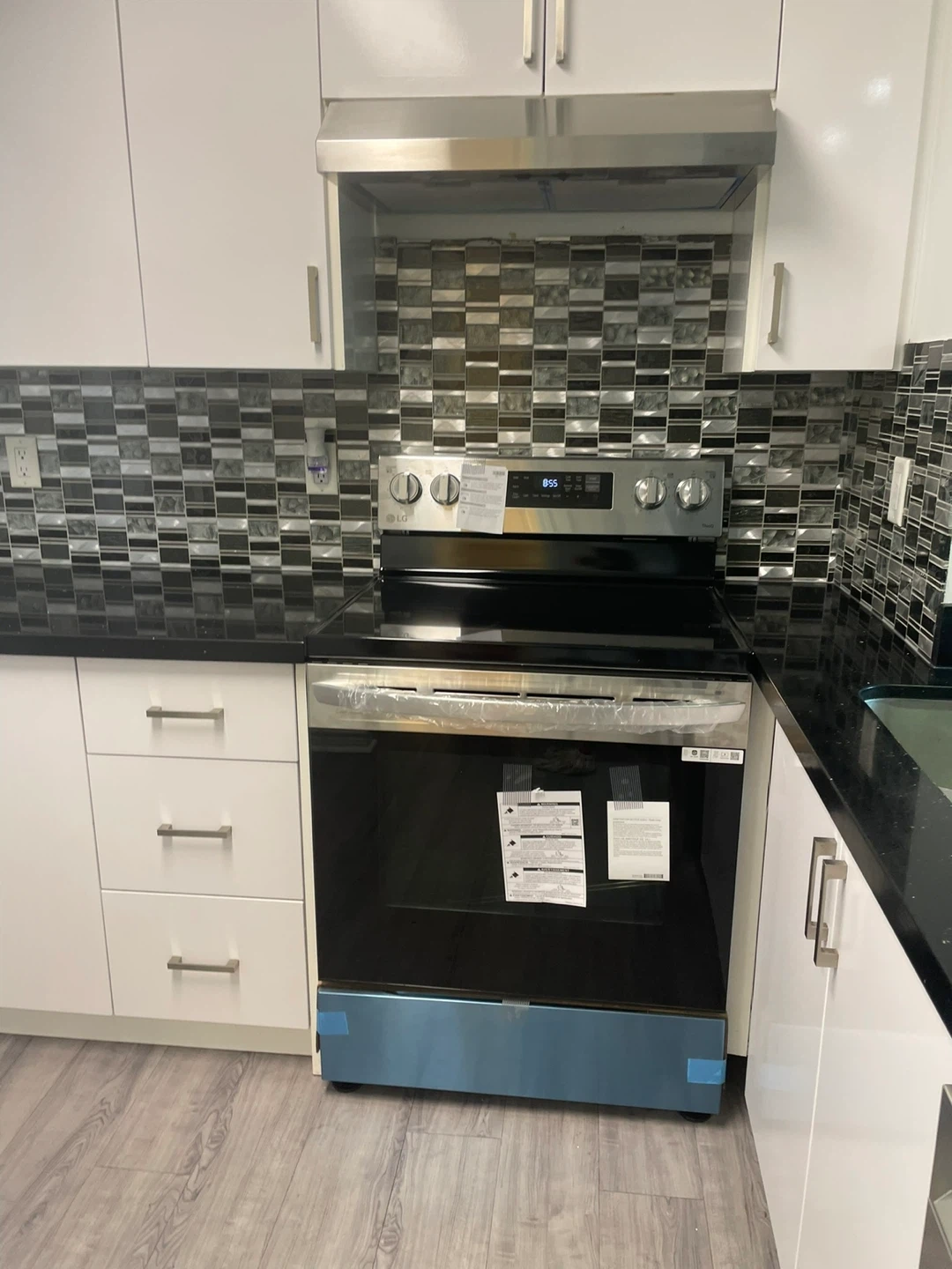 LG electric range oven with a stainless steel finish. It features a smooth glass cooktop and a spacious oven below. This appliance is perfect for any modern kitchen needing a reliable cooking solution.