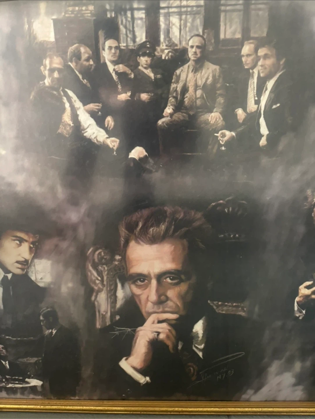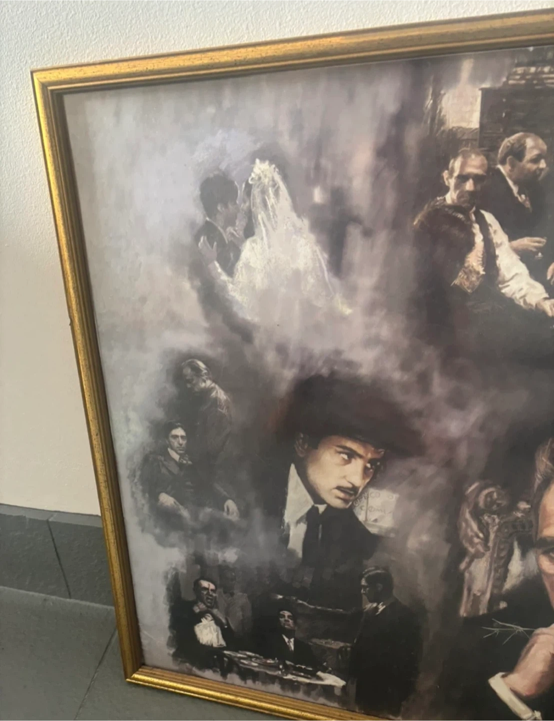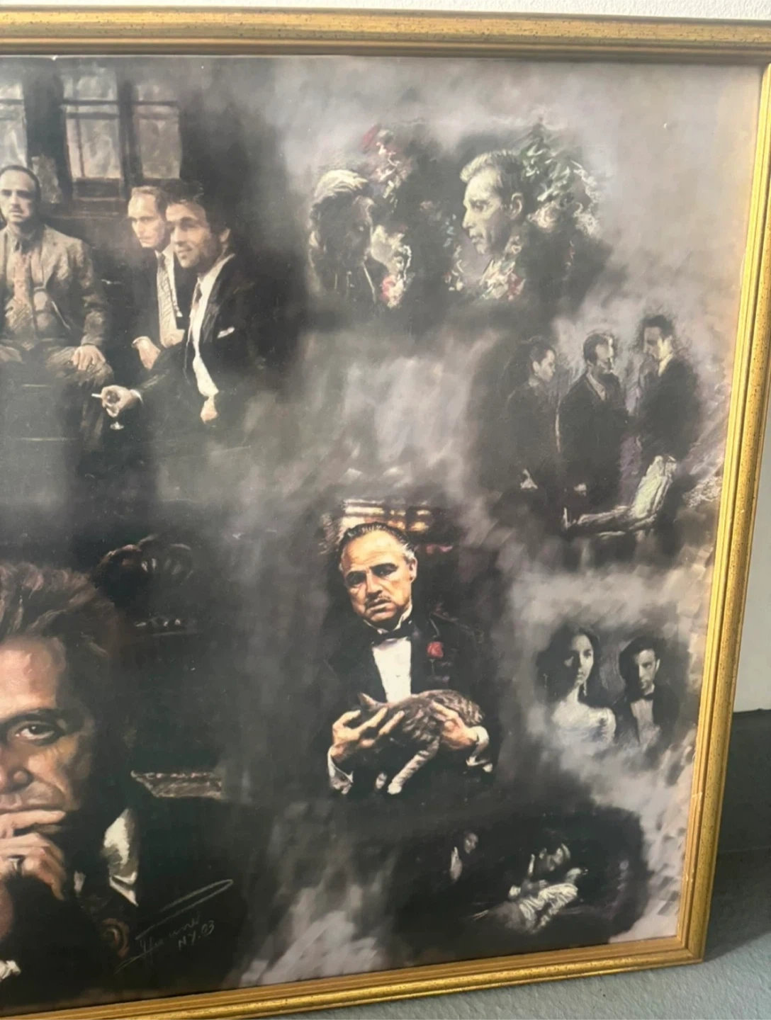 This is a framed art print featuring iconic scenes and characters from The Godfather. The artwork is rendered in a grayscale, painterly style. It's framed in a gold-colored wood frame.