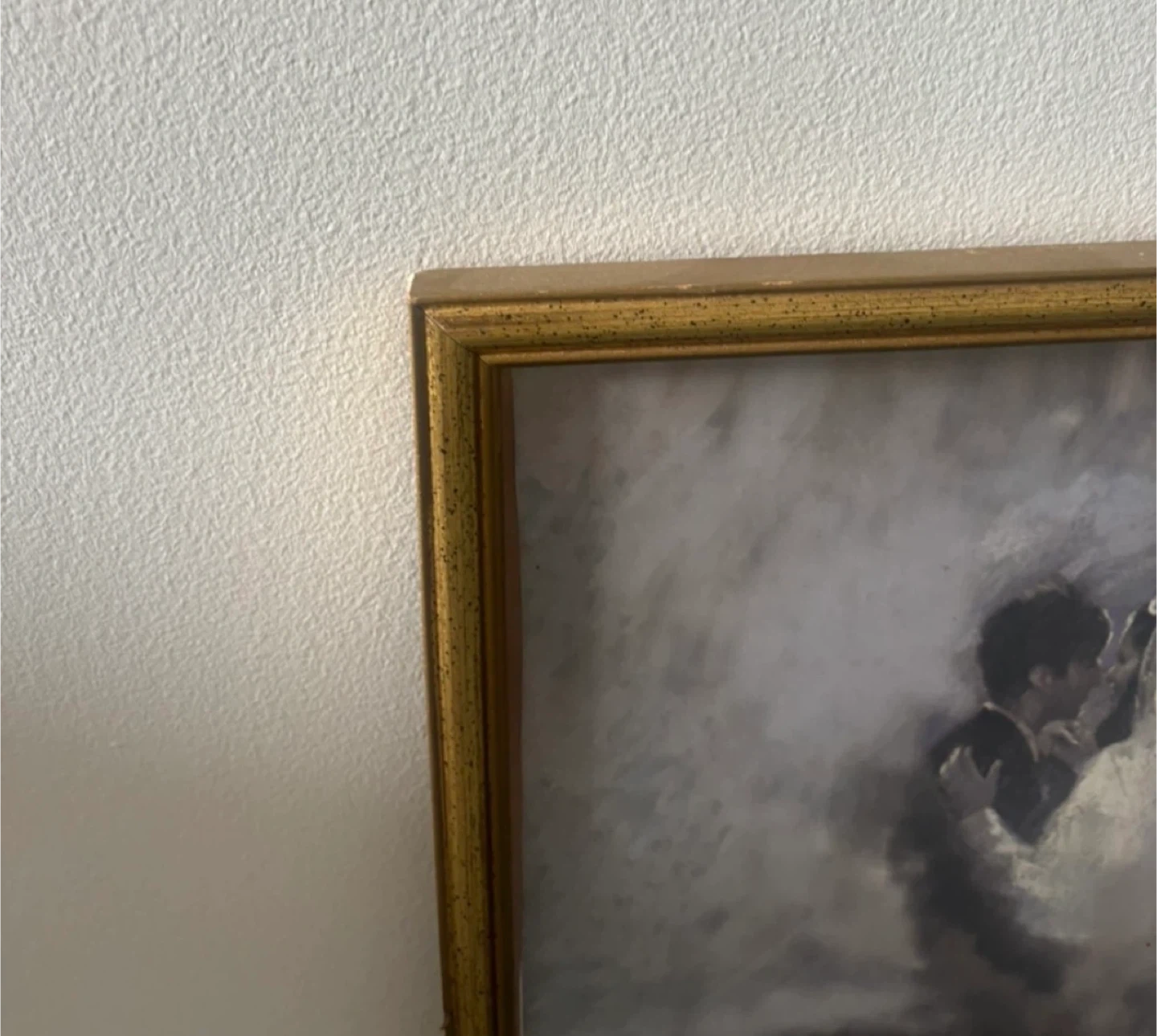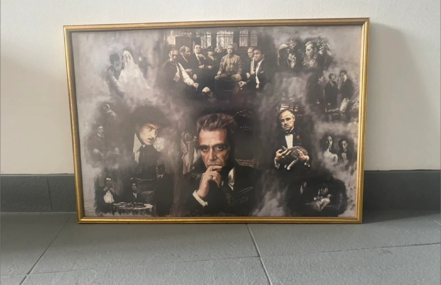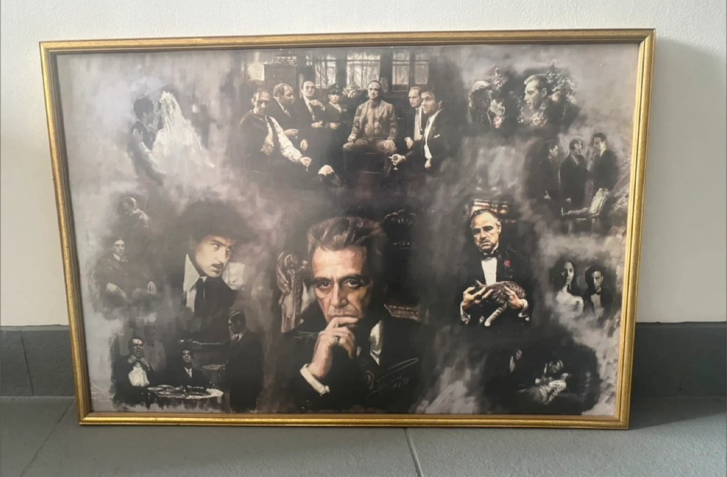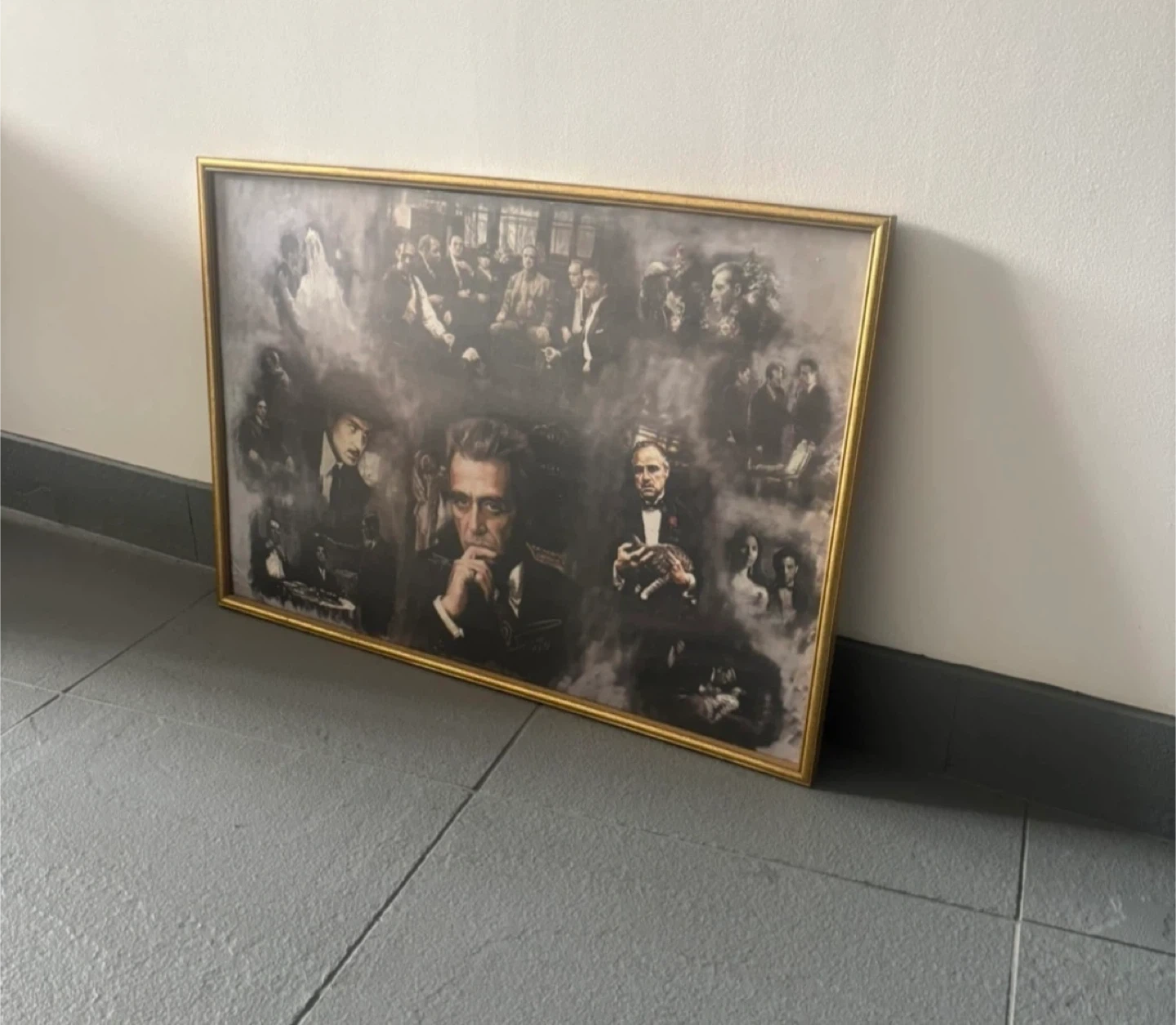 This is a framed art print featuring iconic scenes and characters from The Godfather. The artwork is rendered in a grayscale, painterly style. It's framed in a gold-colored wood frame.