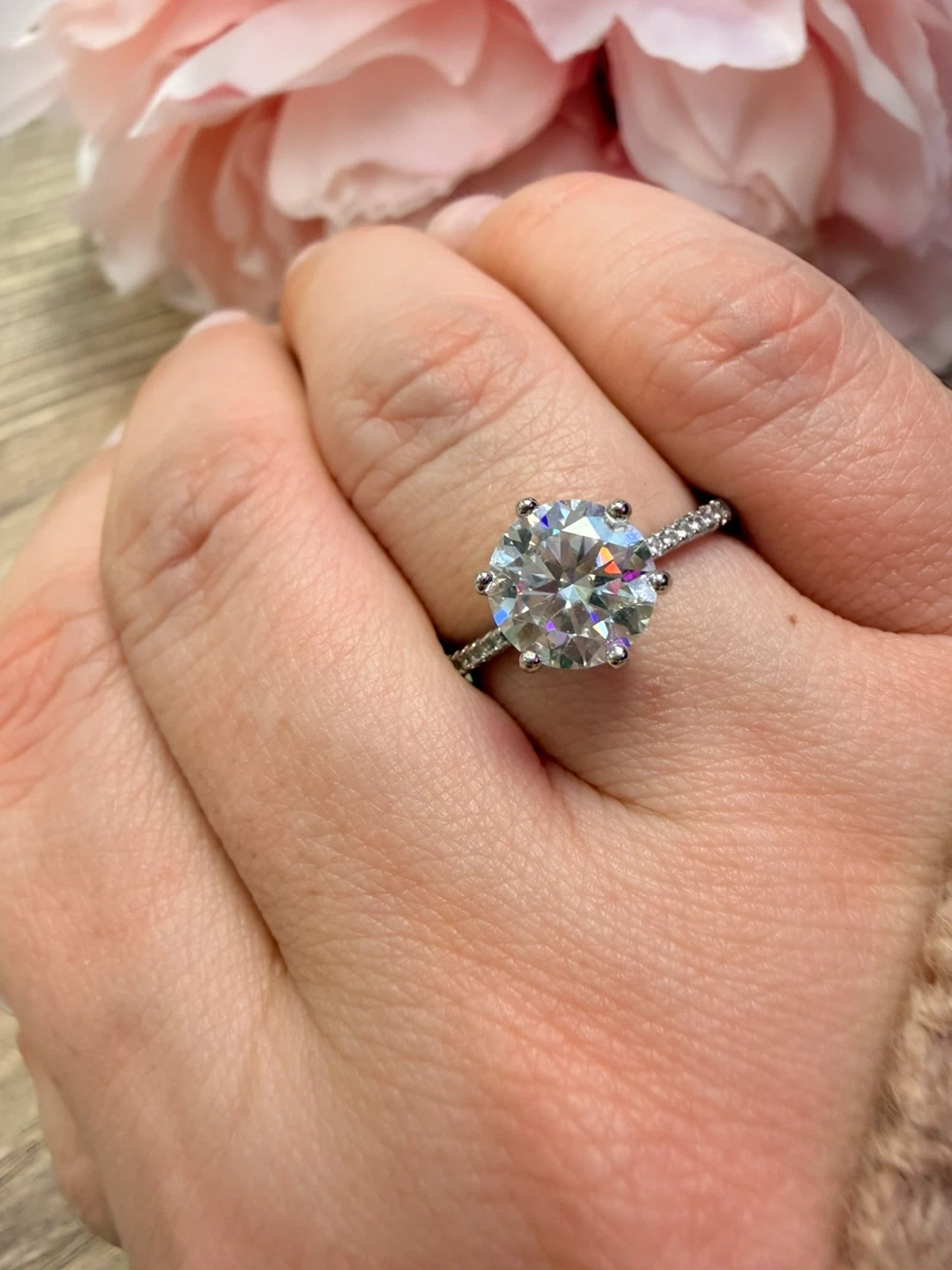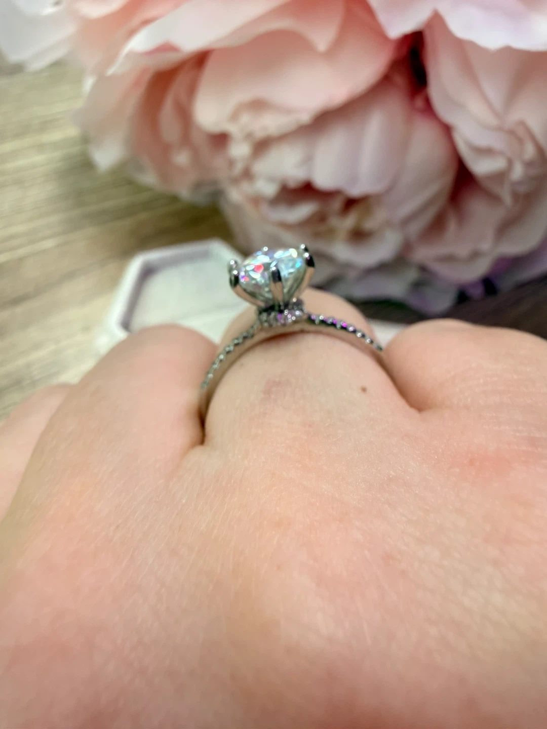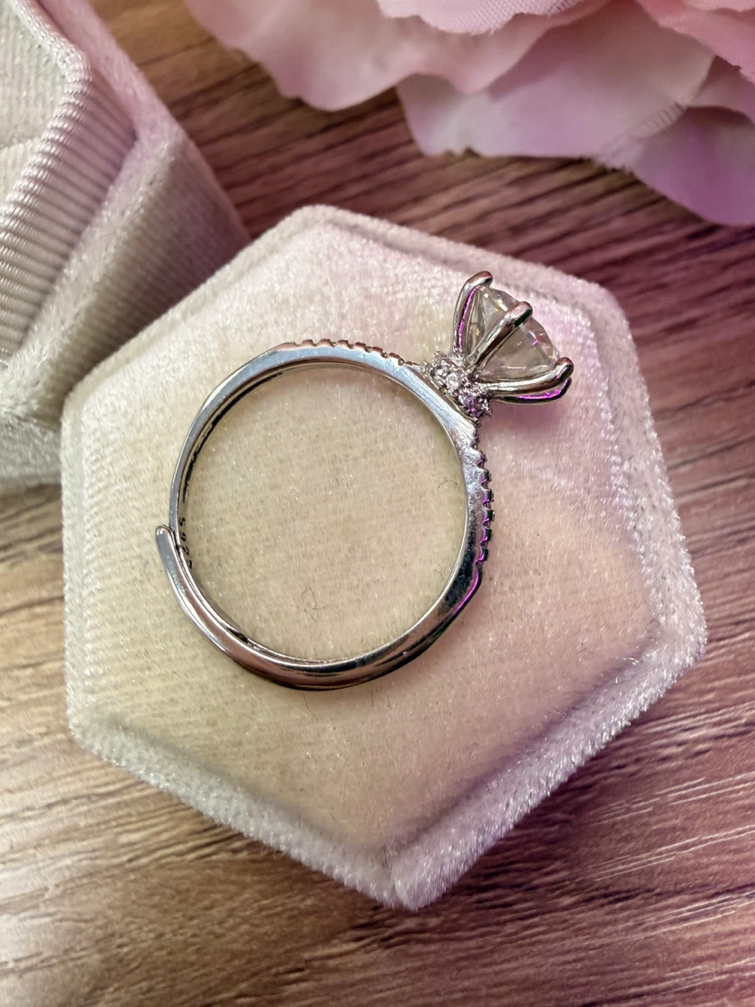 Beautiful moissanite ring featuring a large, brilliant-cut centre stone and smaller accent stones along the band. It's made of sterling silver, marked S925. Size is adjustable!
