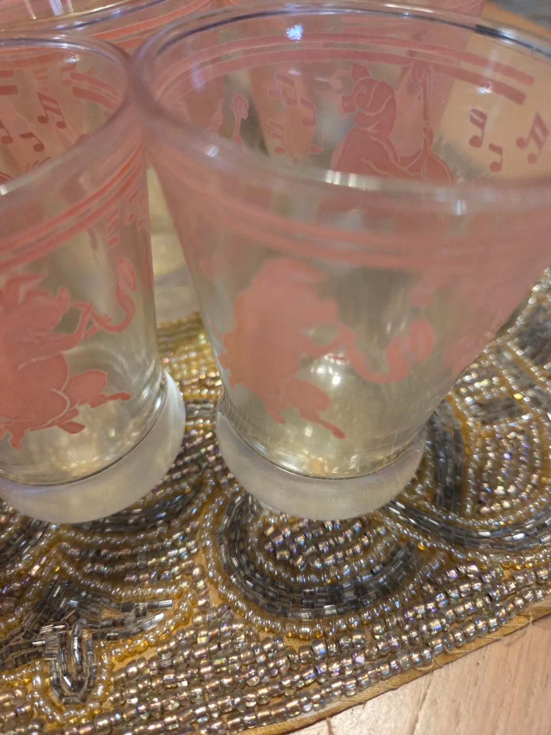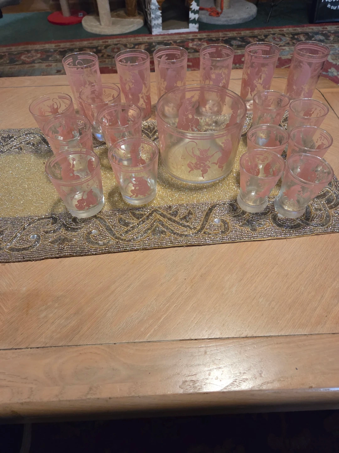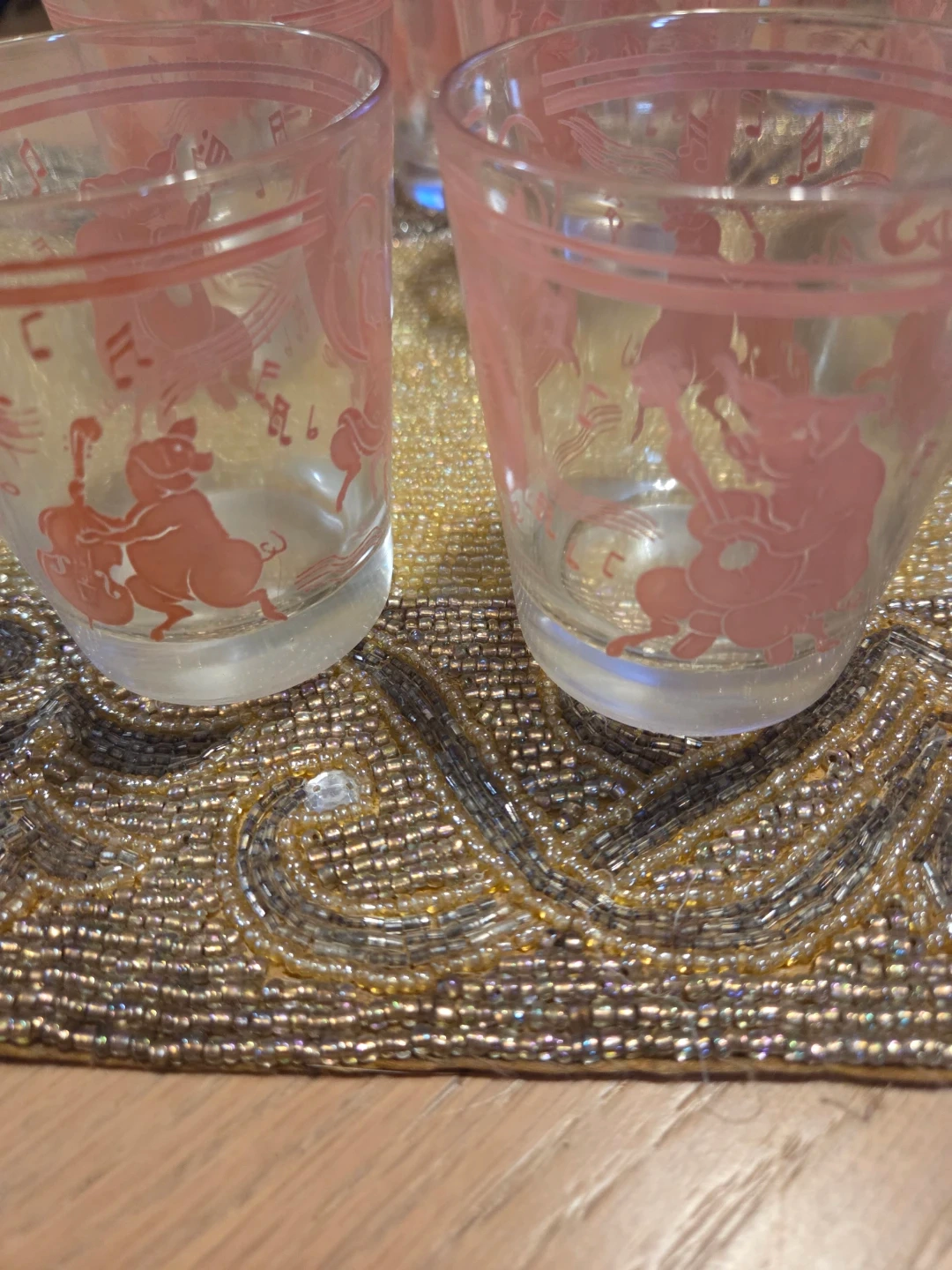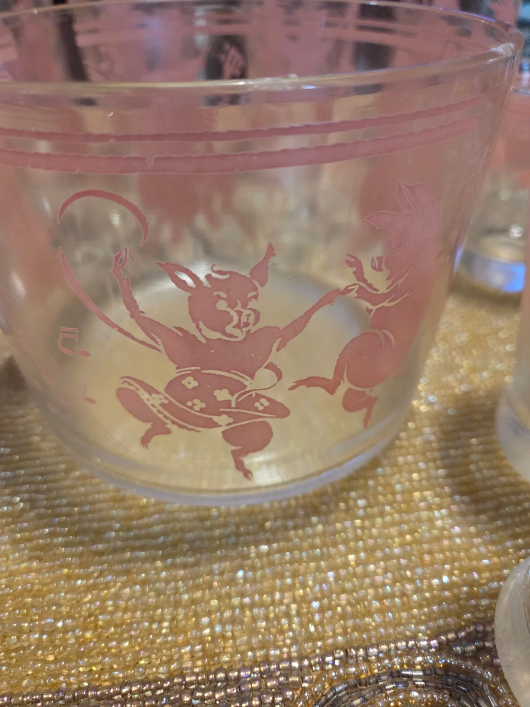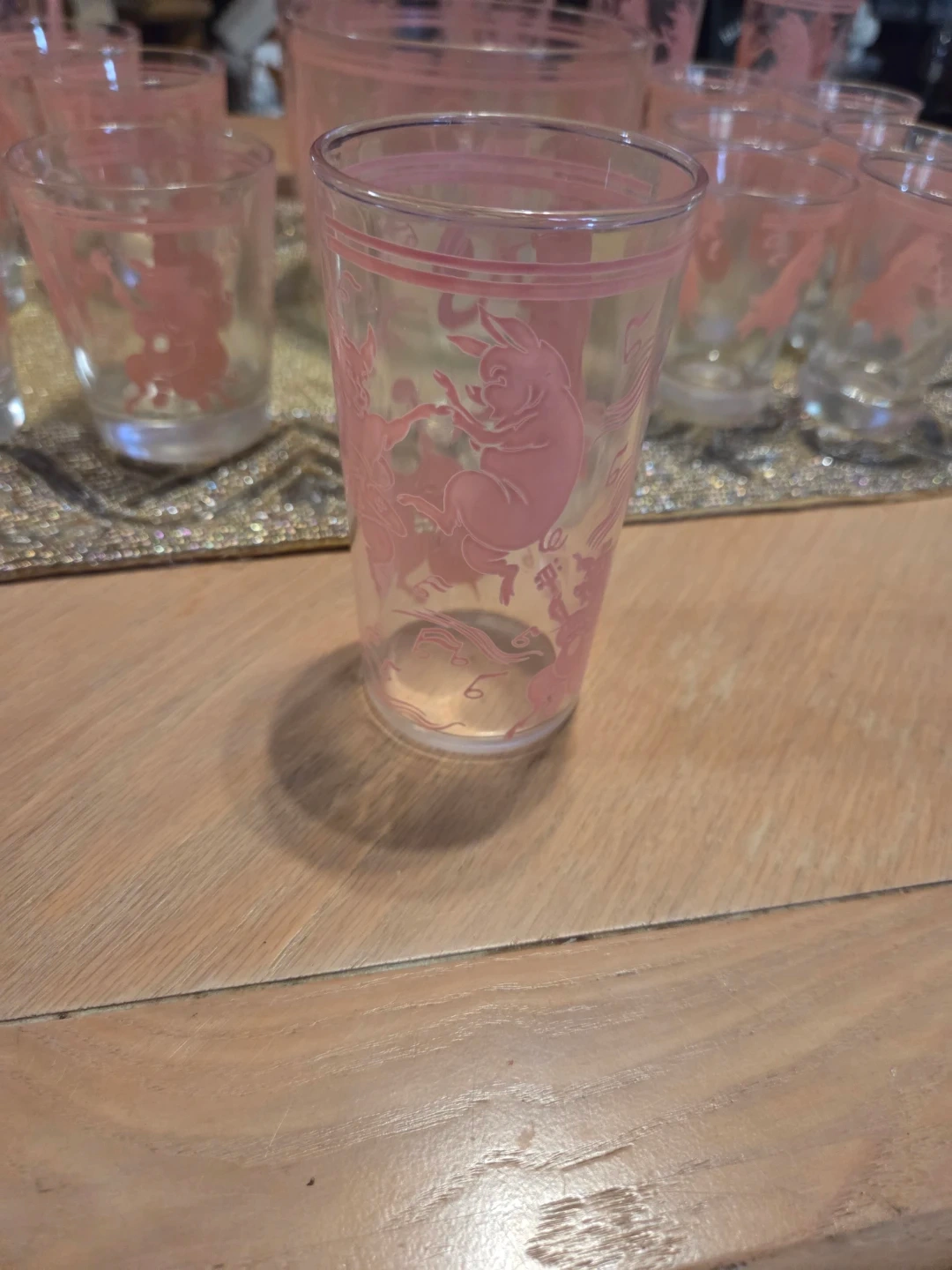 A set of vintage glasses featuring a playful pink pig design. These glasses are made of clear glass with a pink frosted decal. They're perfect for adding a touch of whimsy to your kitchen or barware collection. Includes one larger pitcher and multiple smaller glasses.