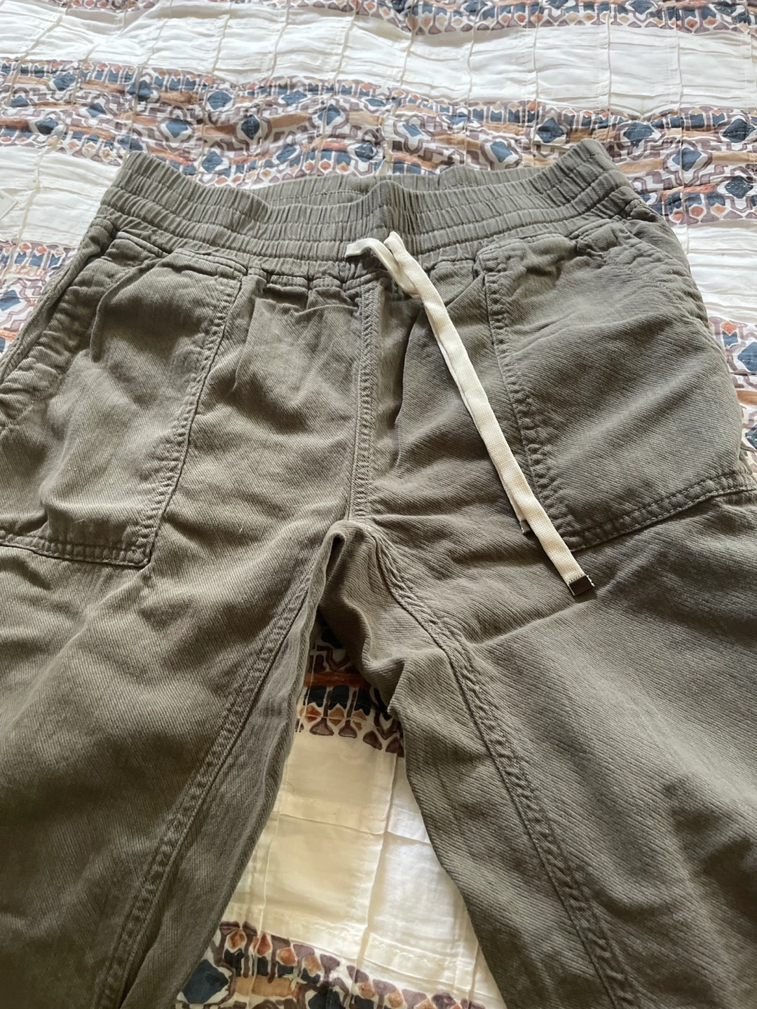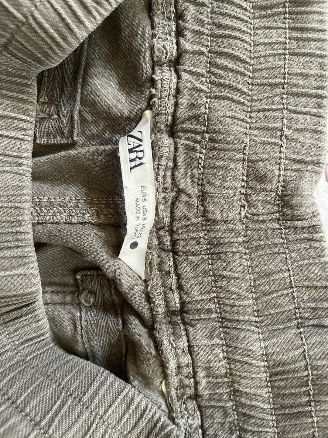 These are a pair of Zara olive green cotton jogger pants in size S. They feature a comfortable elastic waistband with a drawstring and a relaxed fit. Great for casual wear!