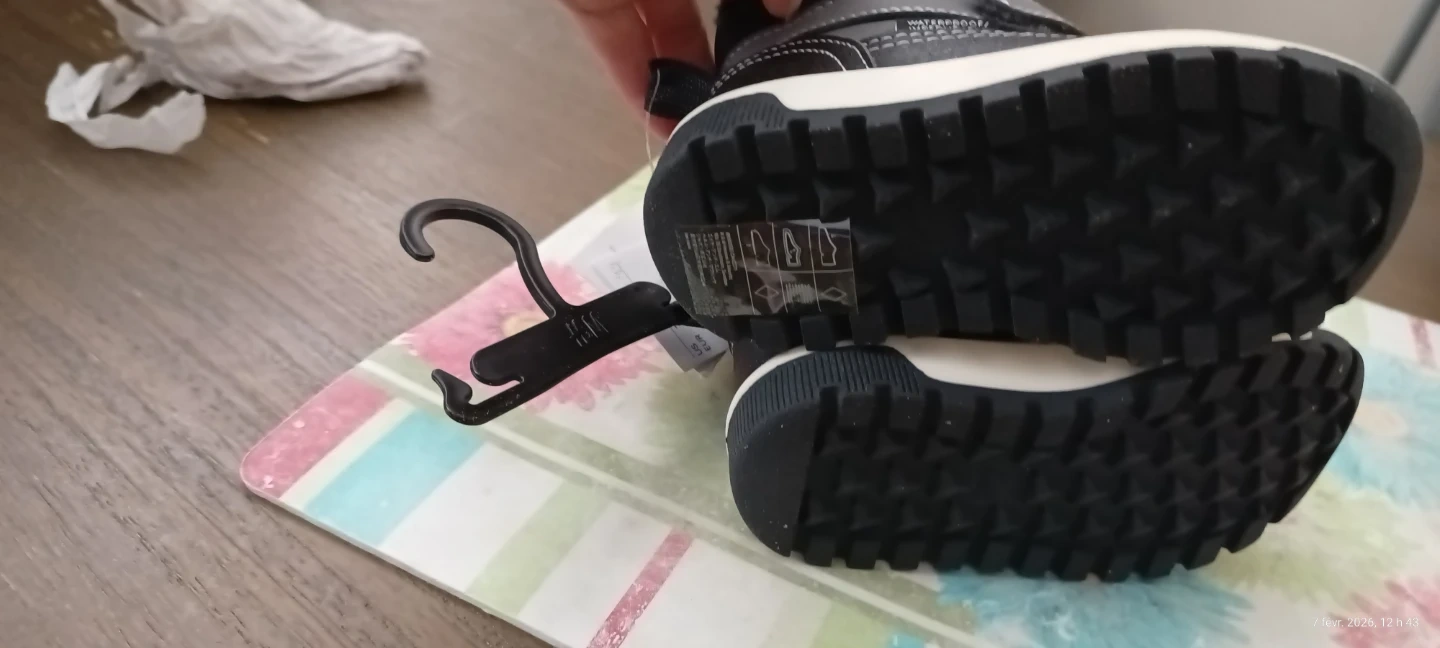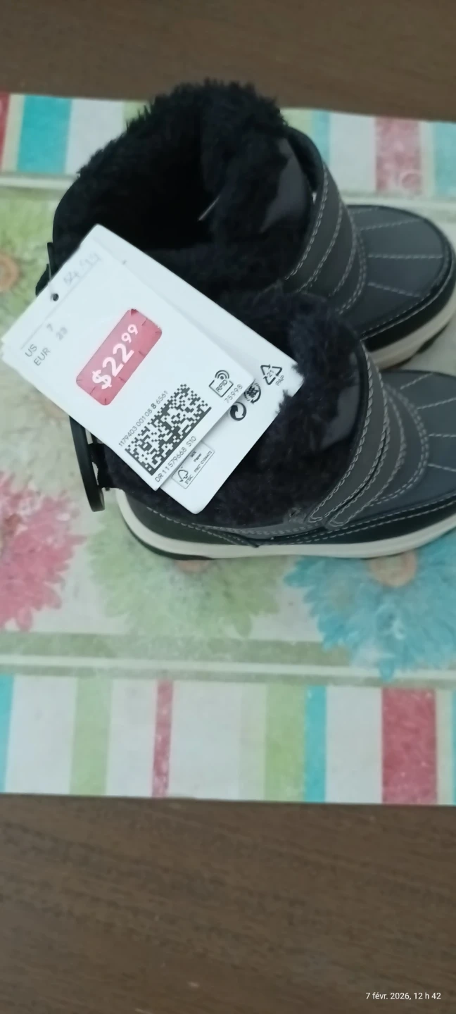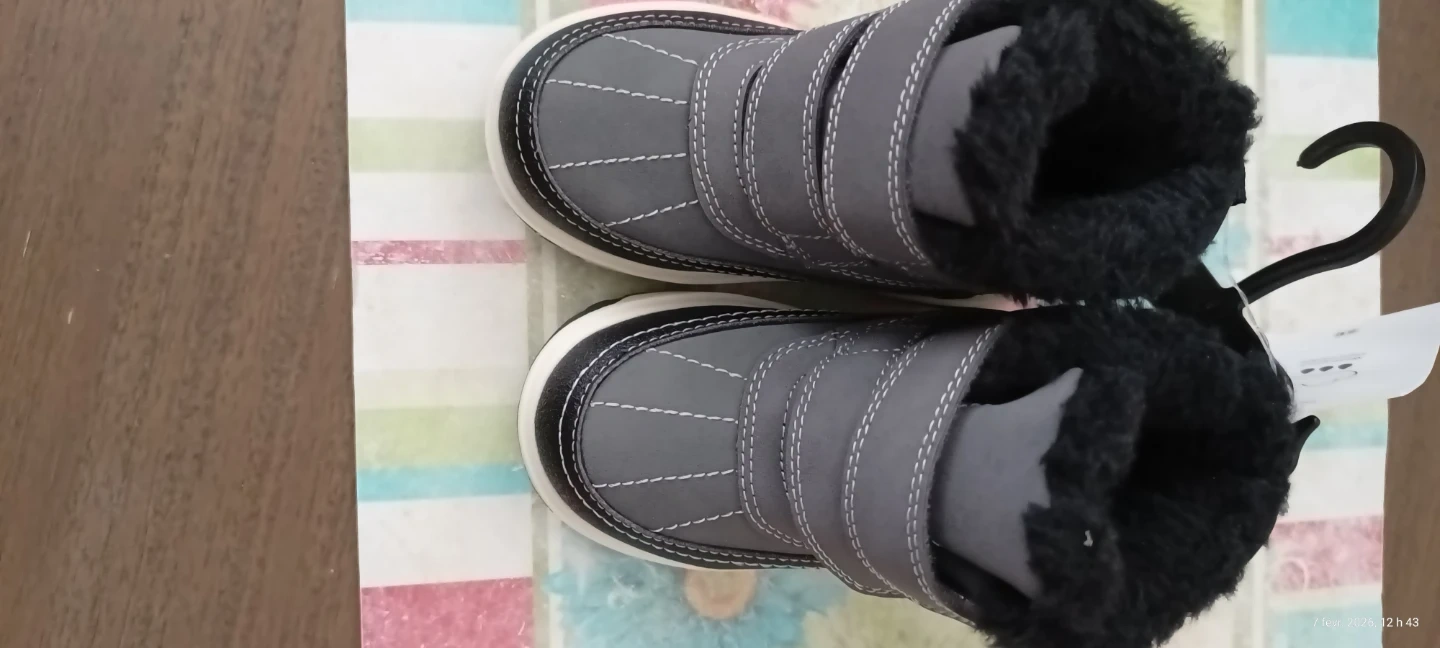 These kids' winter boots are grey with black fuzzy lining for warmth. They have adjustable hook-and-loop straps for an easy fit. The rubber soles offer good traction. These are perfect for keeping little feet warm and dry during colder months!