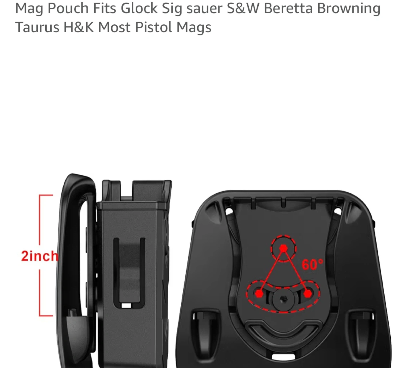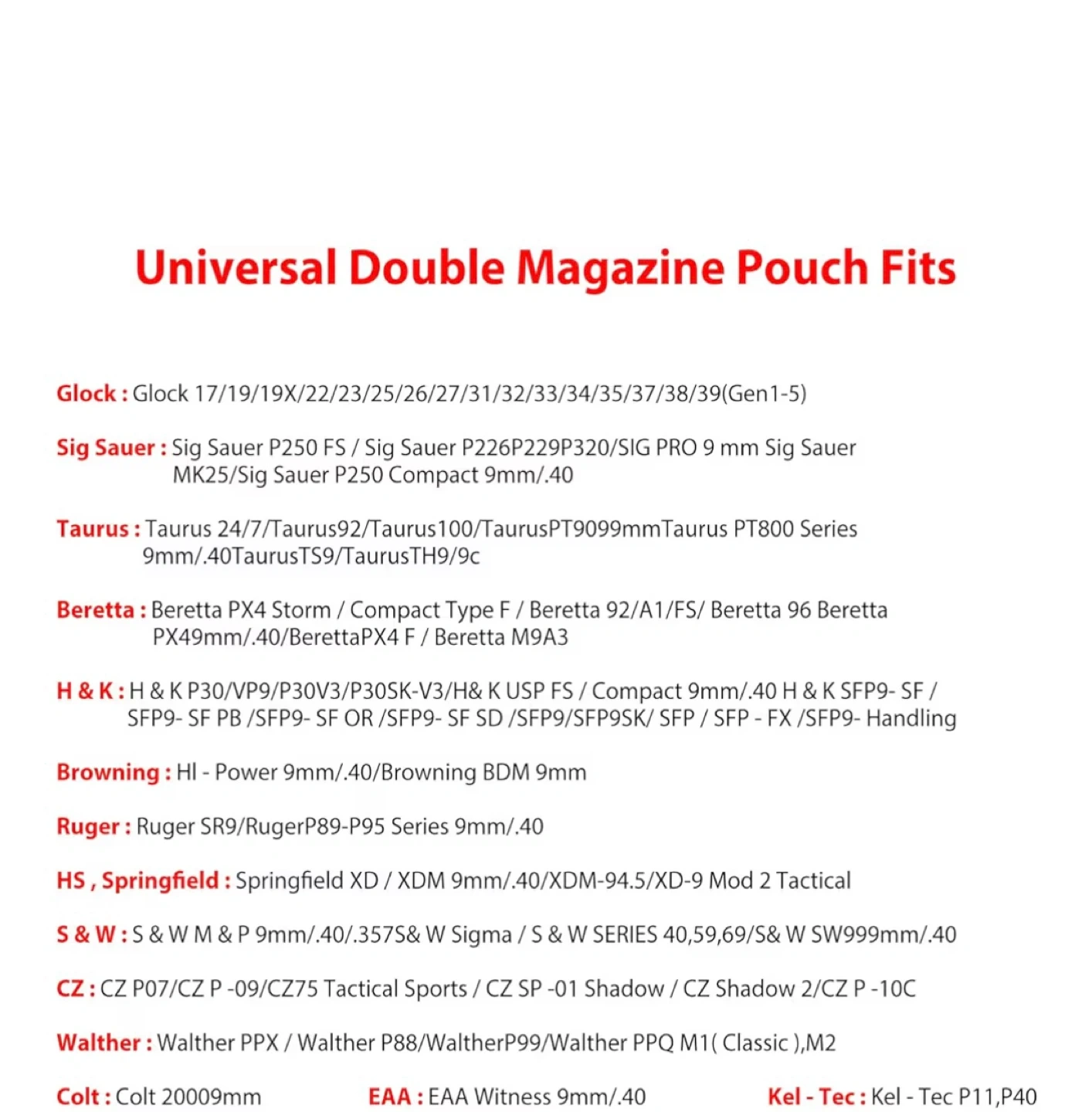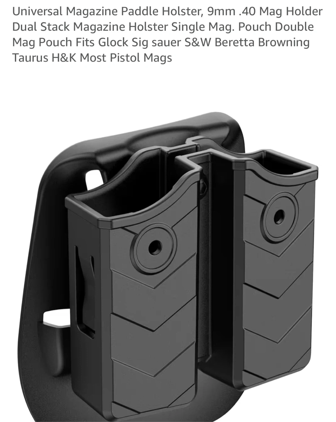 Selling a universal double magazine pouch. It fits Glock, Sig Sauer, Taurus, Beretta, H&K, Browning, Ruger, HS, Springfield, S&W, CZ, Walther, Colt, EAA, Kel-Tec, and more! It's a paddle holster and holds 9mm and .40 mags. The dimensions are 4.53" x 4.33" x 1.77" and it weighs 119g.
