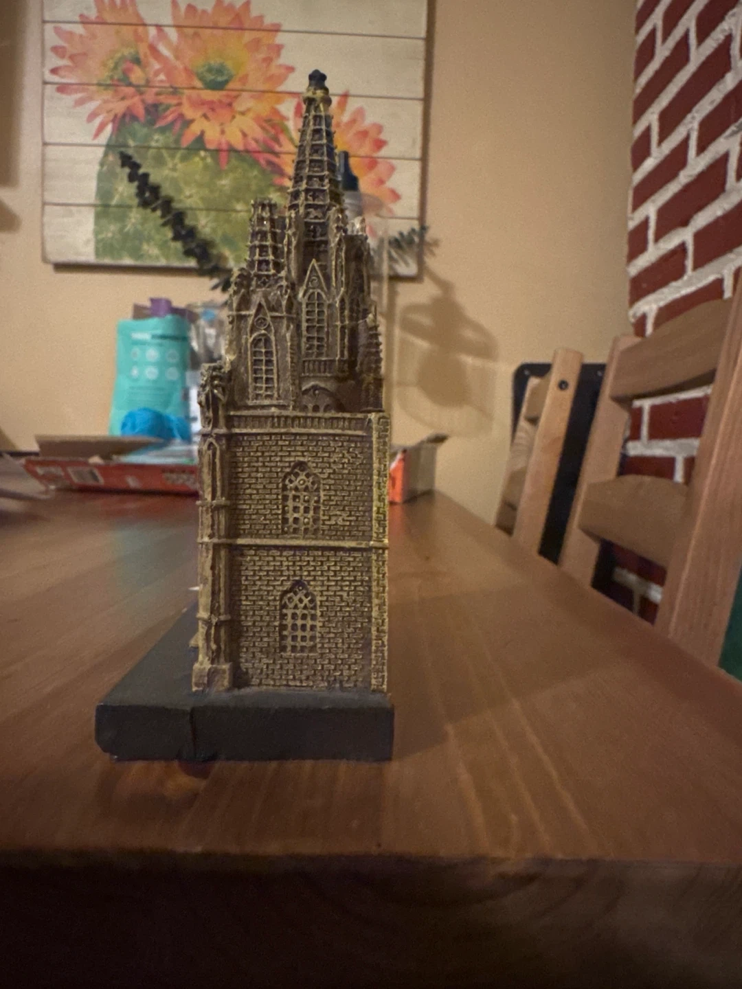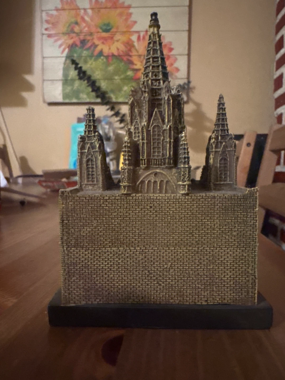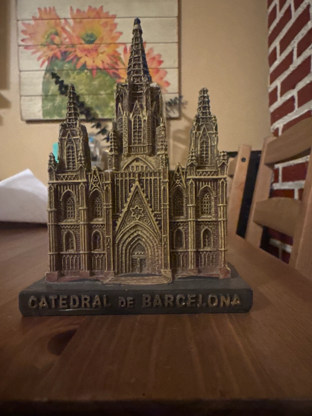 This is a miniature replica of the Cathedral de Barcelona. It's made of a resin-like material with intricate architectural details. The base has 'CATEDRAL DE BARCELONA' inscribed on it. It's a collectible item for travel enthusiasts.