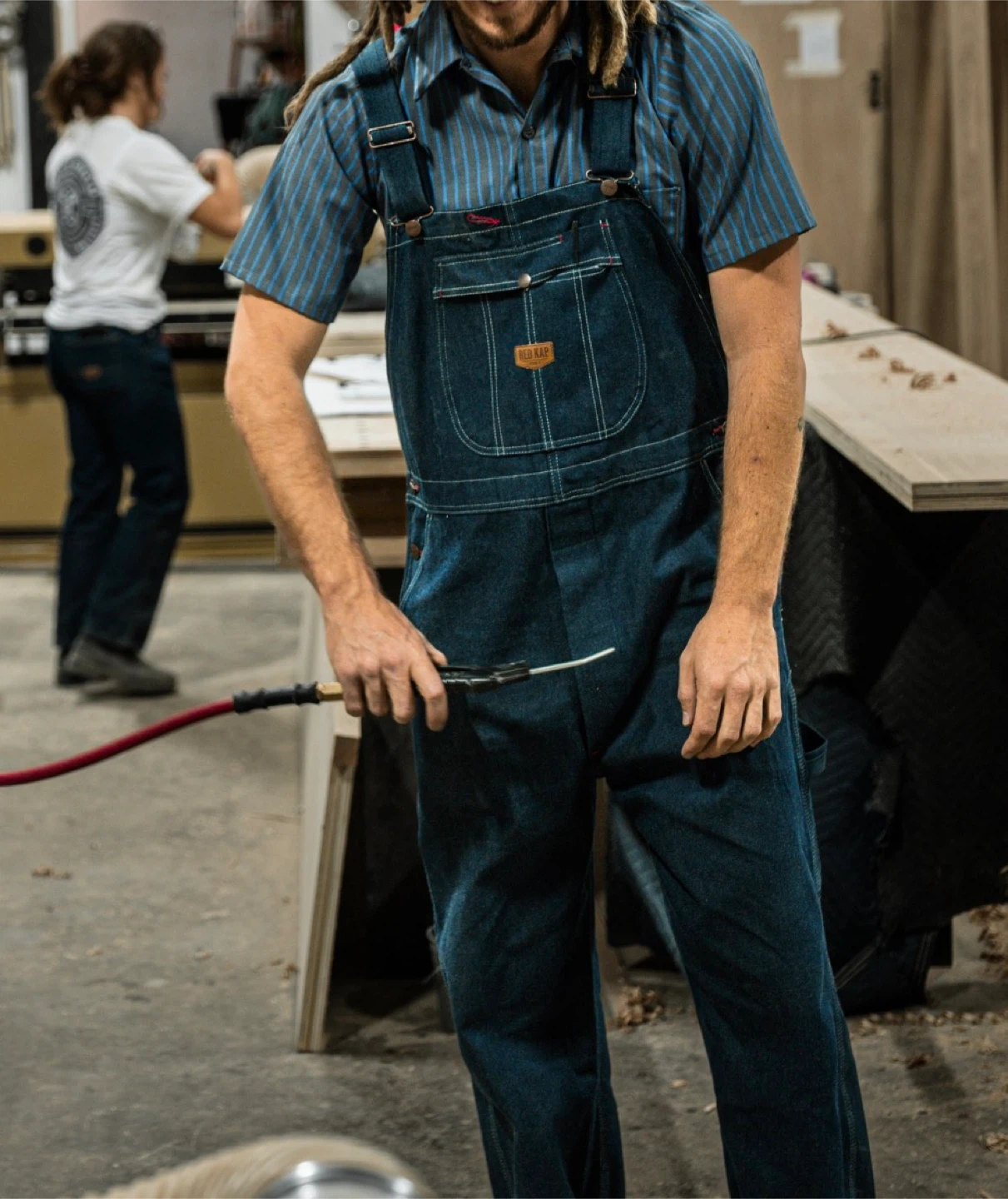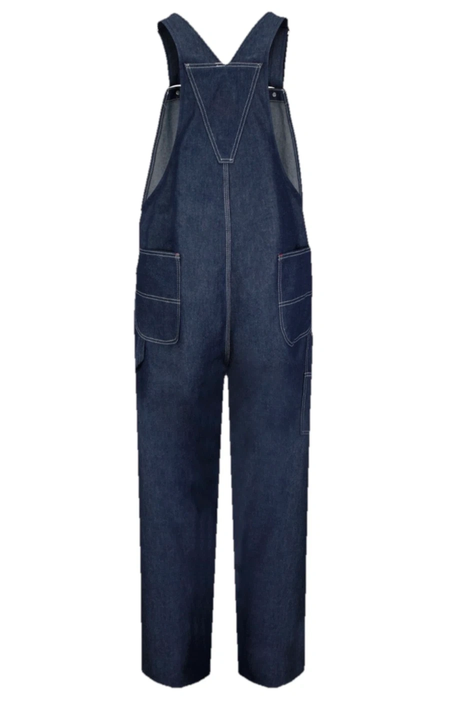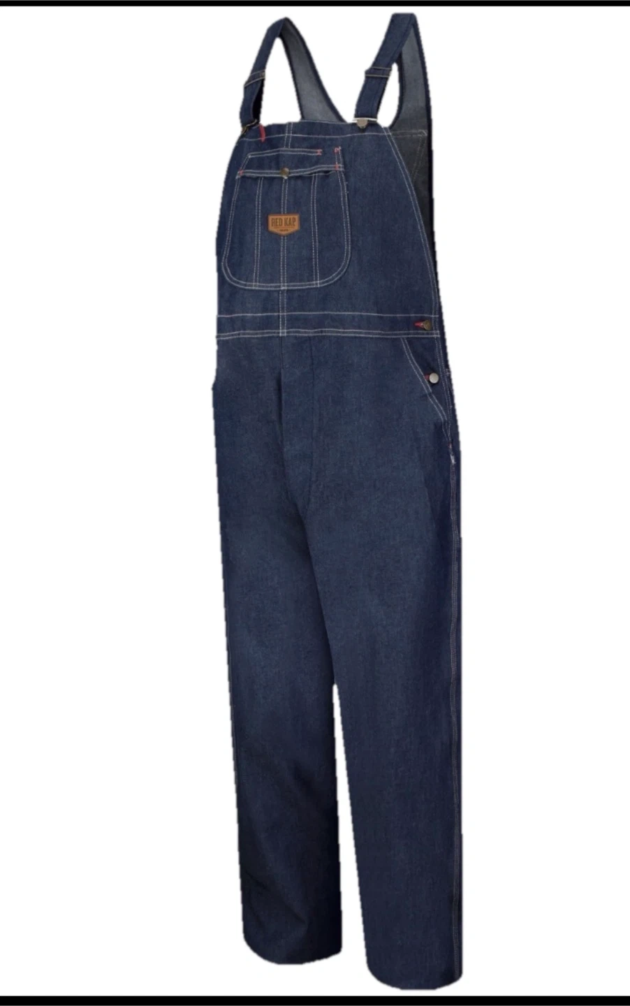 Durable 100% cotton denim bib overalls from Red Kap. Features include adjustable straps, a bib pocket, and multiple tool pockets. Made in USA. Machine wash, tumble dry.