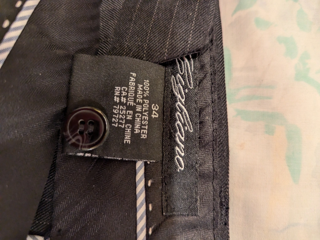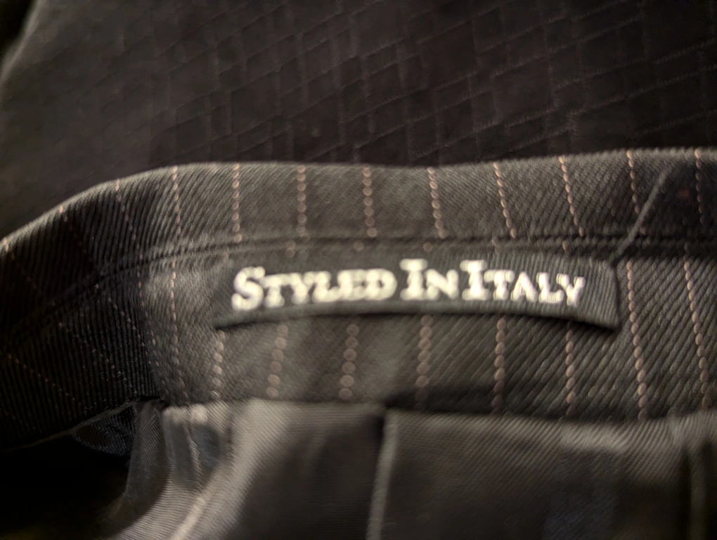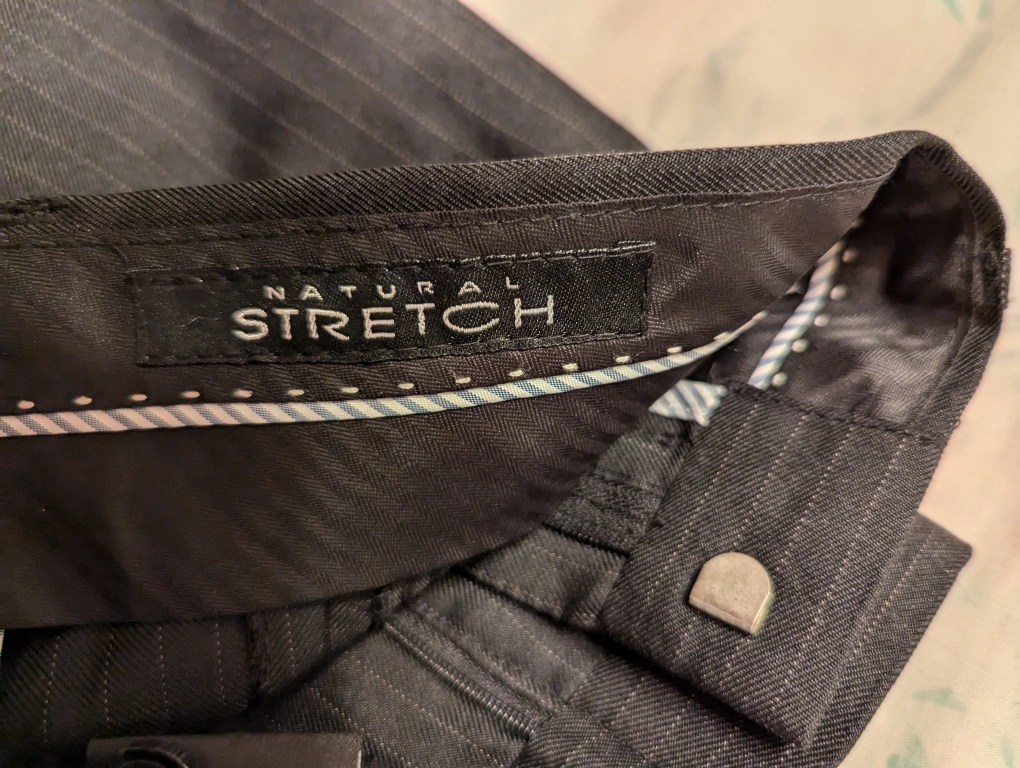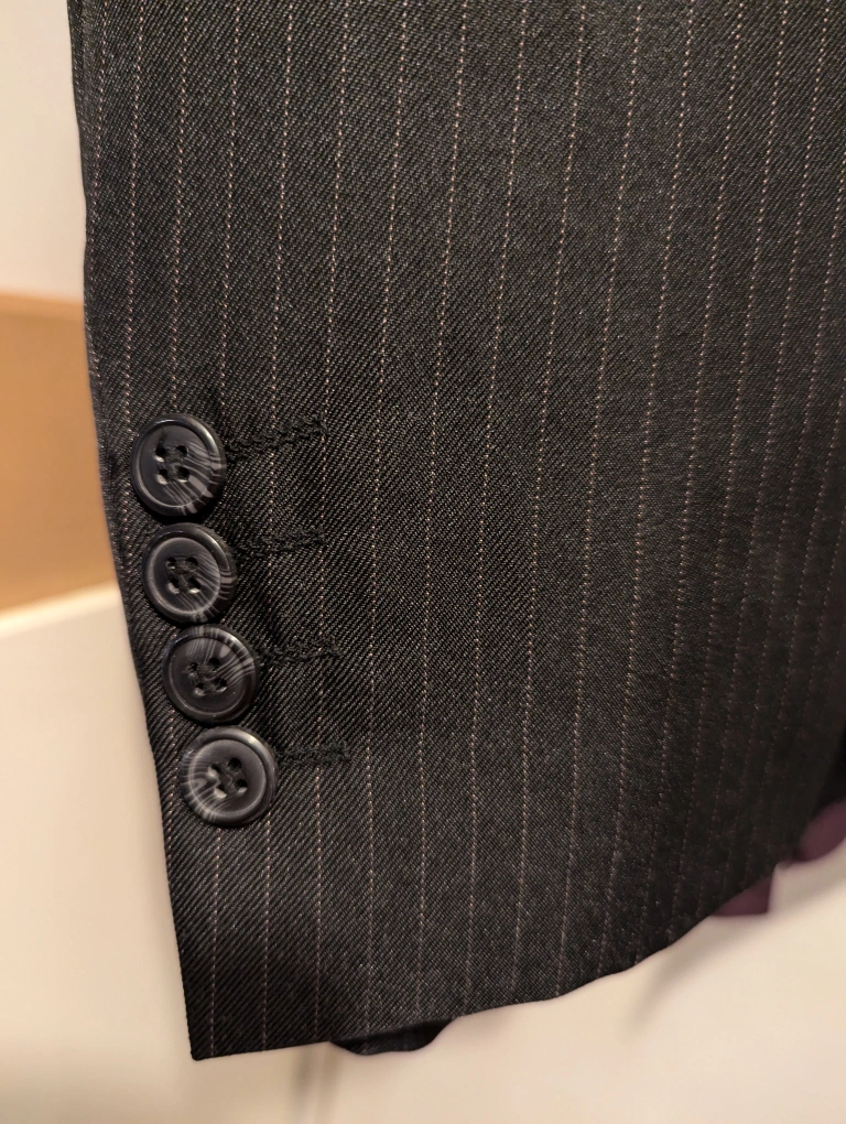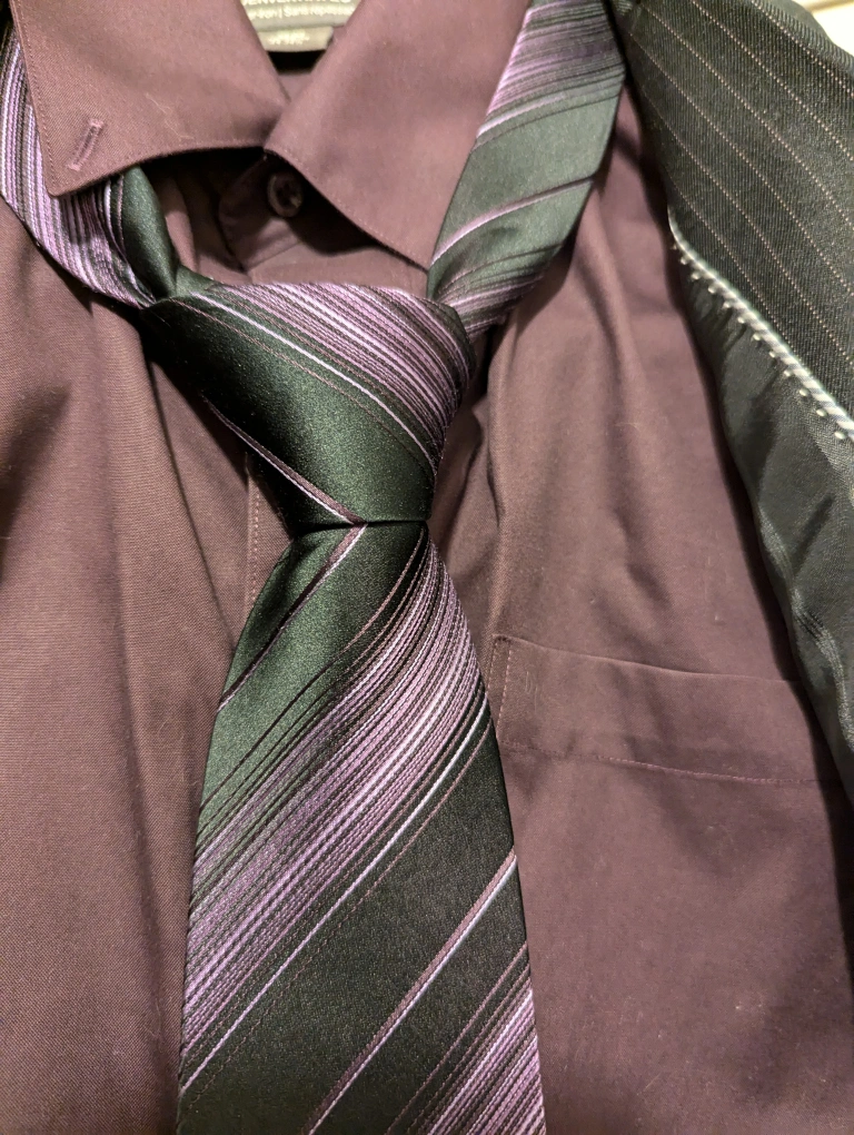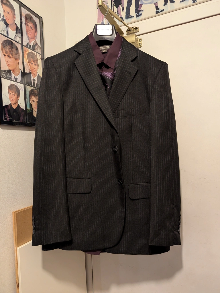 Charcoal suit with thin pinstripes. Includes matching non-iron purple shirt and tie. The suit and the shirt are size medium. Trousers are 34 x 32.