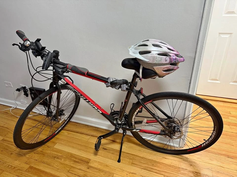 Schwinn Circuit bike, model S5736TG. Black, red, and white. Aluminum frame. Barely used, still has protective stickers. Includes helmet, lock, cellphone holder, front and back LED lights, comfortable saddle seat, bell/horn, and bottle holder.