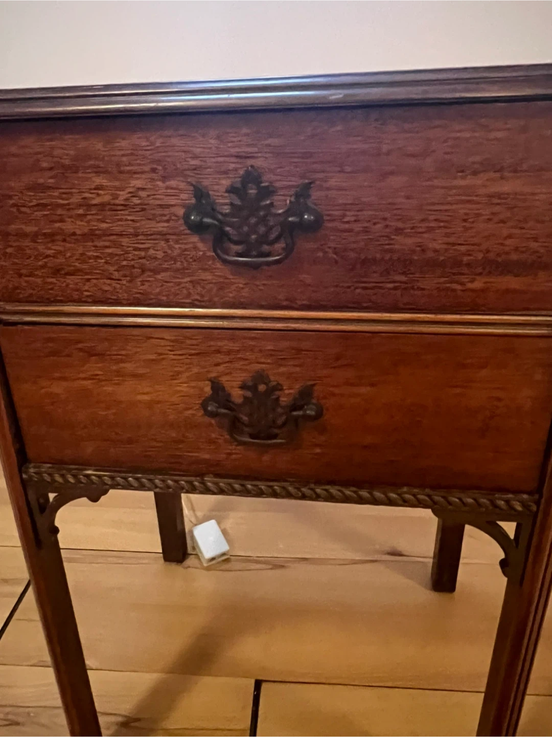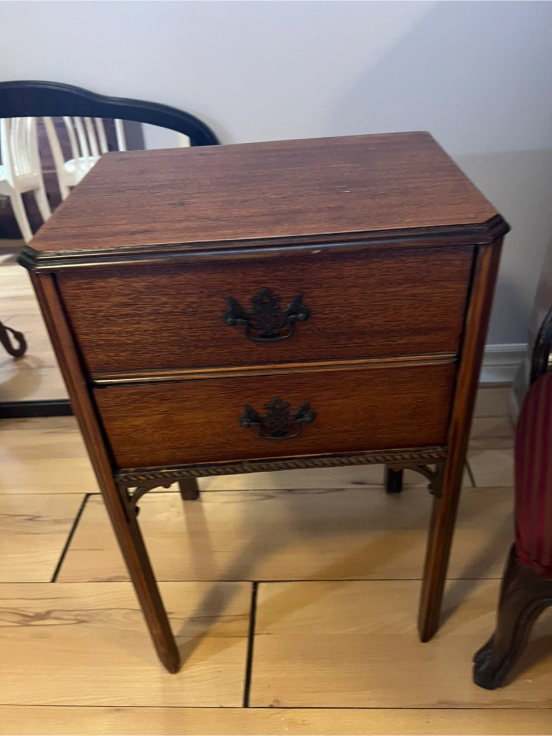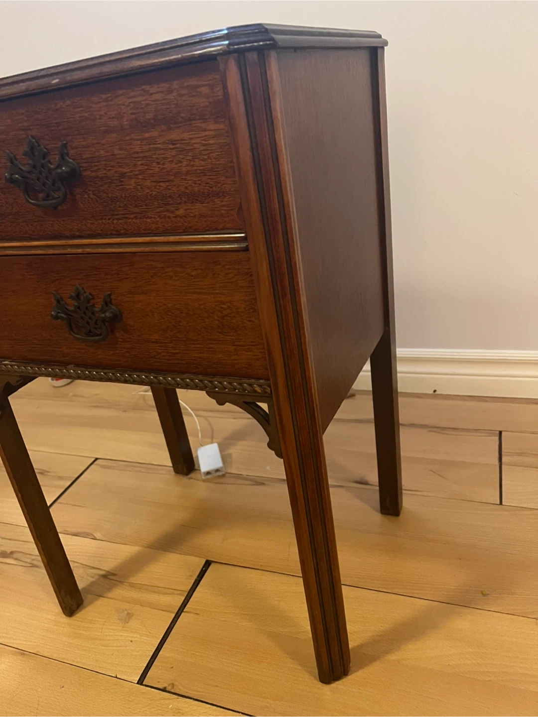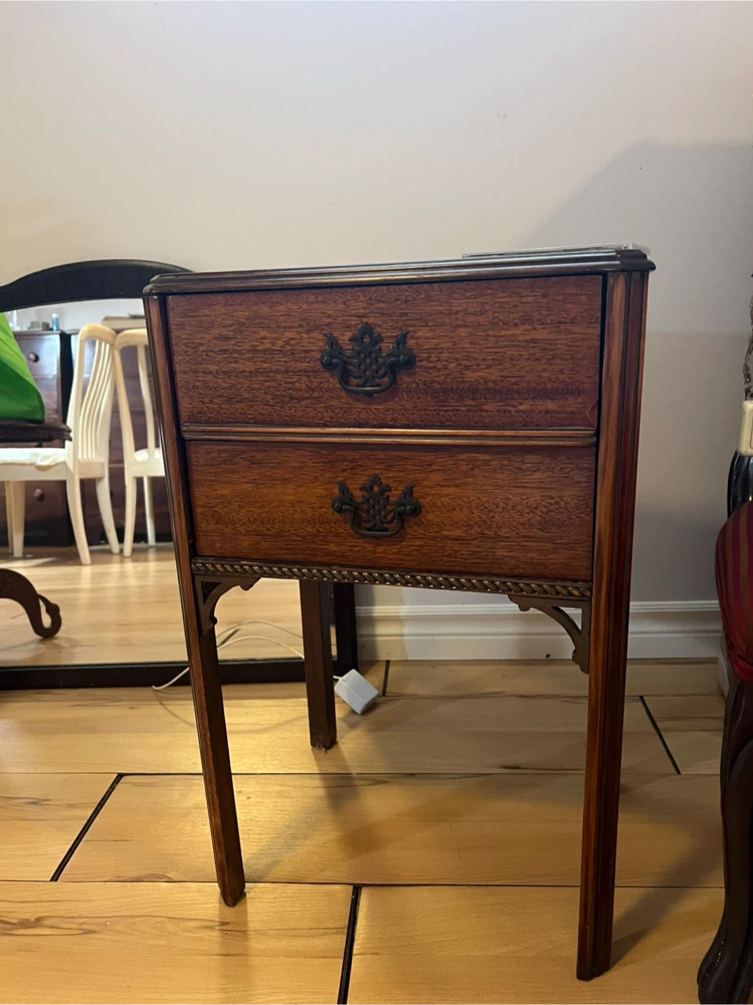 Here's a lovely wooden side table with two drawers! It's perfect for adding a touch of classic style to any room. The drawers provide handy storage, and the wood finish gives it a warm, inviting look