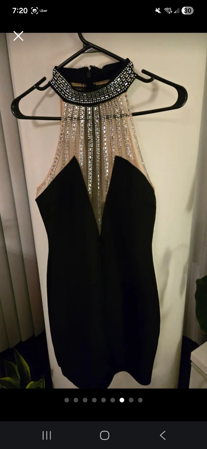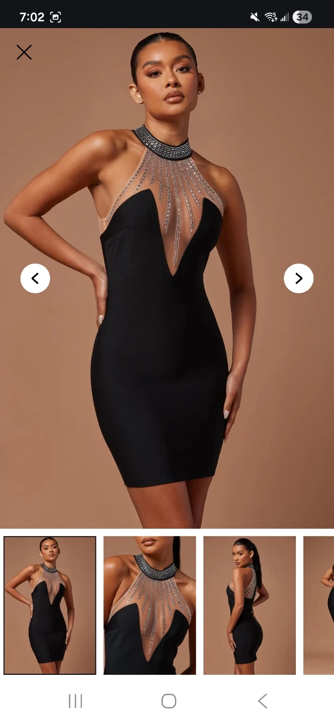 This black halter dress features a stunning embellished neckline with rhinestone detailing. It has a plunging V-neck design and a form-fitting silhouette. Made for a stylish evening out! Fashion Nova.