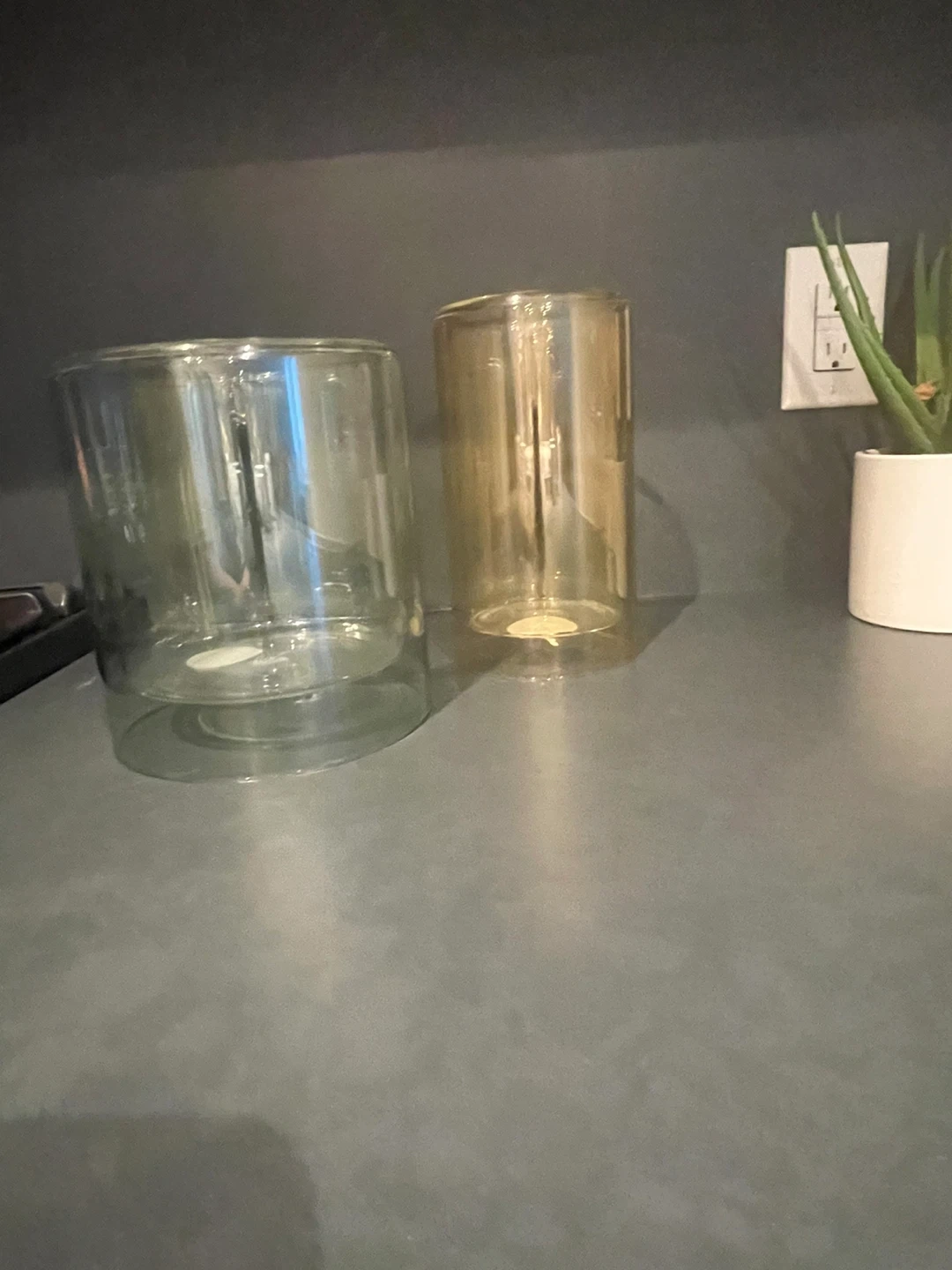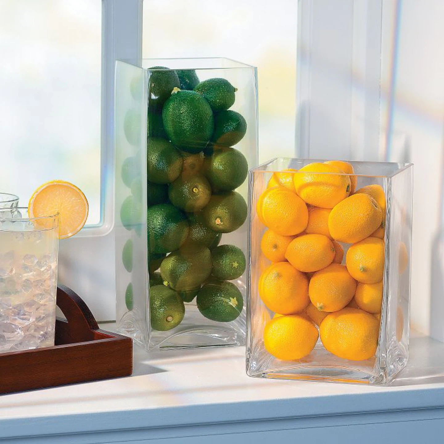Two glass tumblers, one green and one yellow. They're perfect as flower vases or decorative pieces. Glass material. Want to create a statement piece, fill these vases with lemons and limes