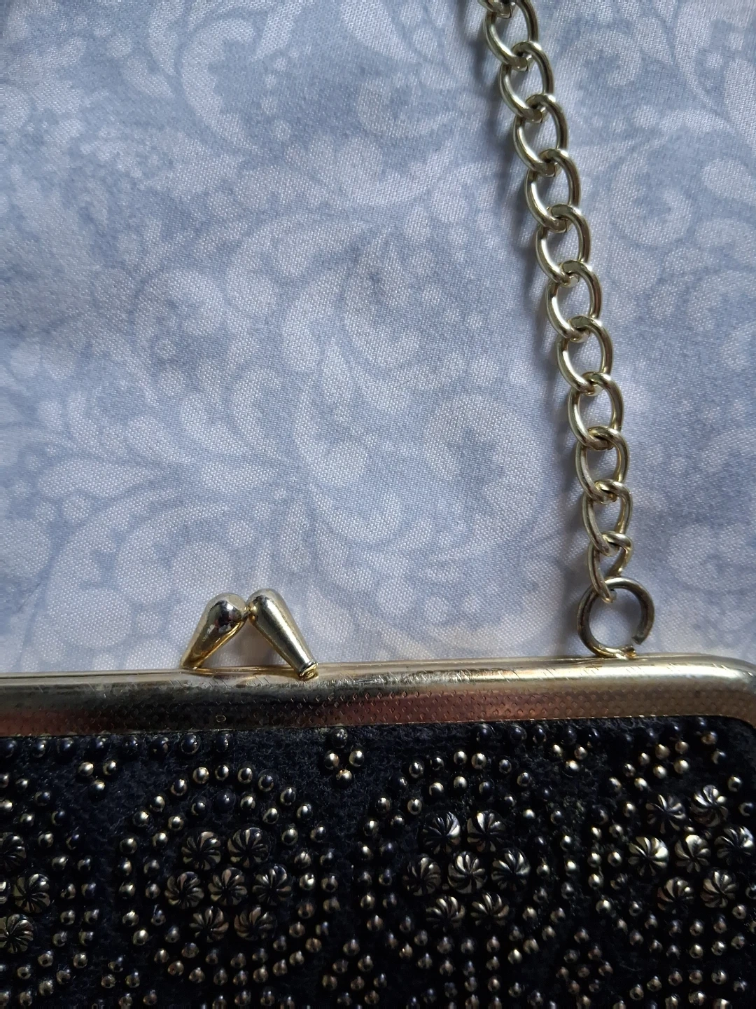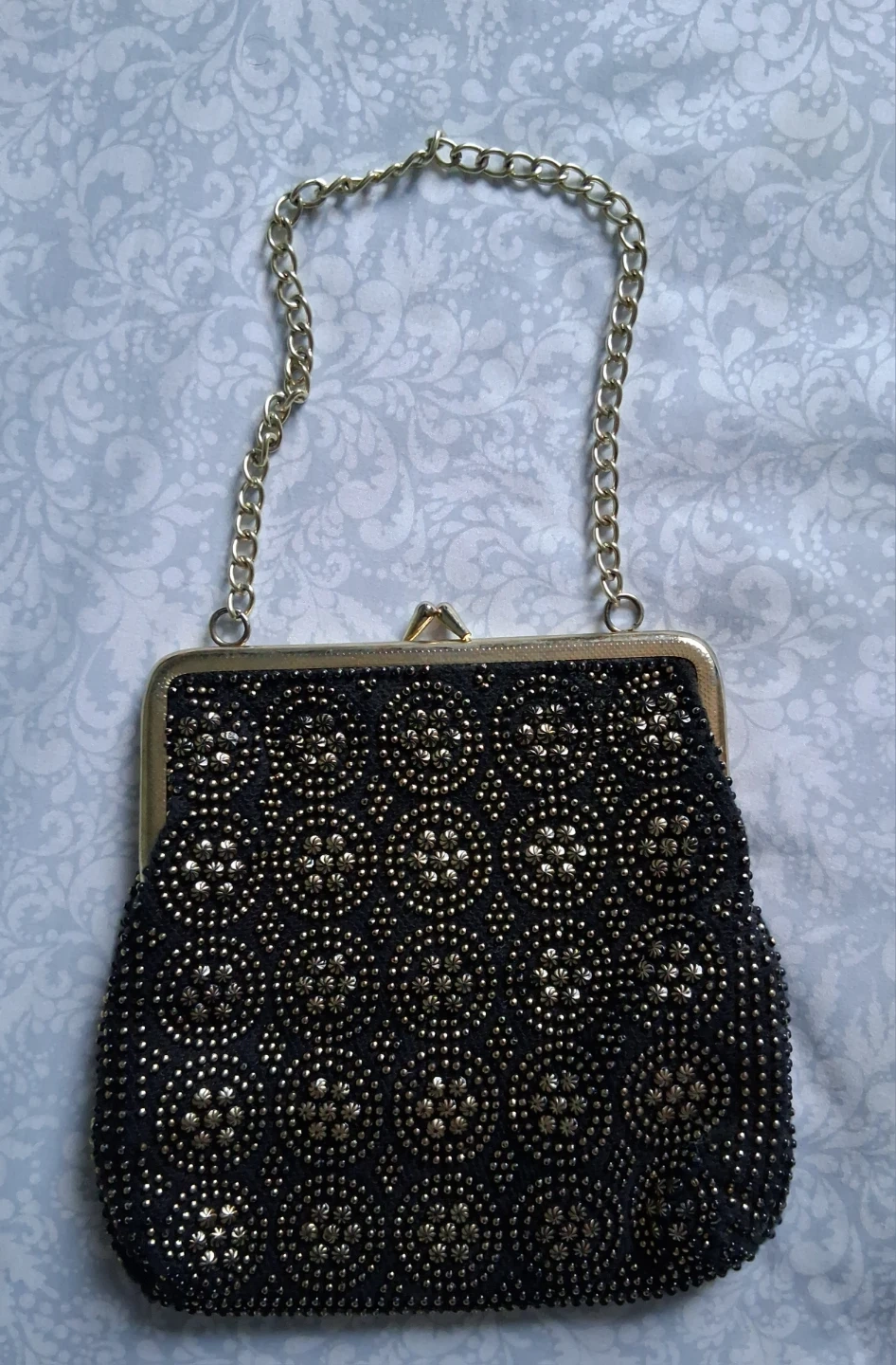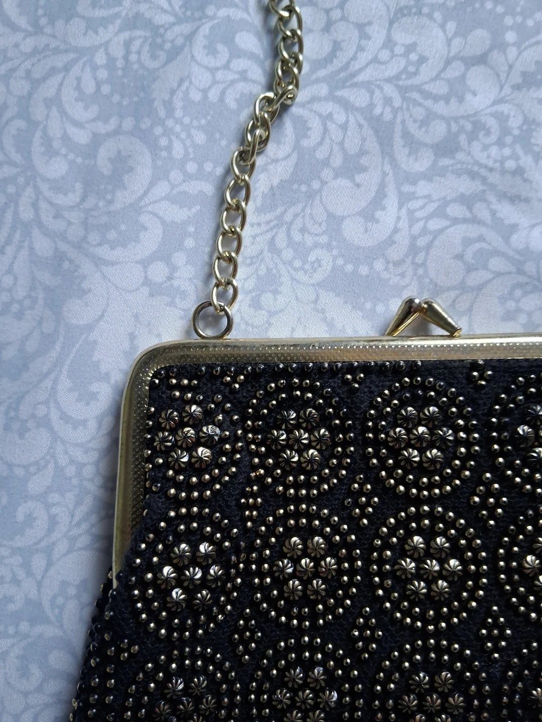 Vintage Black beaded evening clutch features a decorative gold-tone beaded pattern all over. It has a gold-tone frame and a detachable chain strap. Clasp closure. It's a stylish accessory for formal occasions!