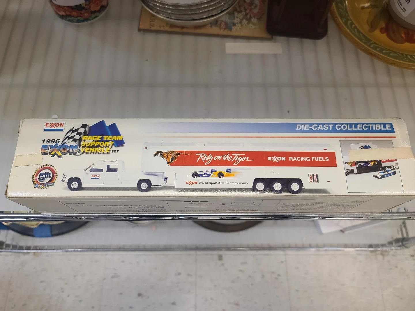 This is a 1996 Exxon Race Team Support die-cast vehicle set. It's part of the Exxon World SportsCar Championship collection. The set includes a truck and trailer.