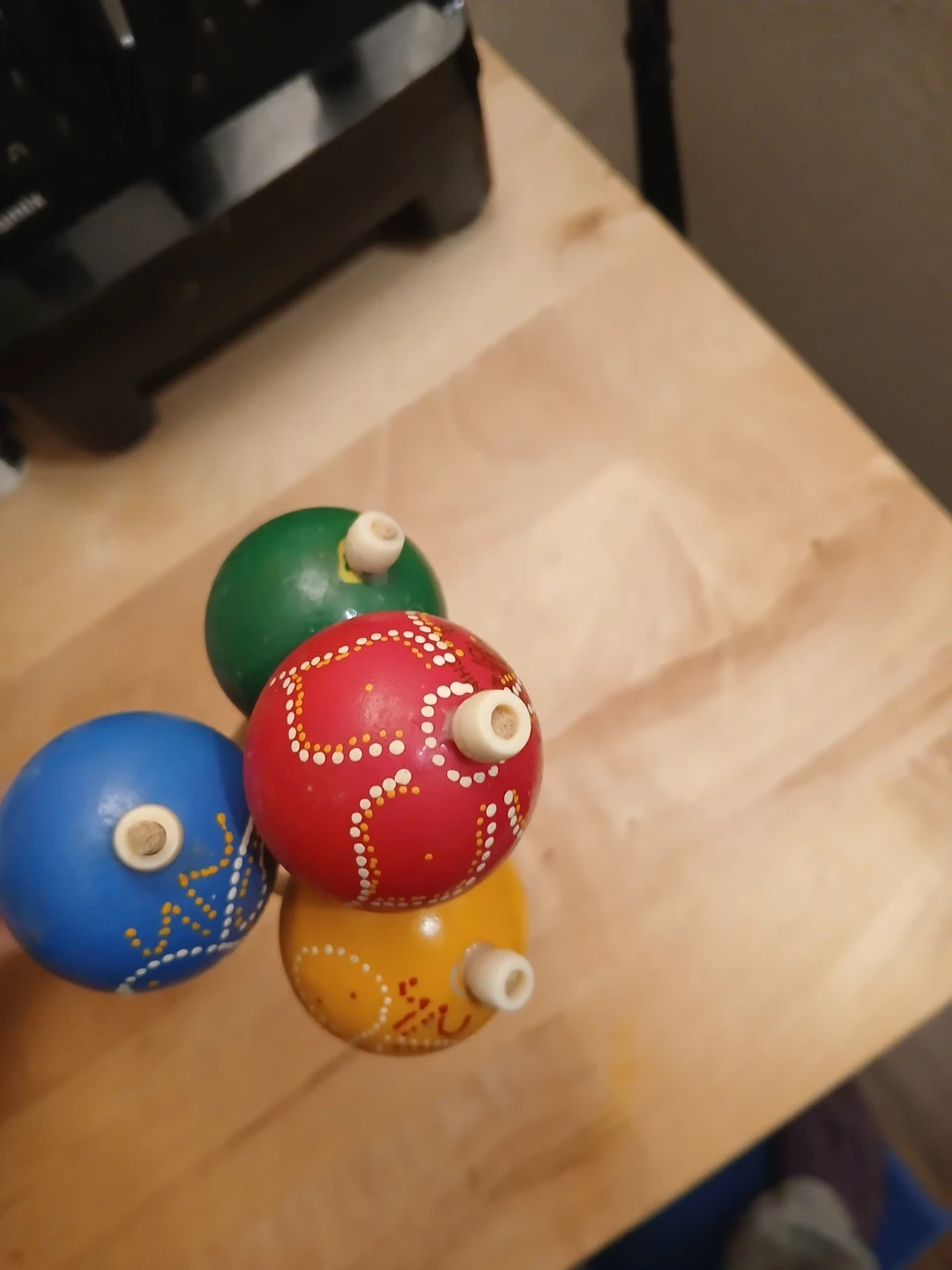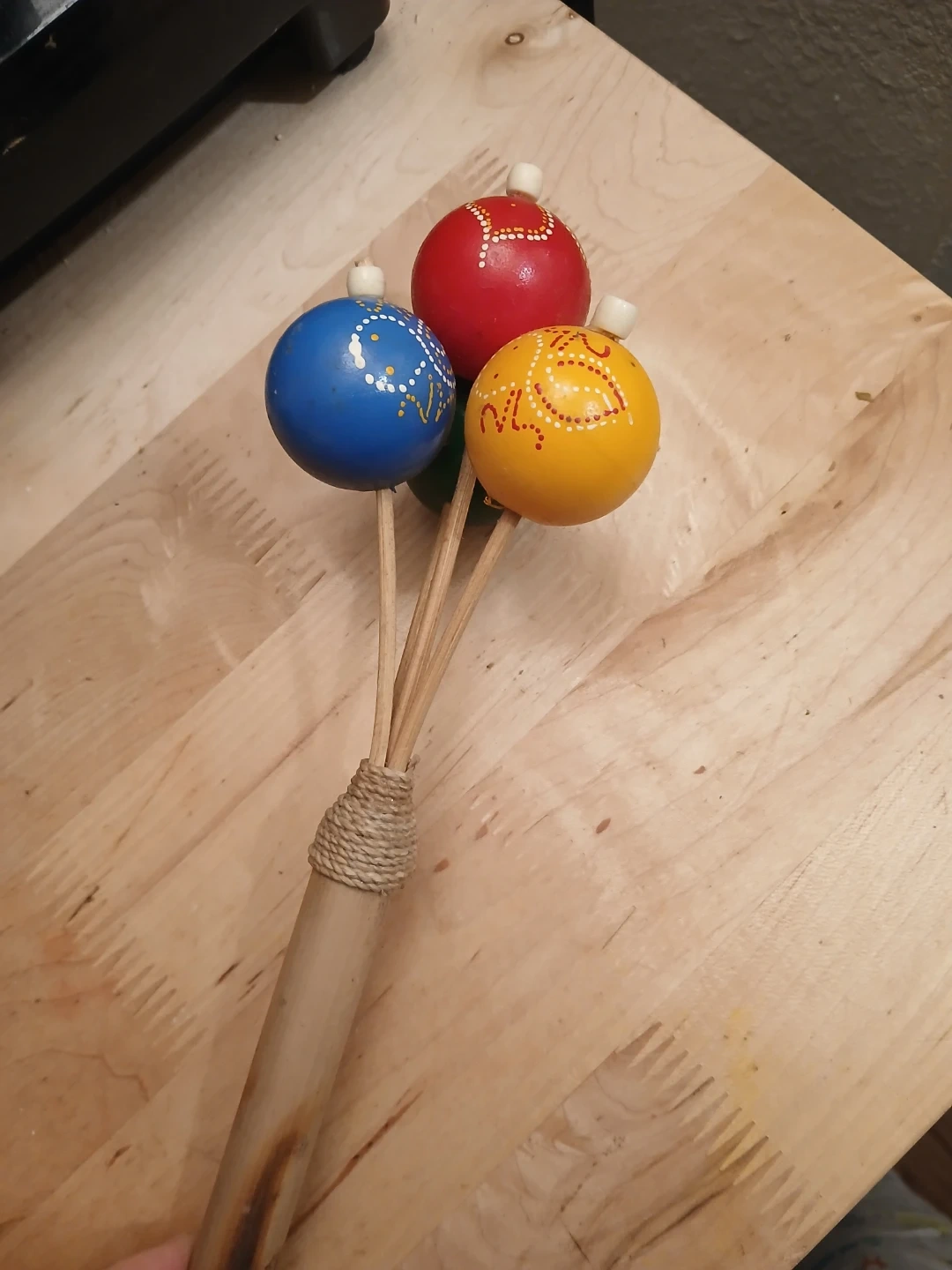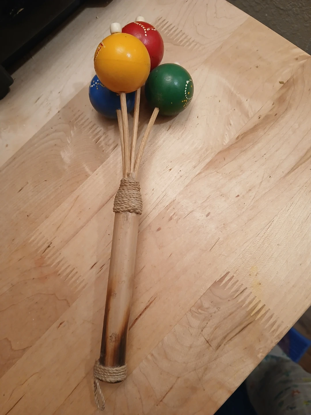 This is a handmade wooden maraca. It features four colorful balls attached to a bamboo handle. The balls are red, blue, yellow, and green, each with decorative painted dots. This toy is great for babies and toddlers to explore sounds and textures! Or for adults as a percussion instrument