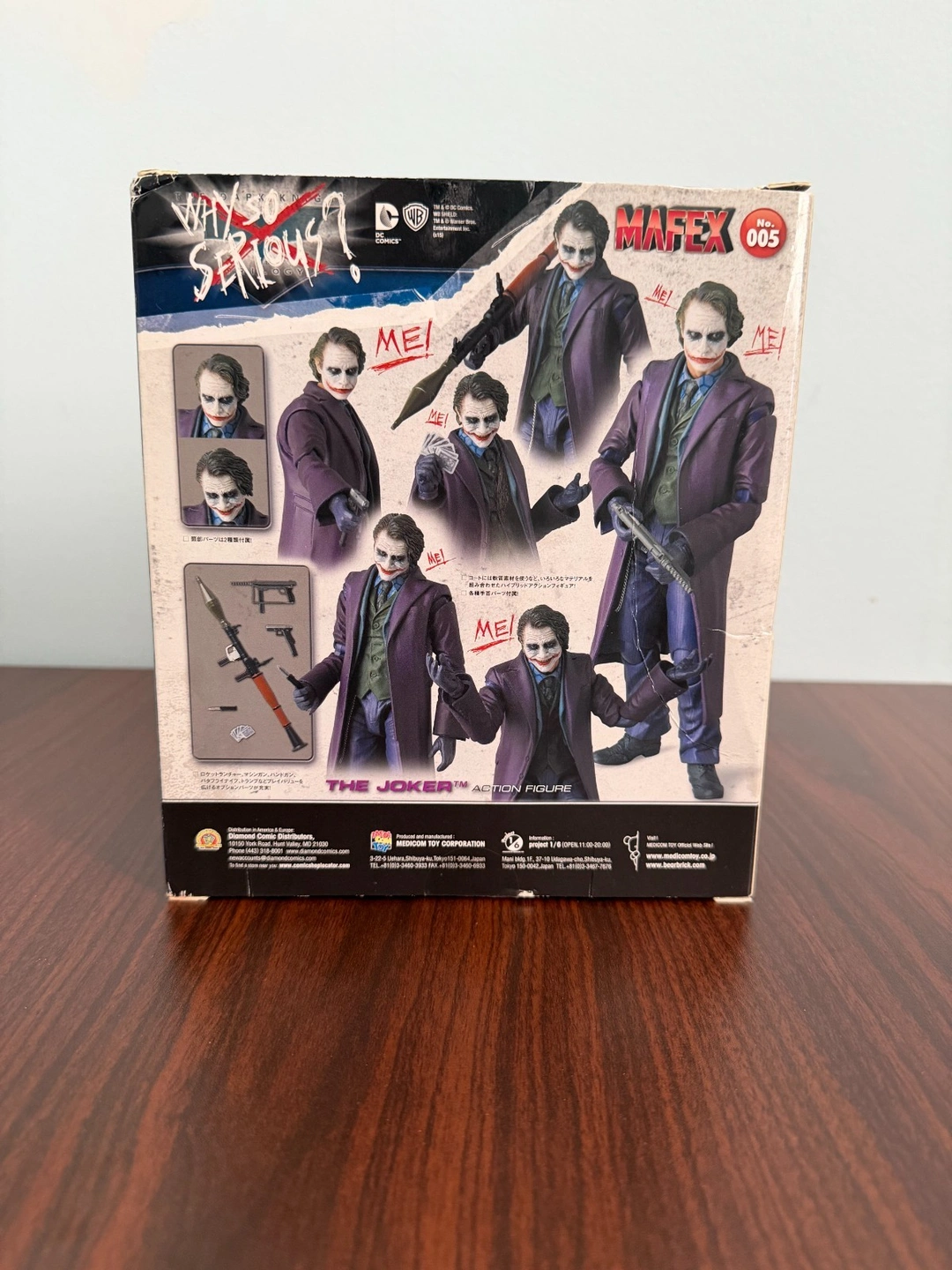 Stored and displayed in a smoke-free and pet-free home. Box shows wear from multiple moves. Figure is in excellent condition. Missing playing cards accessory only — all other accessories and original box included. Authentic Medicom MAFEX. Includes Figure Stand and Accessories. Year Manufactured: 2015. Movie: The Dark Knight. Character: Joker. Scale: 1:12. Material: Plastic. Brand: Medicom Toy. Series: Batman : The Dark Knight Trilogy. Type: Action Figure. Year: 2015. Packaging: Original (Opened). Model: MAFEX.