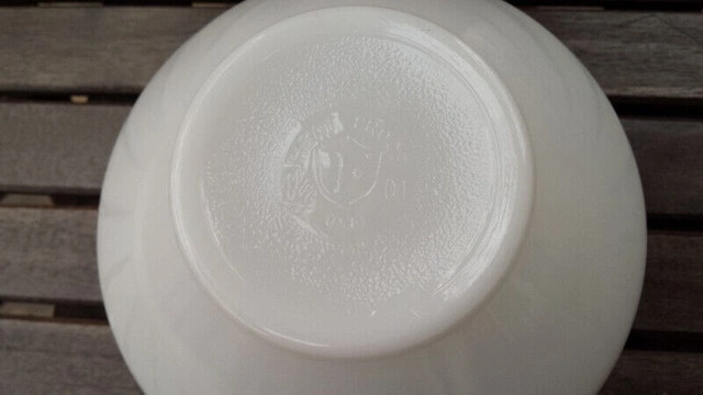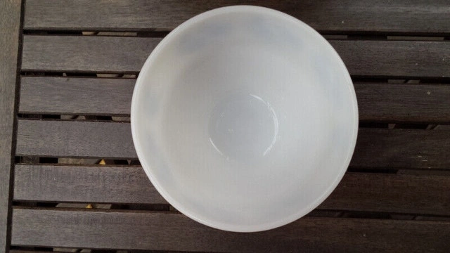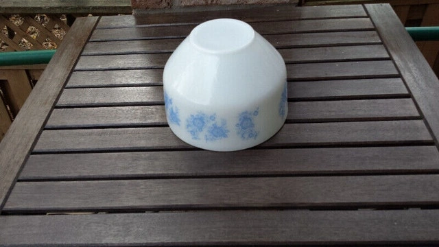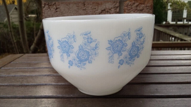 Really good condition glass bowl, white with blue flowers. The size is 1.5 quarts, with the "F" logo stamped on bottom. $10.00, pick up only.