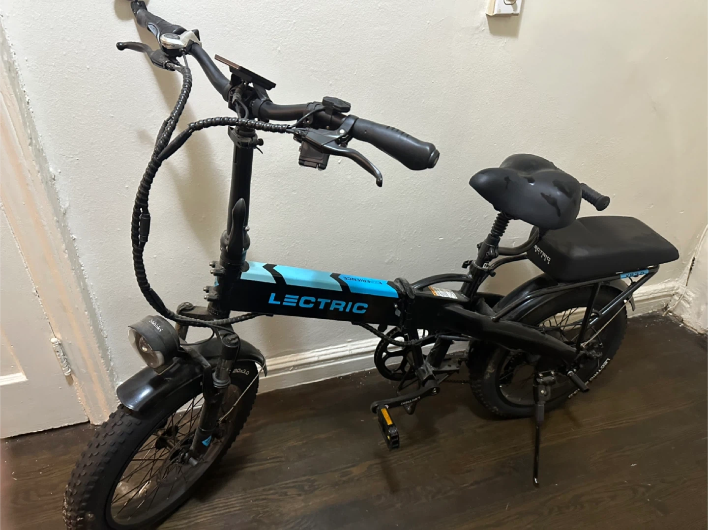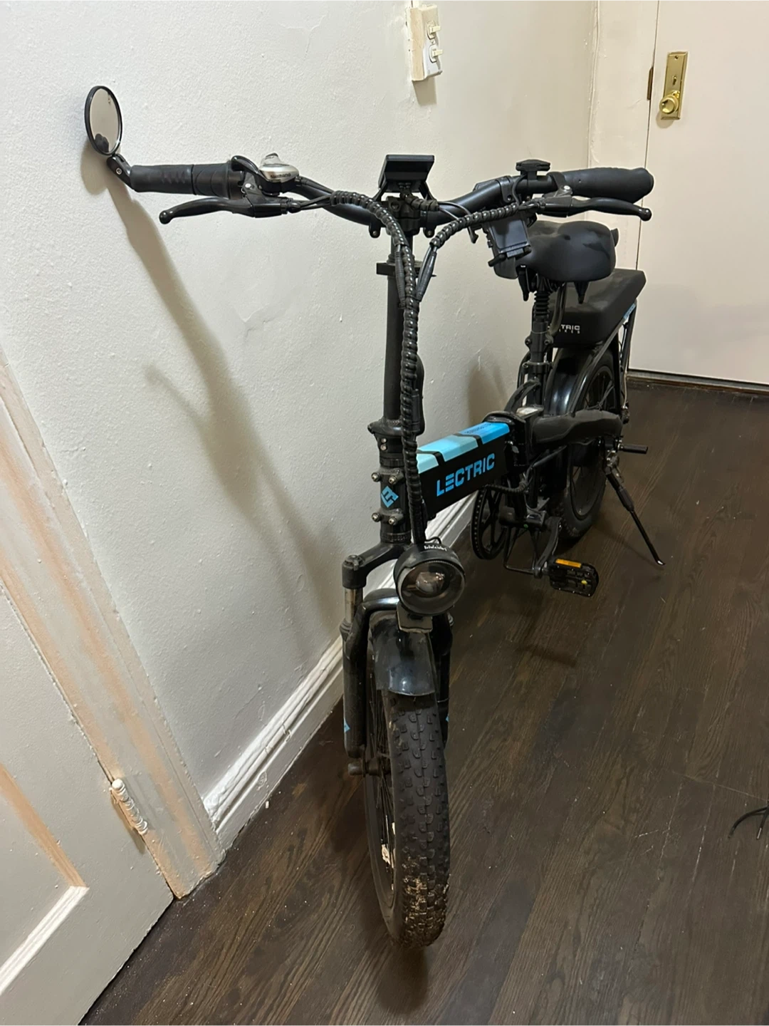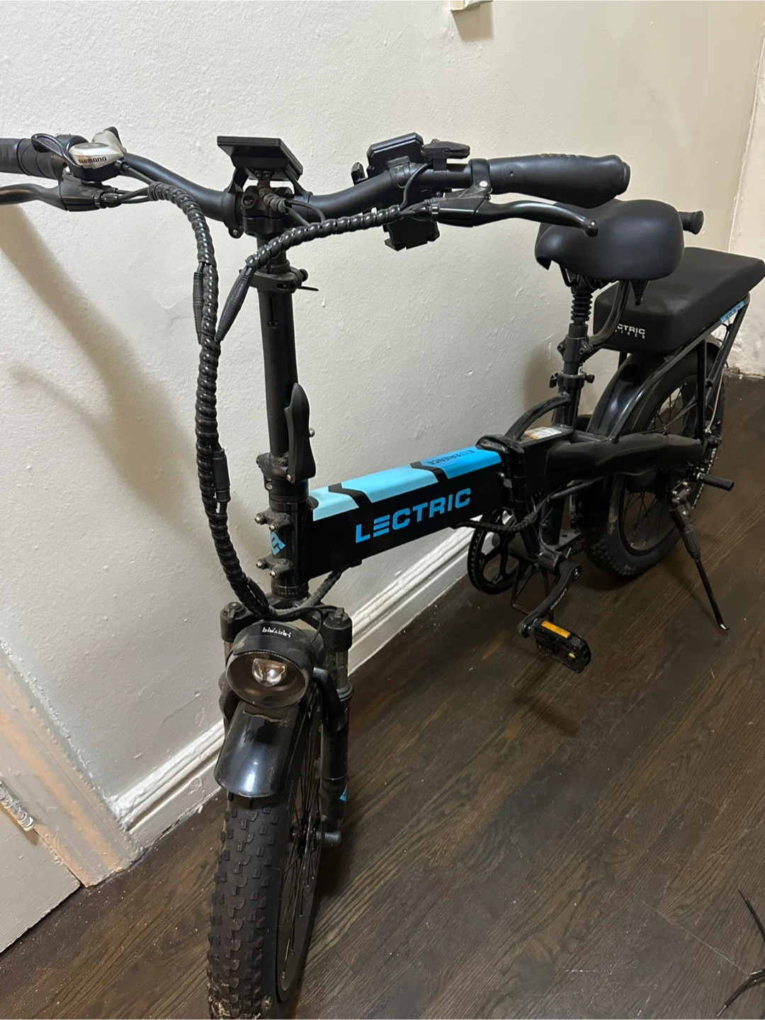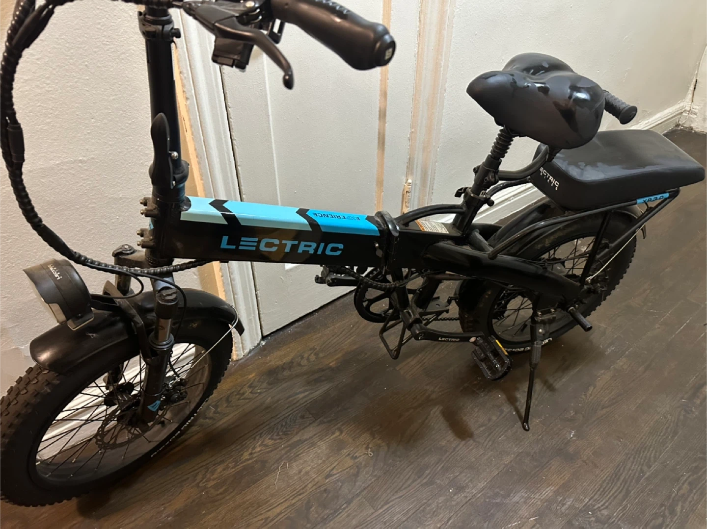 Lectric XP electric folding bike with fat tires. This bike's frame folds for easier storage and transport. It's equipped with a headlight and a rear rack. It also comes with a passenger seat, extra seat, side mirrors, brake replacement kit, lock and phone holder. Price negotiable.