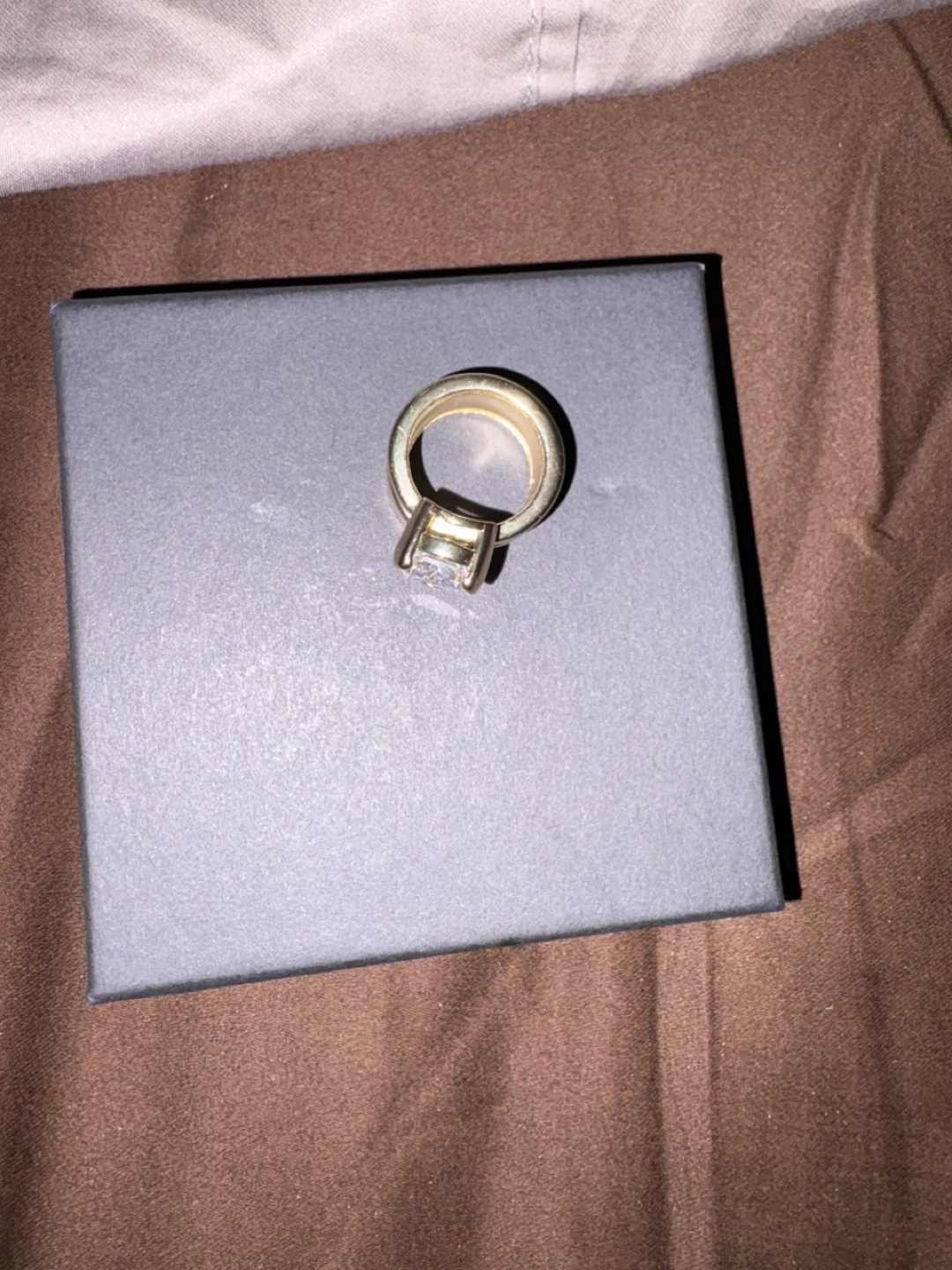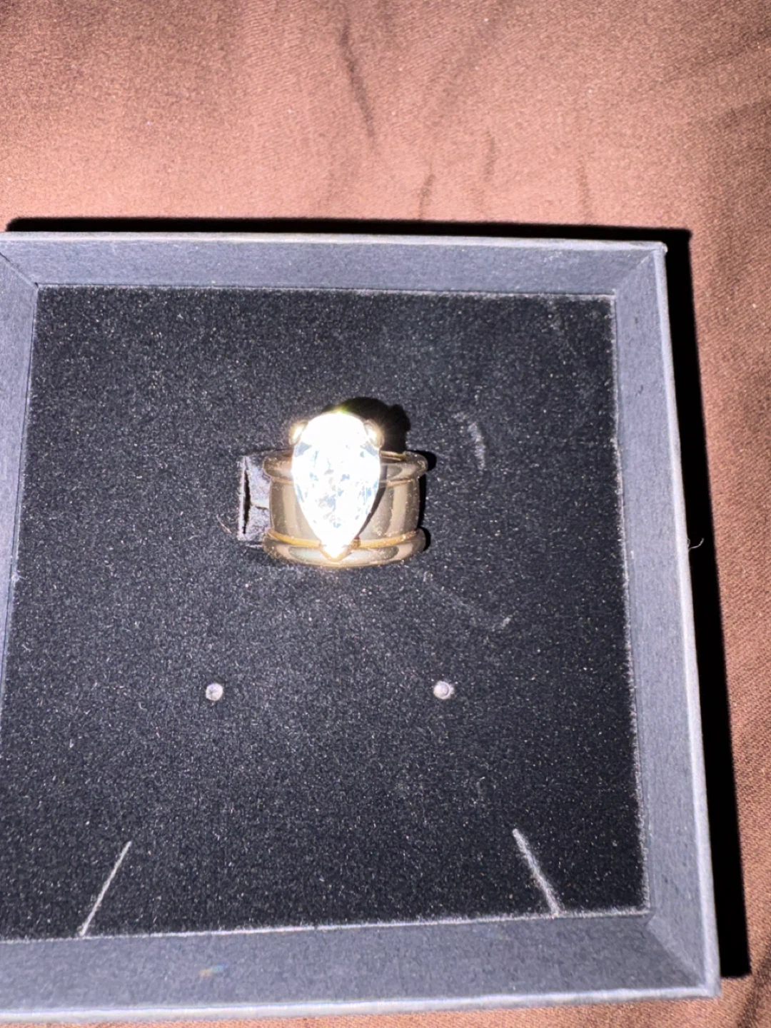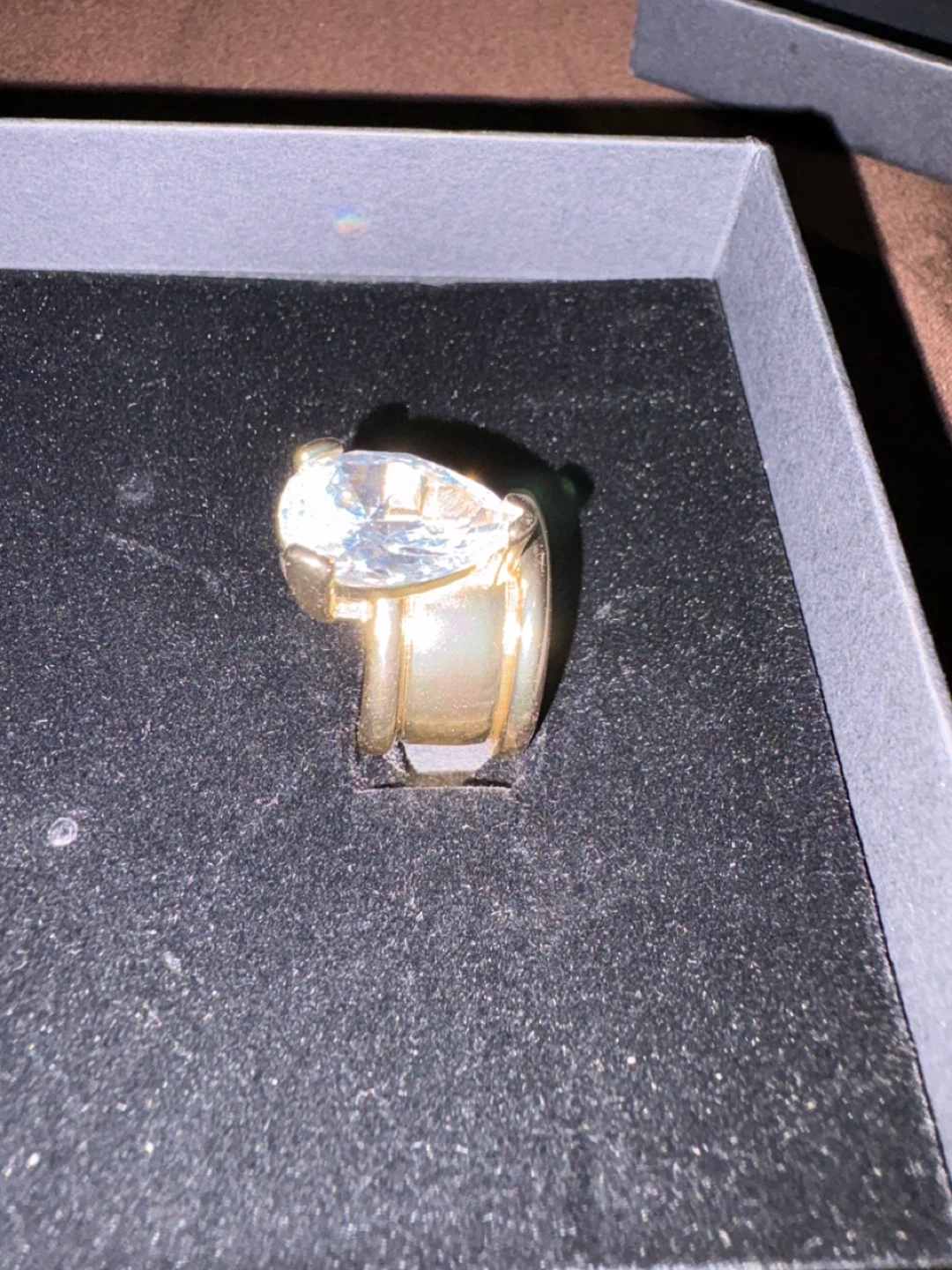 This gold-tone ring features a large pear-shaped clear crystal. It comes with its original presentation box. This ring would be a nice addition to any jewelry collection. This is high quality fashion jewelry no real gems or stones .
