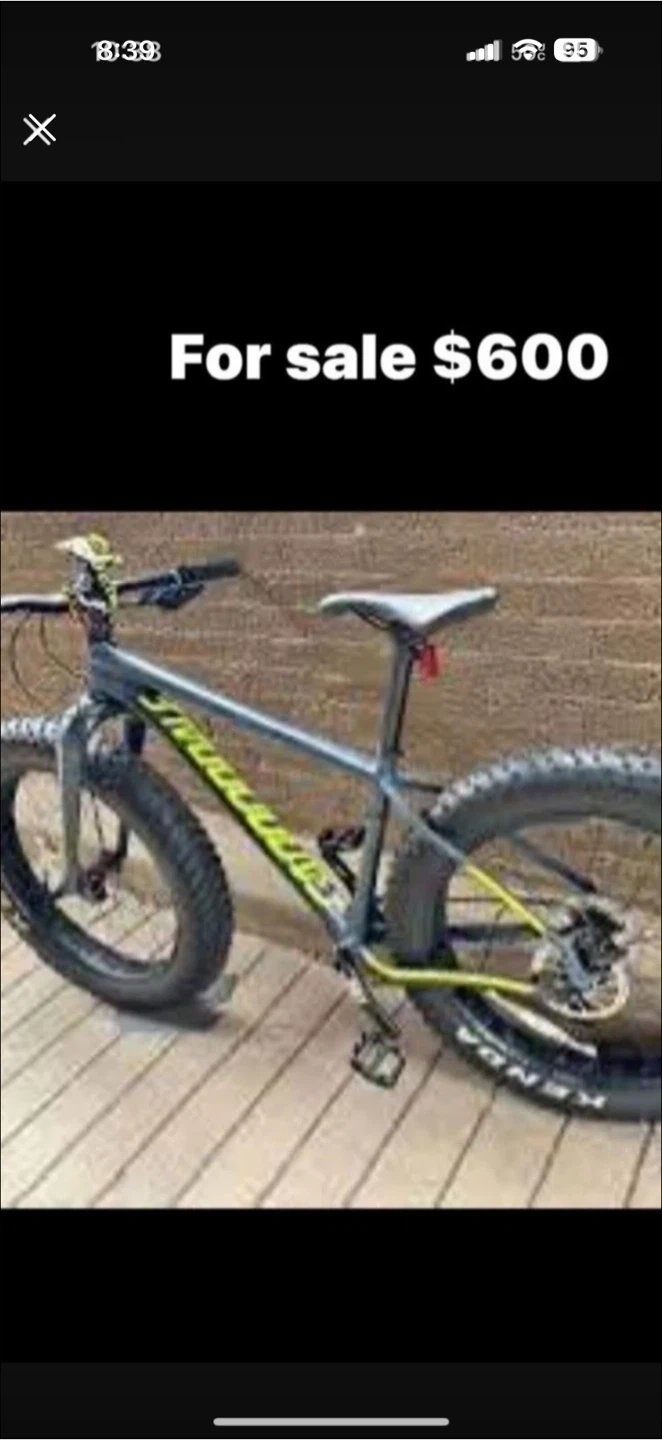 This is a Specialized fat tire mountain bike. It has a dark gray frame with yellow accents. The tires are Kenda brand, indicating it's ready for tough terrain. Great for off-road adventures!