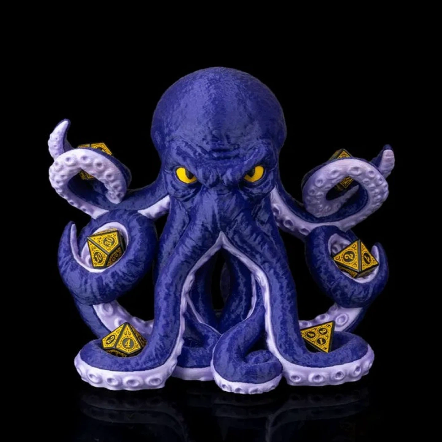 This cool octopus figure holds dice in its tentacles. It's a deep blue colour with yellow eyes. Perfect for tabletop gamers! Each item is 3D printed with care and attention to detail. Due to the nature of the printing process, slight layer lines or color variations may be present, giving every Tentacritical its own unique character.Perfect for: