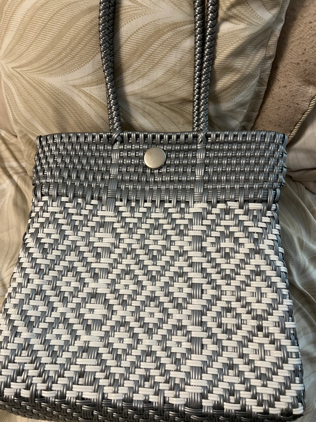 This tote bag is woven with a silver and white pattern. It features braided handles and a silver snap closure. It's a stylish accessory for everyday use!