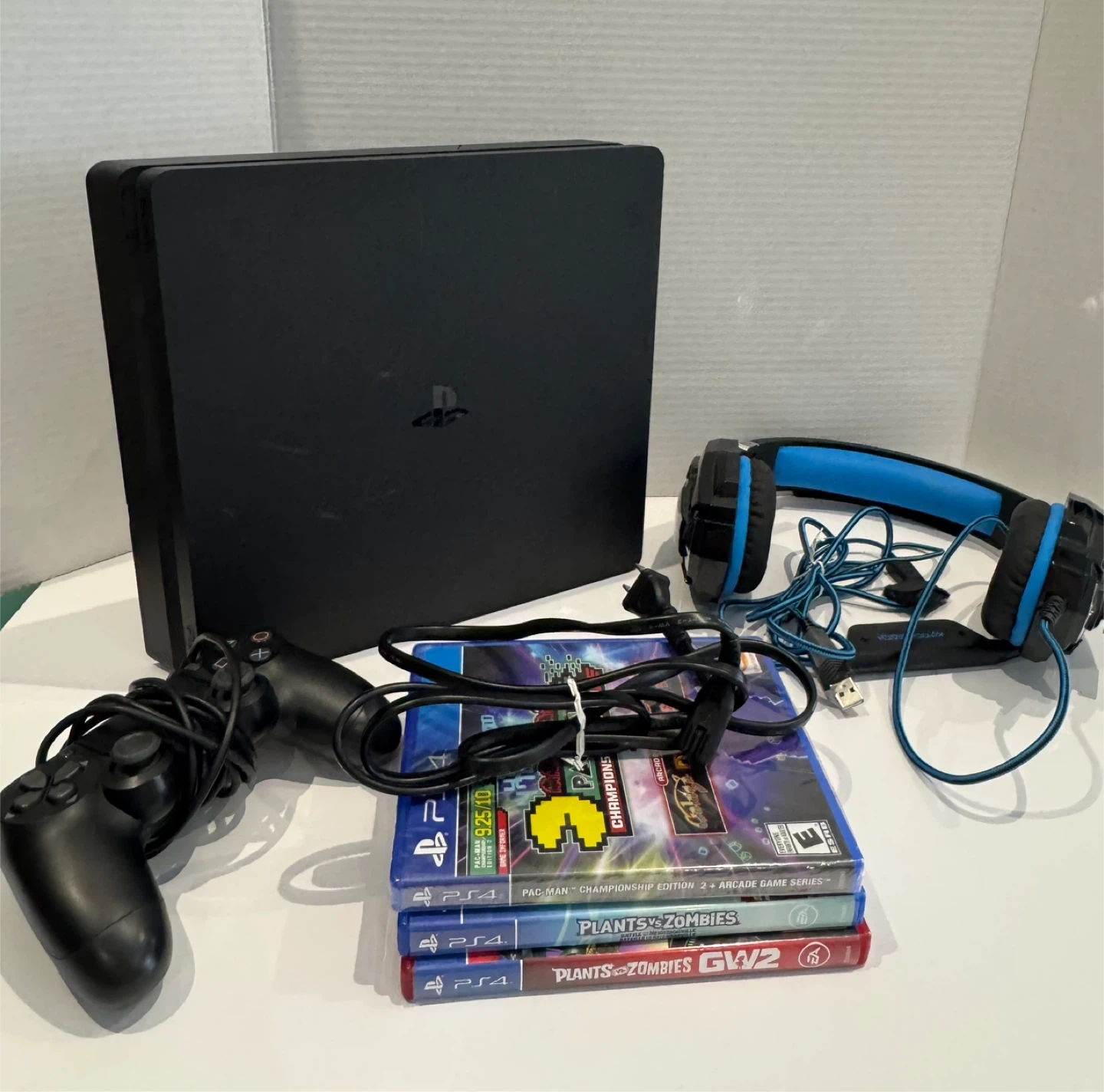 This bundle includes a PlayStation 4 Slim console, 1TB, a controller, a Kotion Each gaming headset, and three games: Pac-Man Championship Edition 2, Plants vs. Zombies: Battle for Neighborville, and Plants vs. Zombies: Garden Warfare 2. It's all ready for some serious gaming fun!