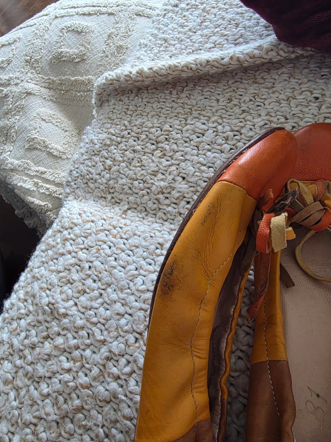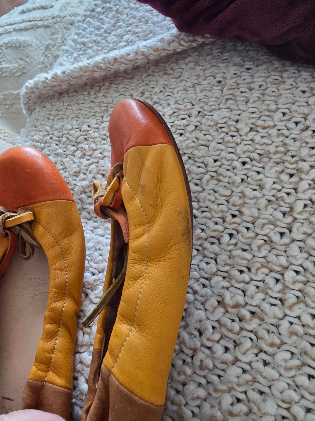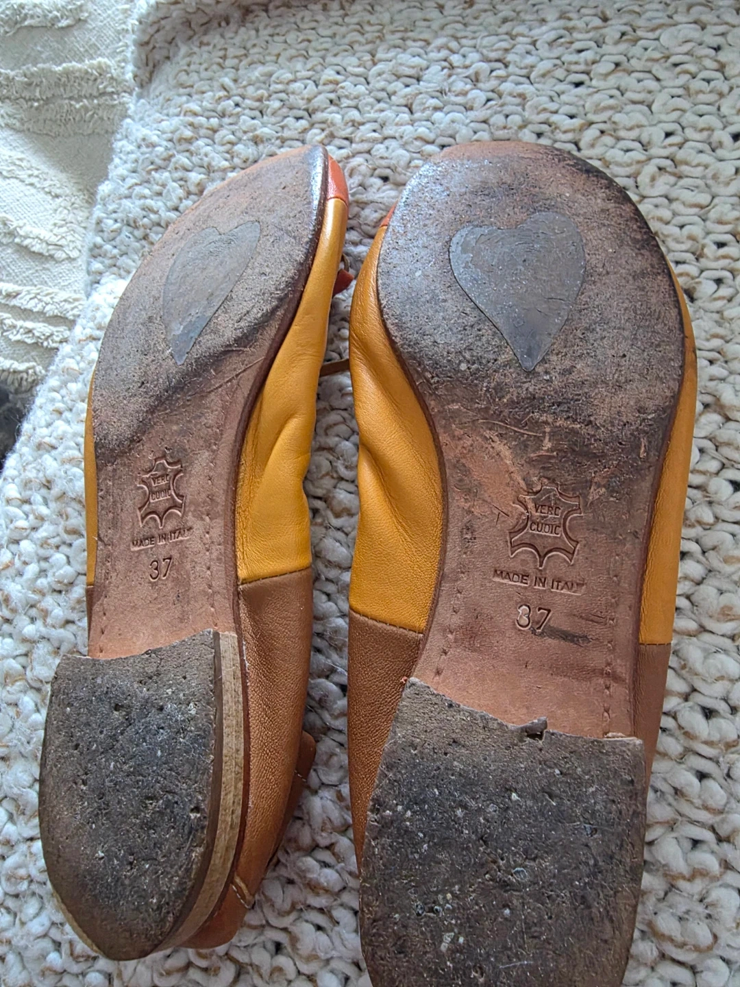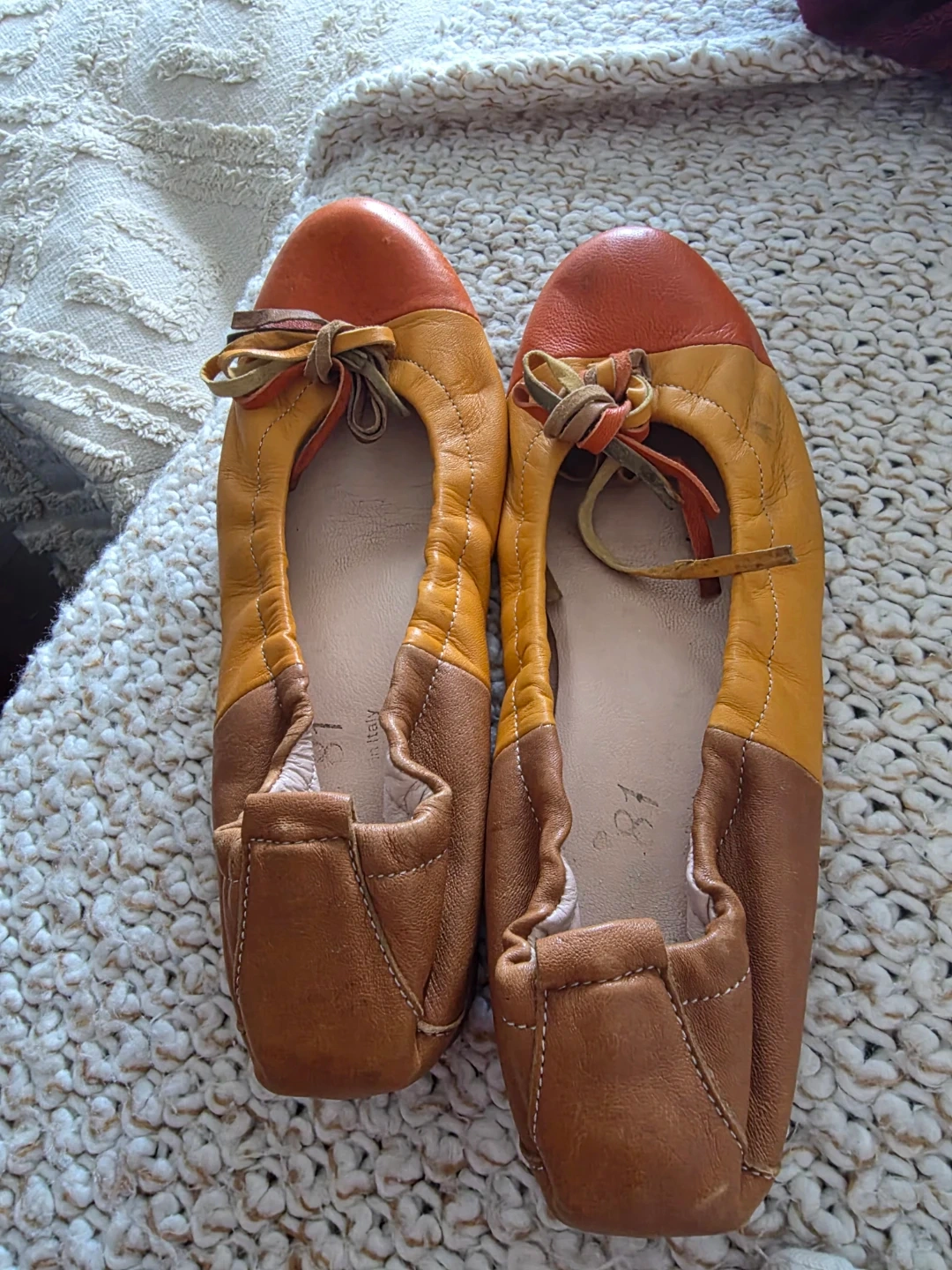 These are a pair of women's ballet flats. Made in Italy with genuine leather. They're a size 37 EU. The colour is a mix of orange and tan. Perfect for everyday wear!