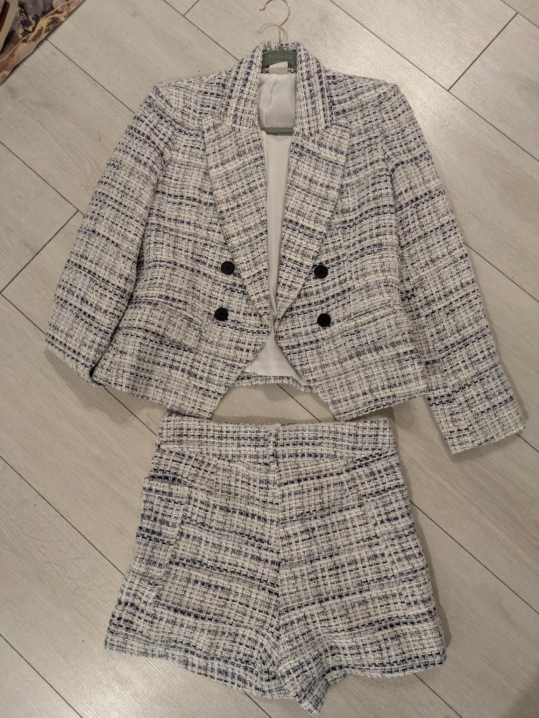 Stylish tweed blazer and matching shorts set. Features a double-breasted blazer with black buttons and tailored shorts. Great for a chic, put-together look!